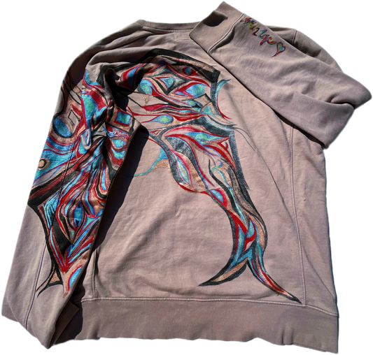 • Hand-painted using eco-conscious materials like thrifted and sustainable fabrics.