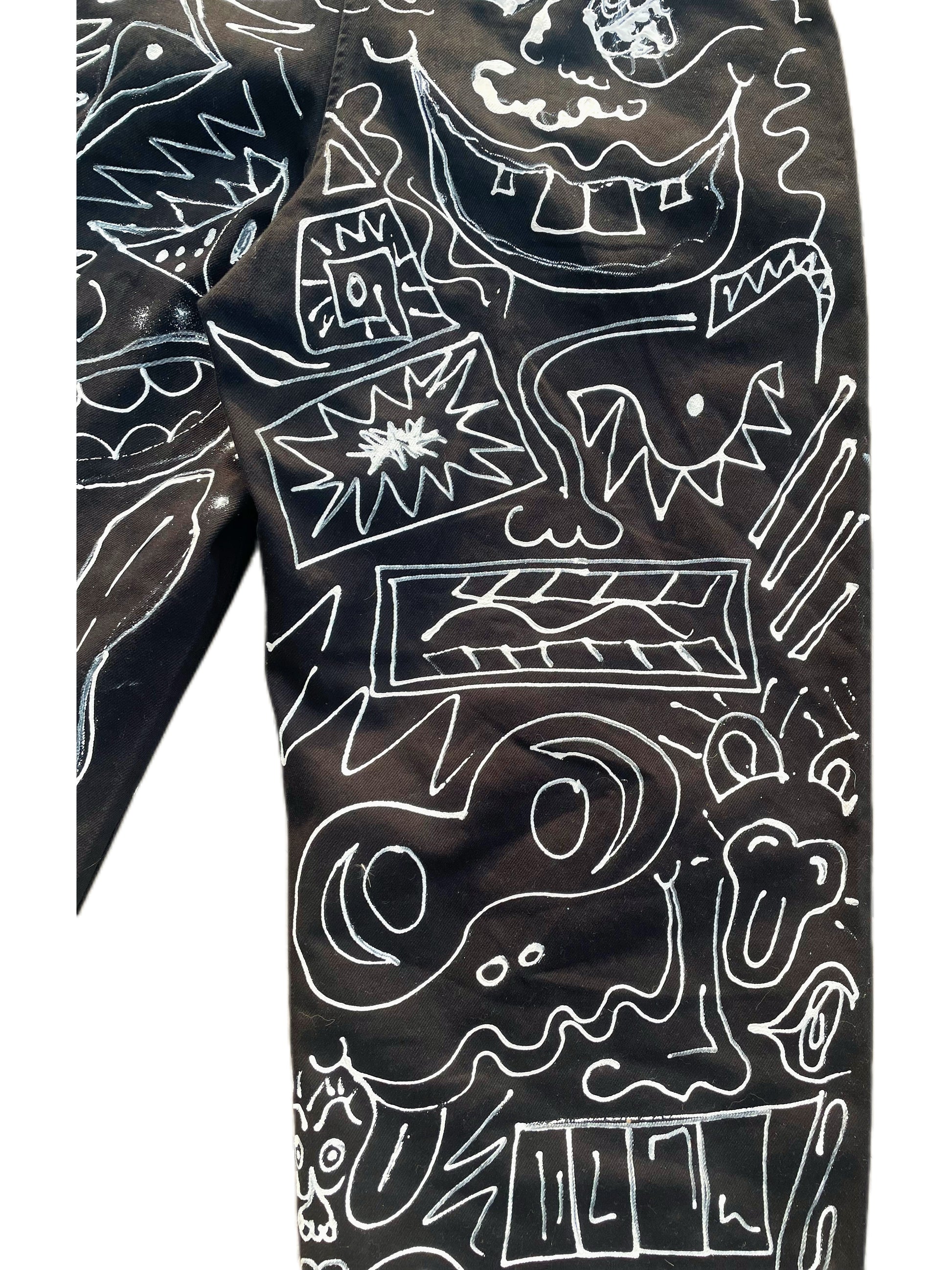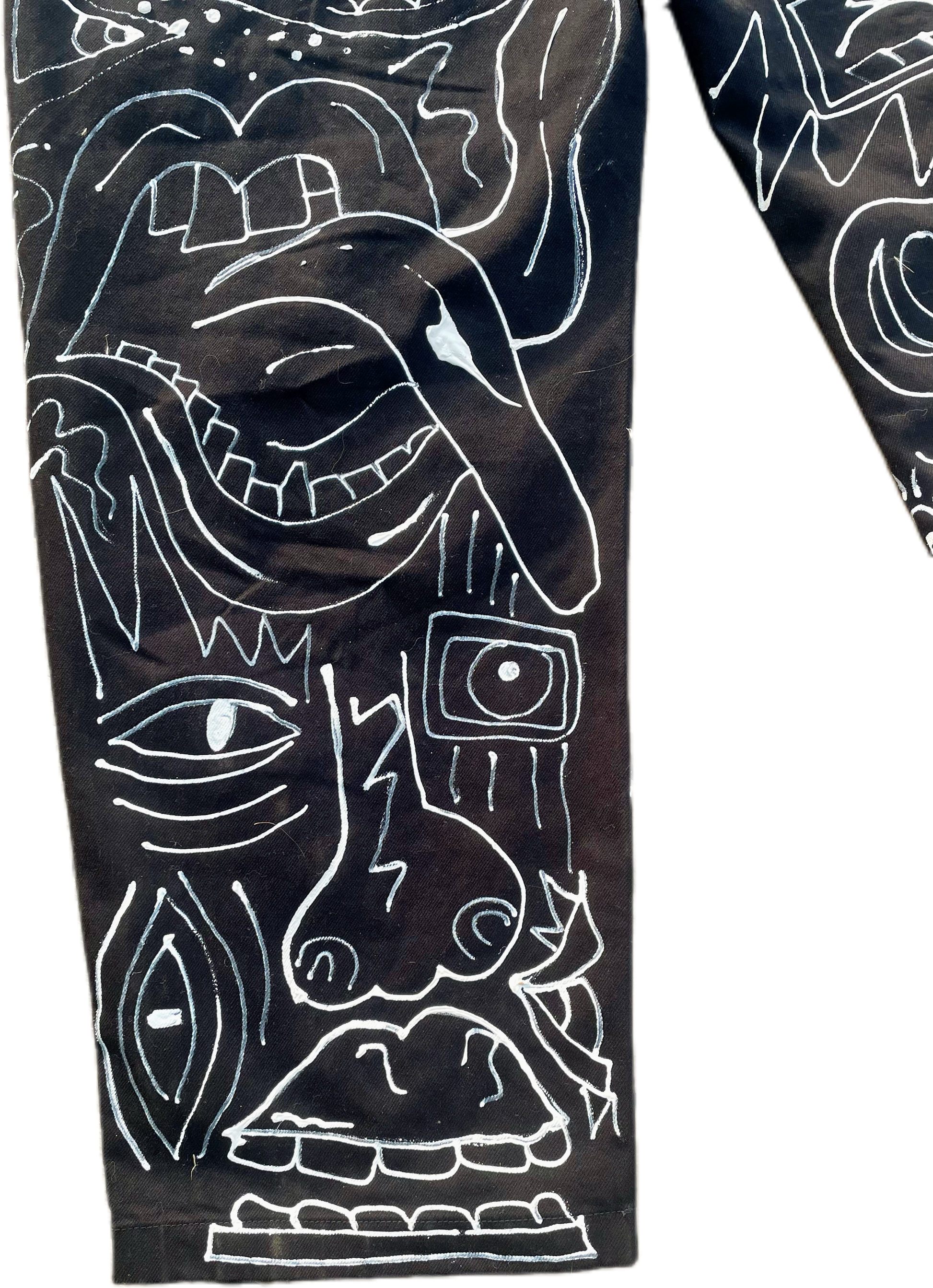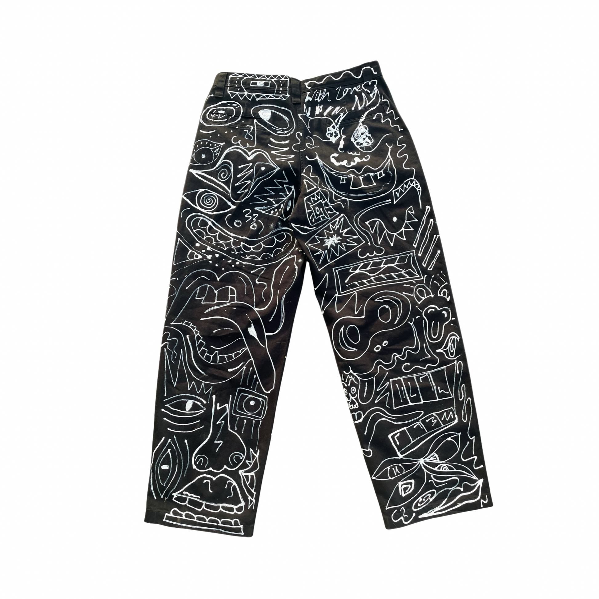 Step into a world of bold creativity with these hand-painted black denim pants. Featuring striking white abstract designs that intertwine faces, eyes, and shapes, each piece tells its own chaotic story. Every line is painted with intention, creating wearable art that stands out from the crowd. These pants are a one-of-a-kind addition to any wardrobe, perfect for those who embrace their individuality and love showcasing their unique style. Upcycled with care, these eco-conscious pants offer both sustainability and bold artistic expression.