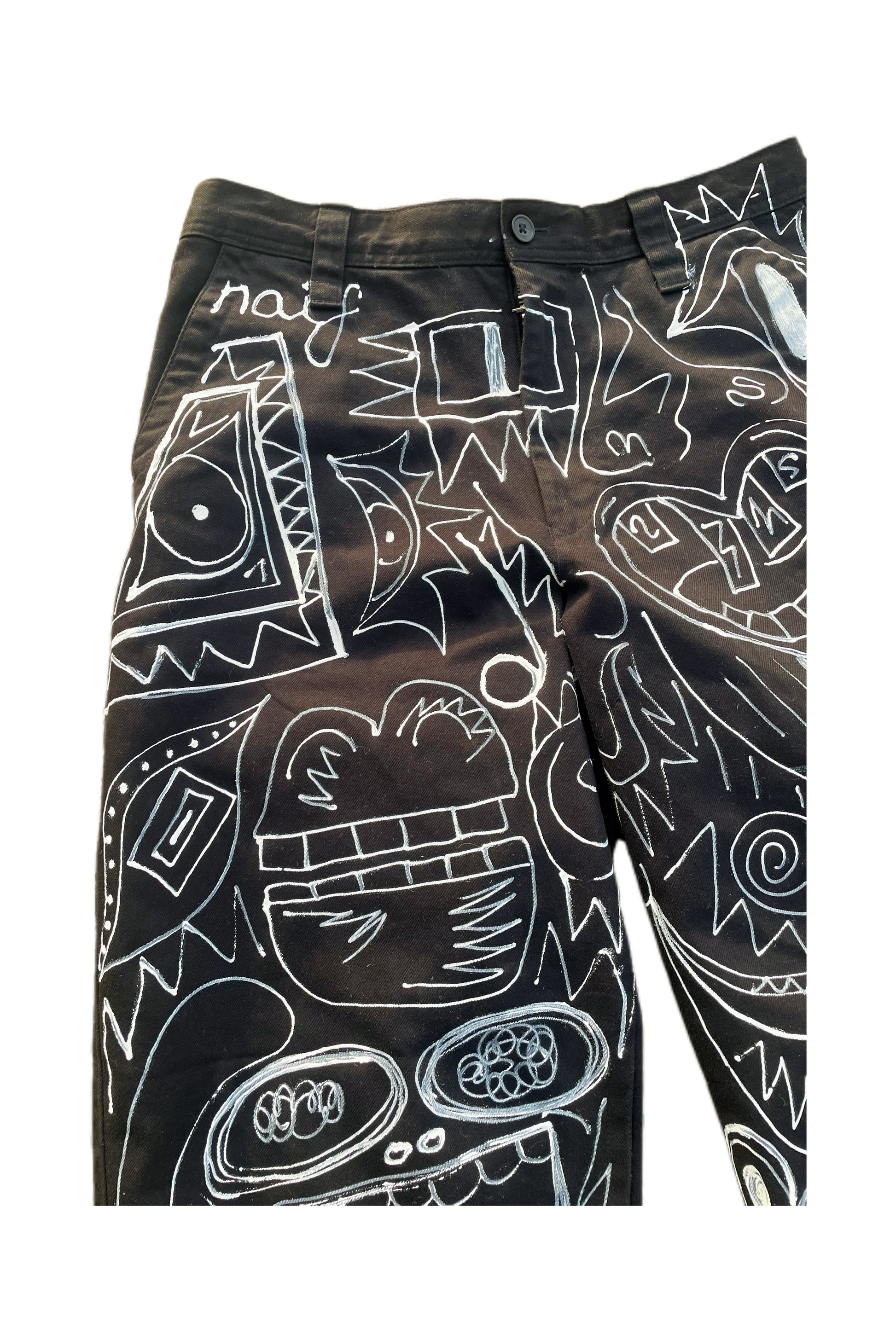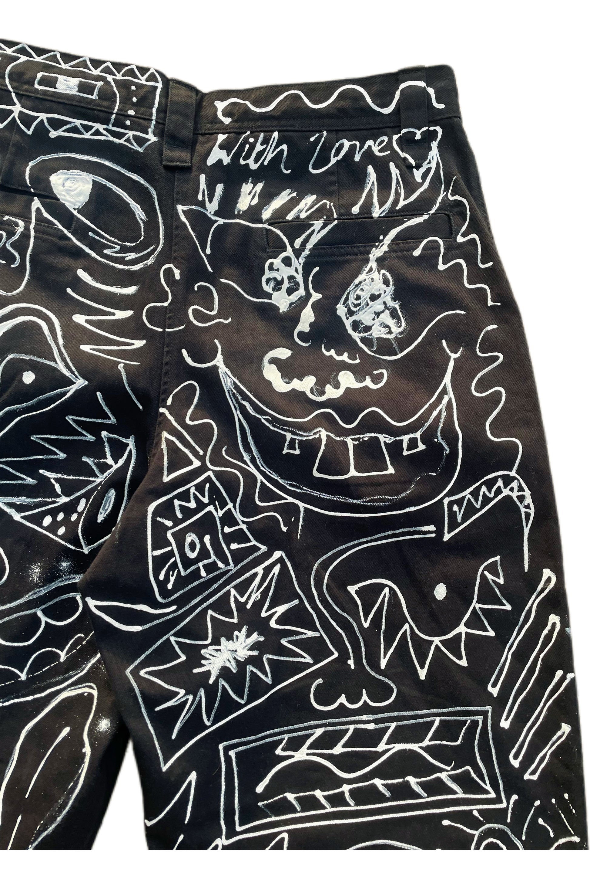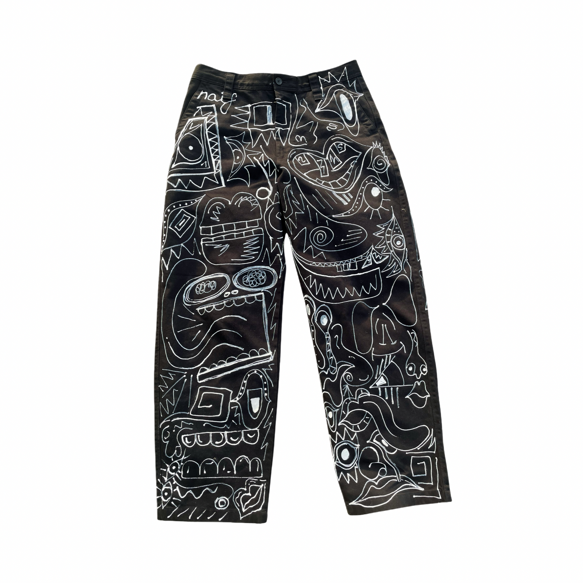 Step into a world of bold creativity with these hand-painted black denim pants. Featuring striking white abstract designs that intertwine faces, eyes, and shapes, each piece tells its own chaotic story. Every line is painted with intention, creating wearable art that stands out from the crowd. These pants are a one-of-a-kind addition to any wardrobe, perfect for those who embrace their individuality and love showcasing their unique style. Upcycled with care, these eco-conscious pants offer both sustainability and bold artistic expression.