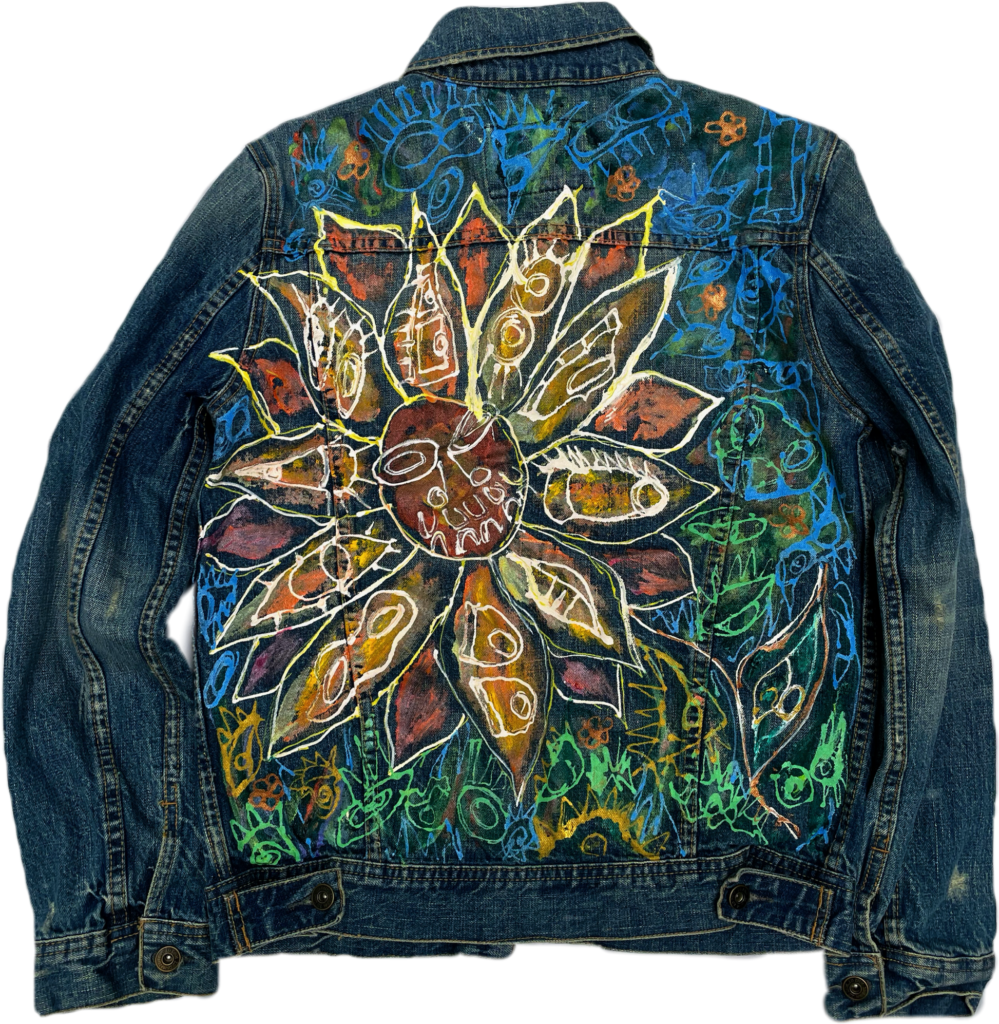 One-of-a-kind hand-painted denim jacket featuring an explosive floral centerpiece that radiates across the entire back. Vibrant blues, oranges, greens, and golds burst outward in layered petals, each filled with intricate details and patterns.
