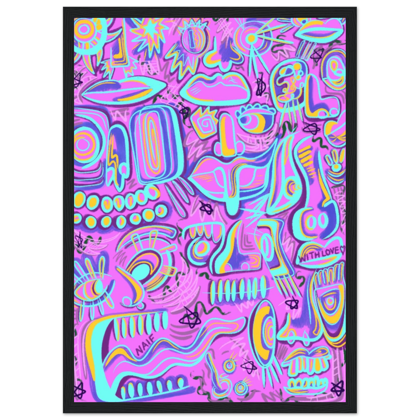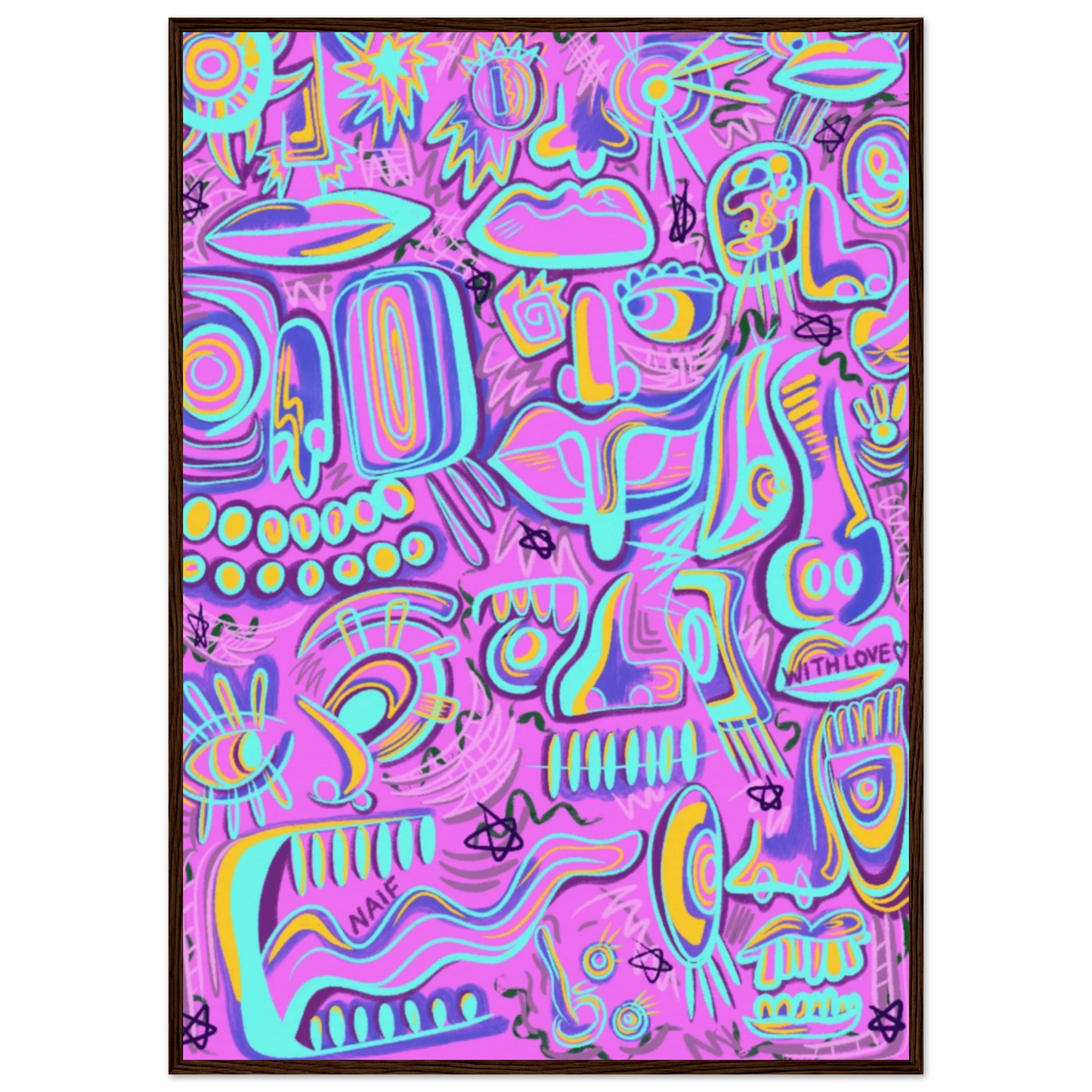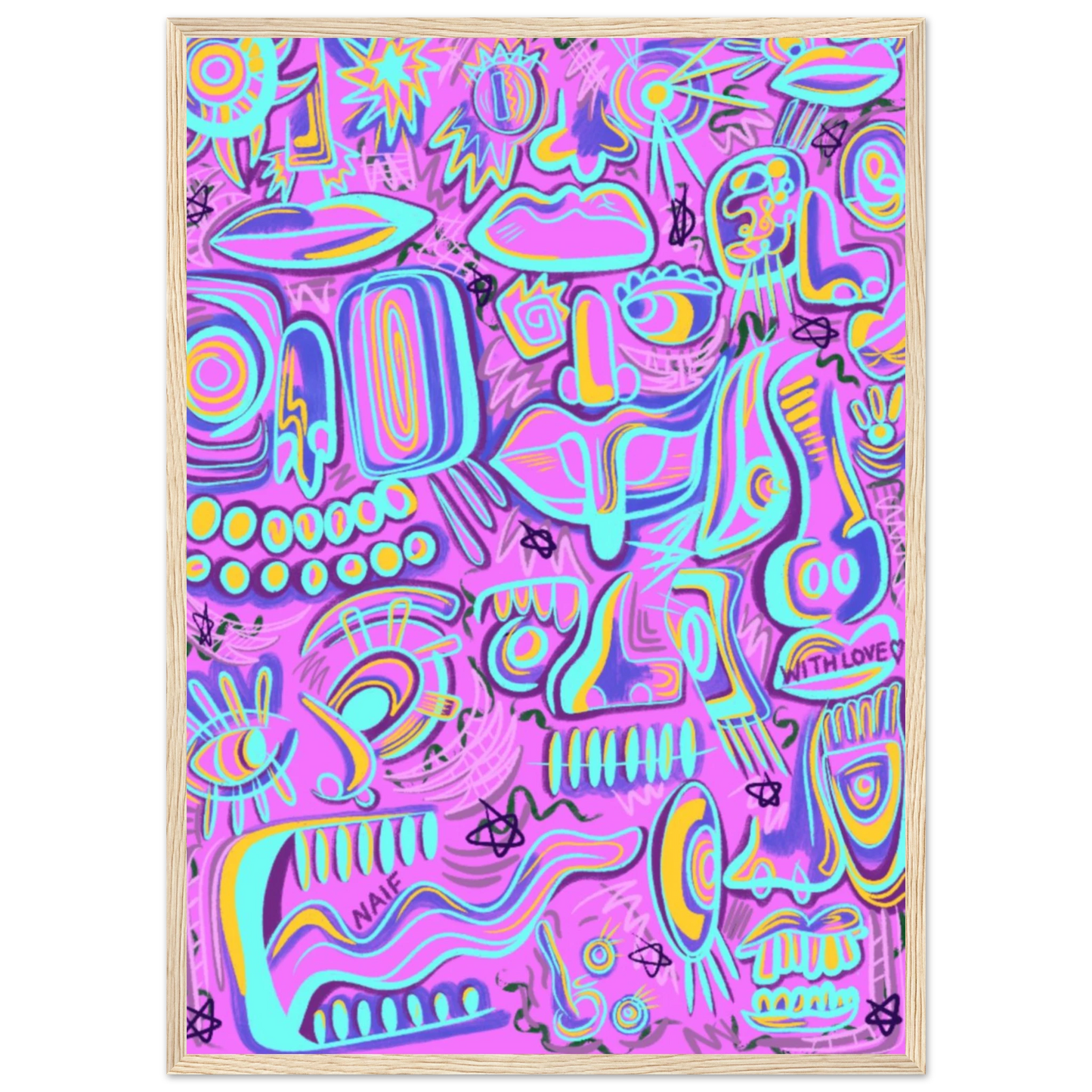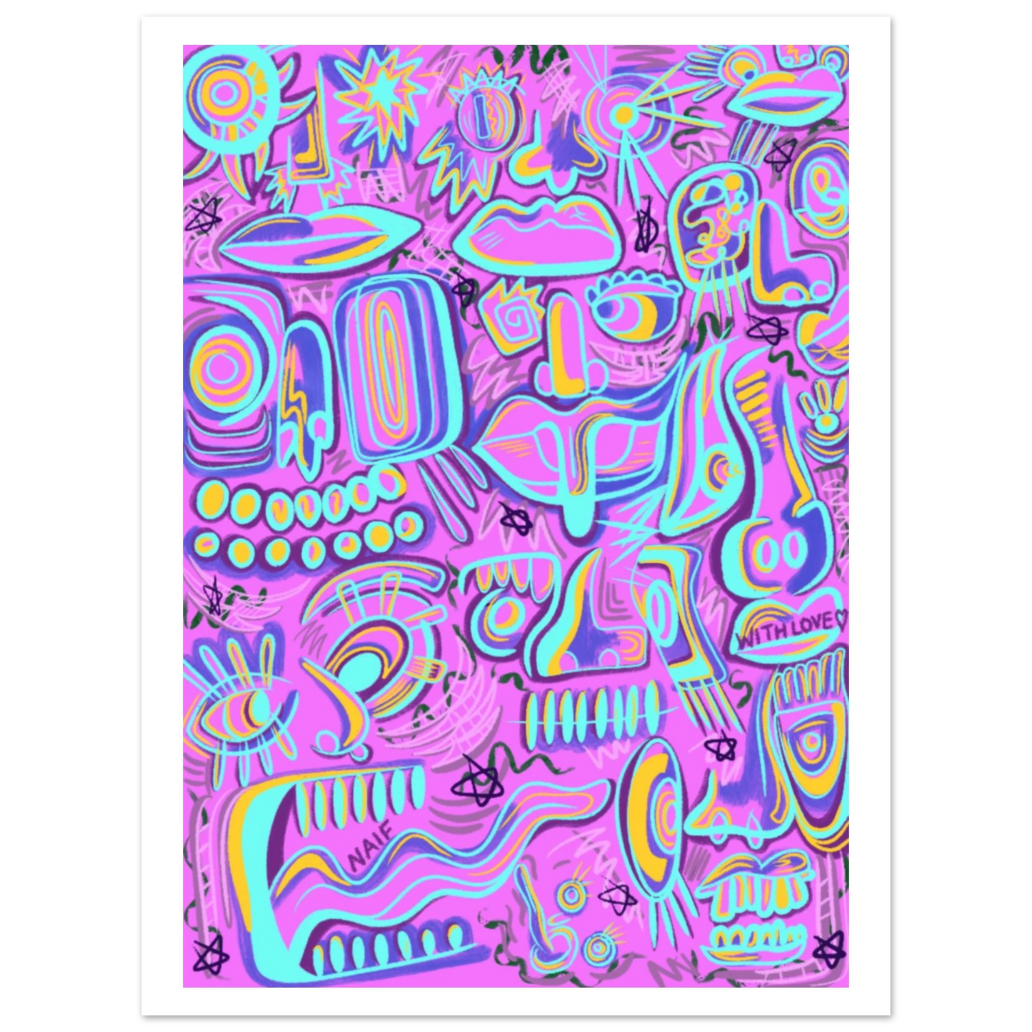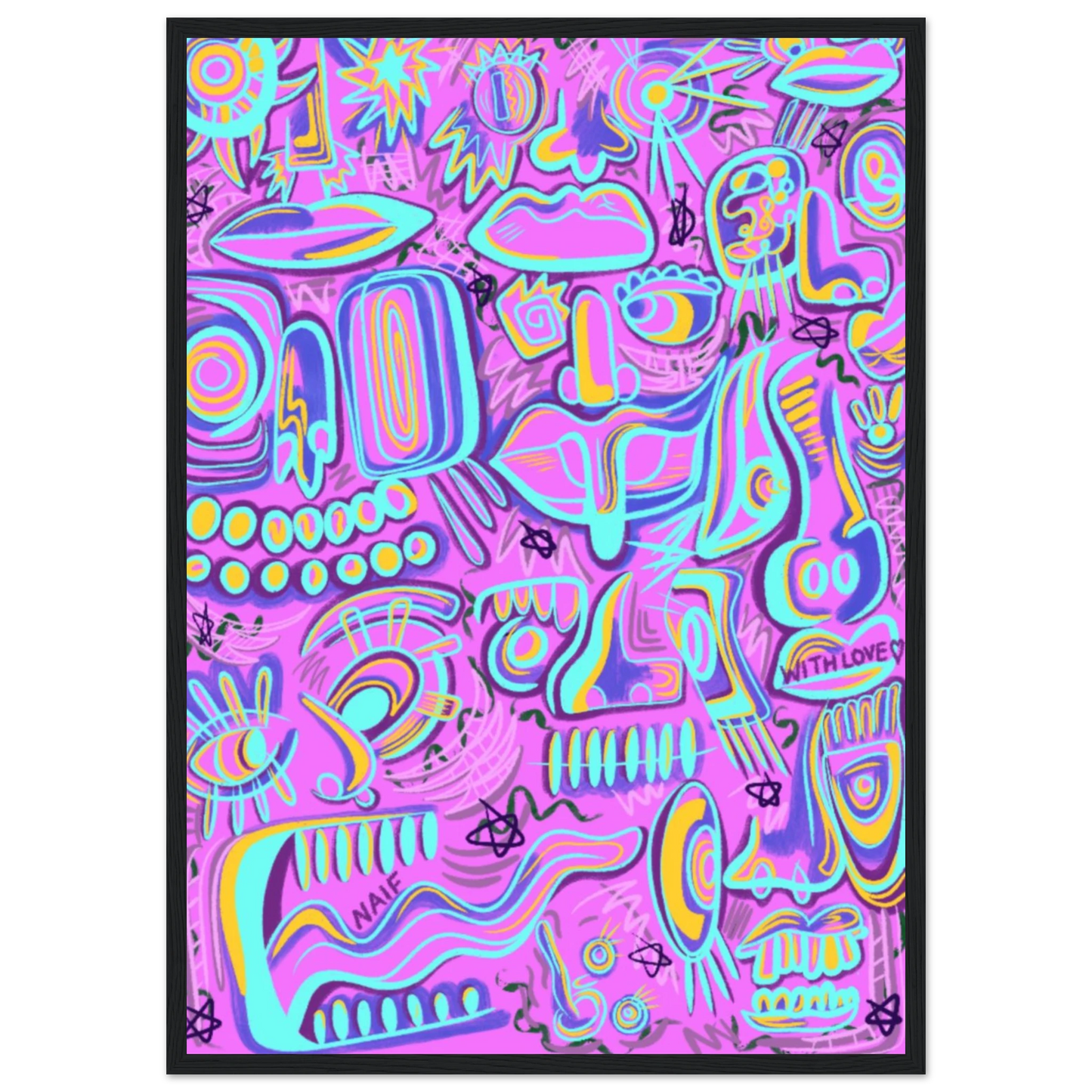 A bold statement piece that brings electric energy to any space. This vibrant abstract artwork features a striking hot pink palette with electric cyan accents, creating a dynamic composition of swirling forms and playful patterns. The piece captures a sense of movement and rhythm that draws the eye and sparks conversation.