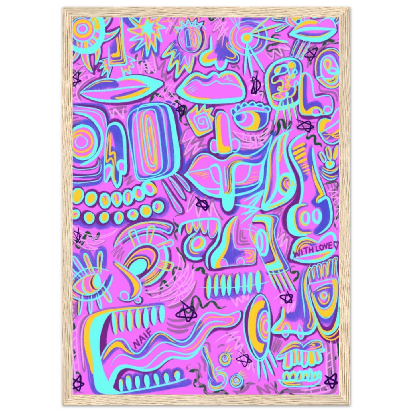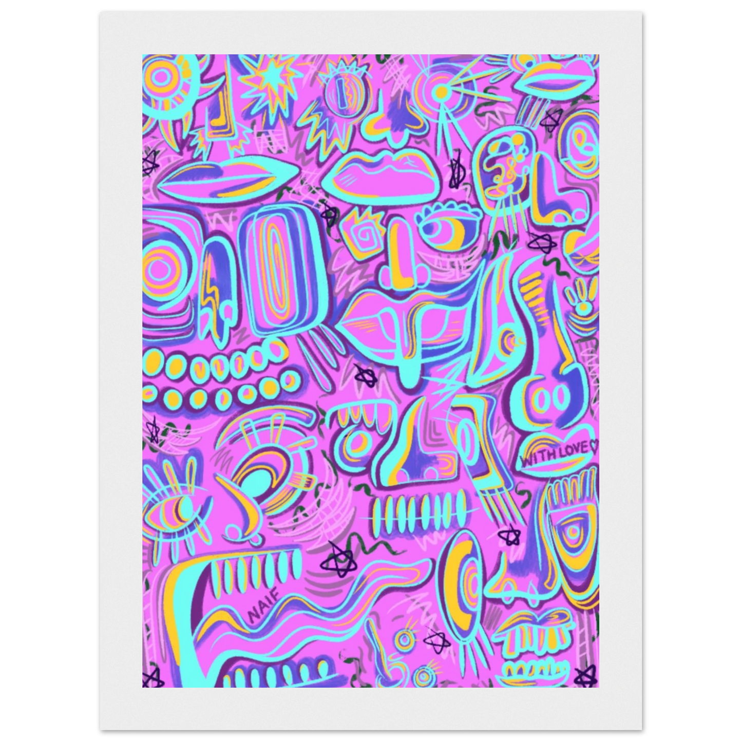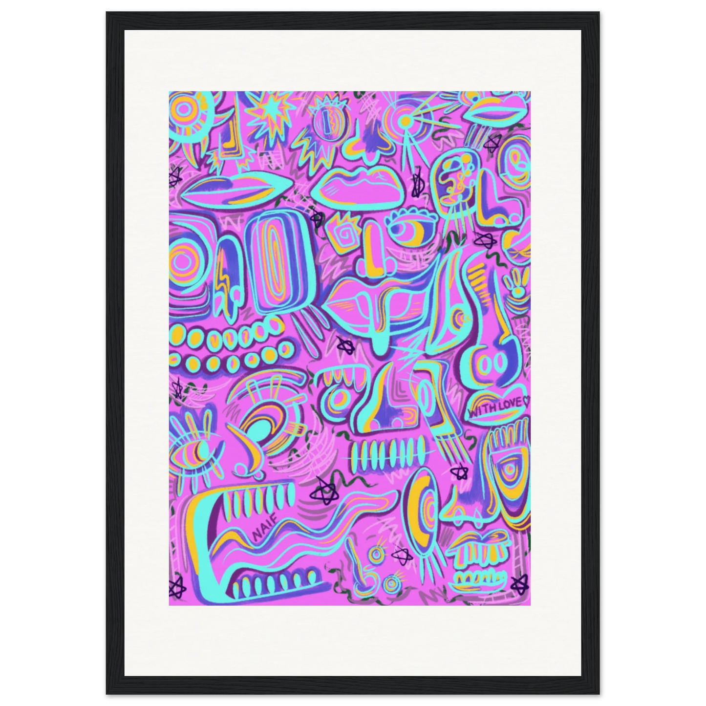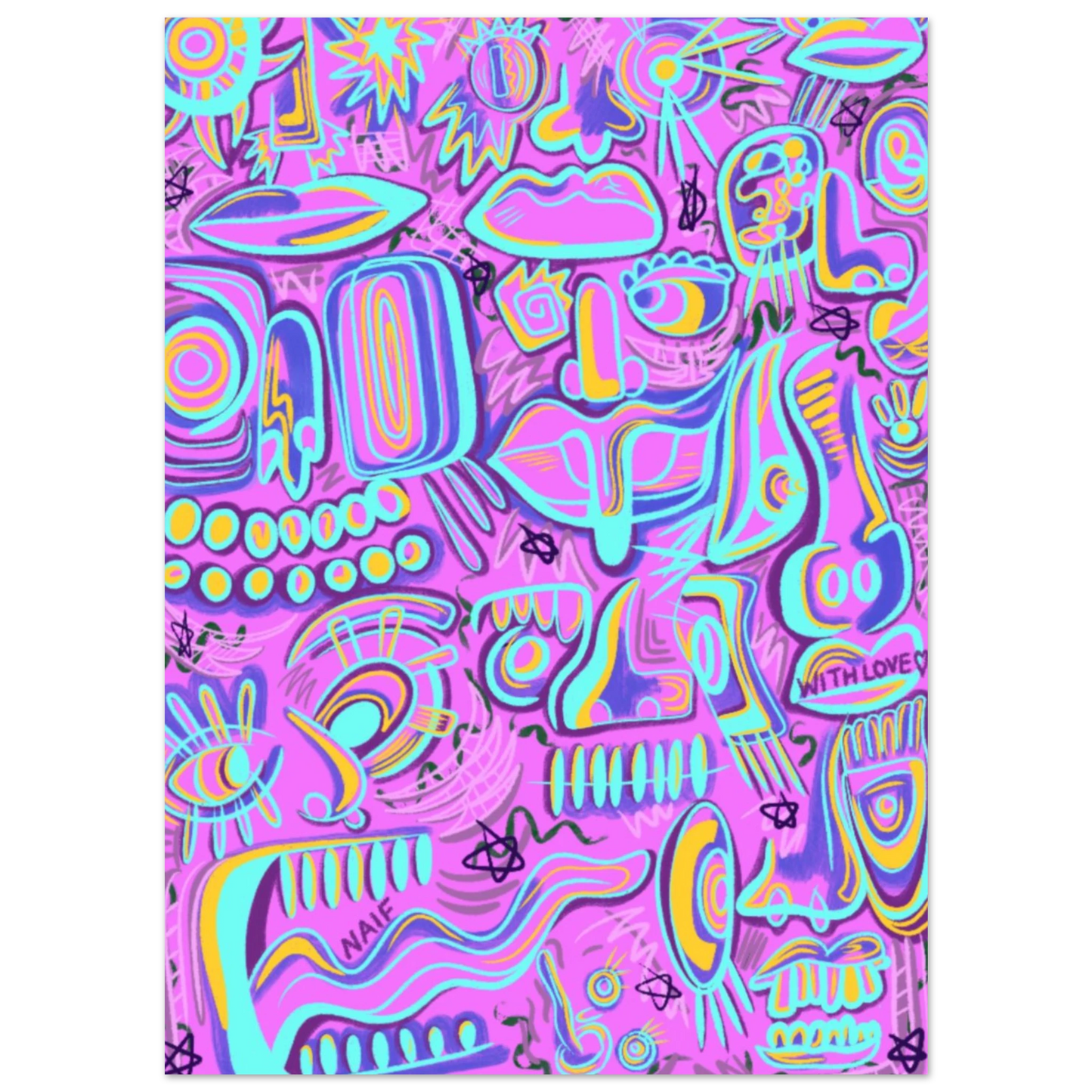 A bold statement piece that brings electric energy to any space. This vibrant abstract artwork features a striking hot pink palette with electric cyan accents, creating a dynamic composition of swirling forms and playful patterns. The piece captures a sense of movement and rhythm that draws the eye and sparks conversation.