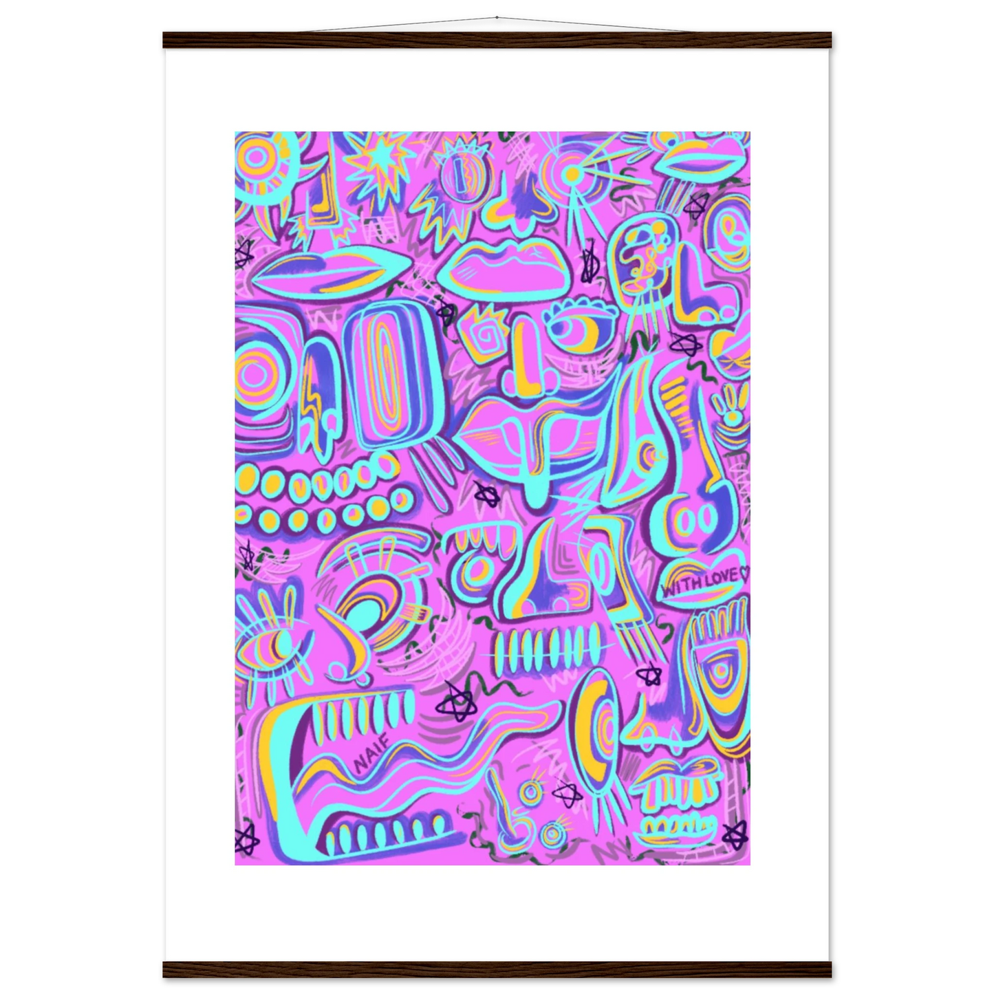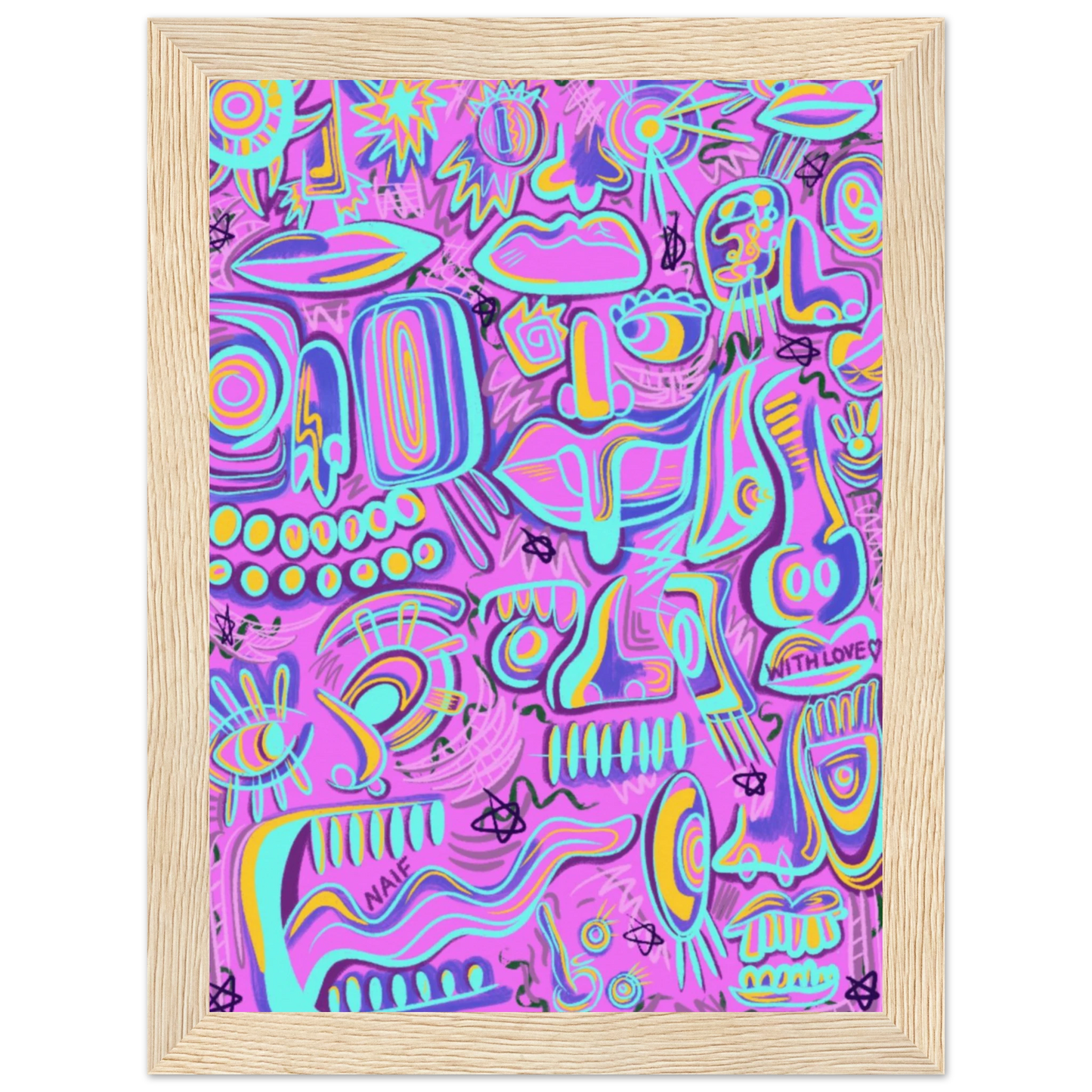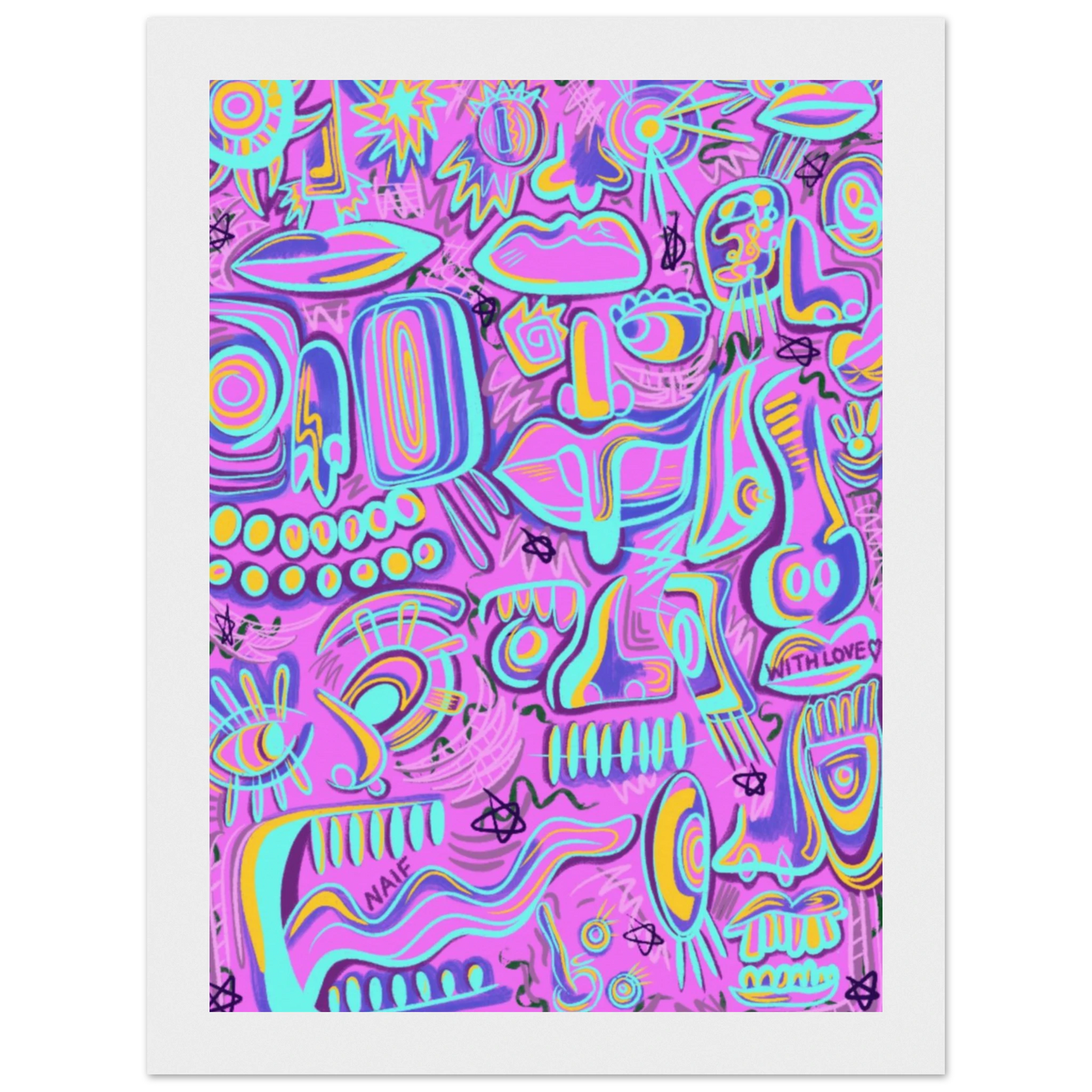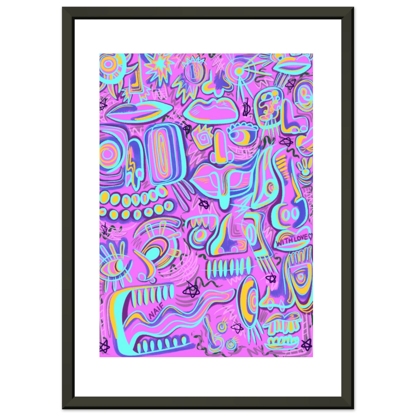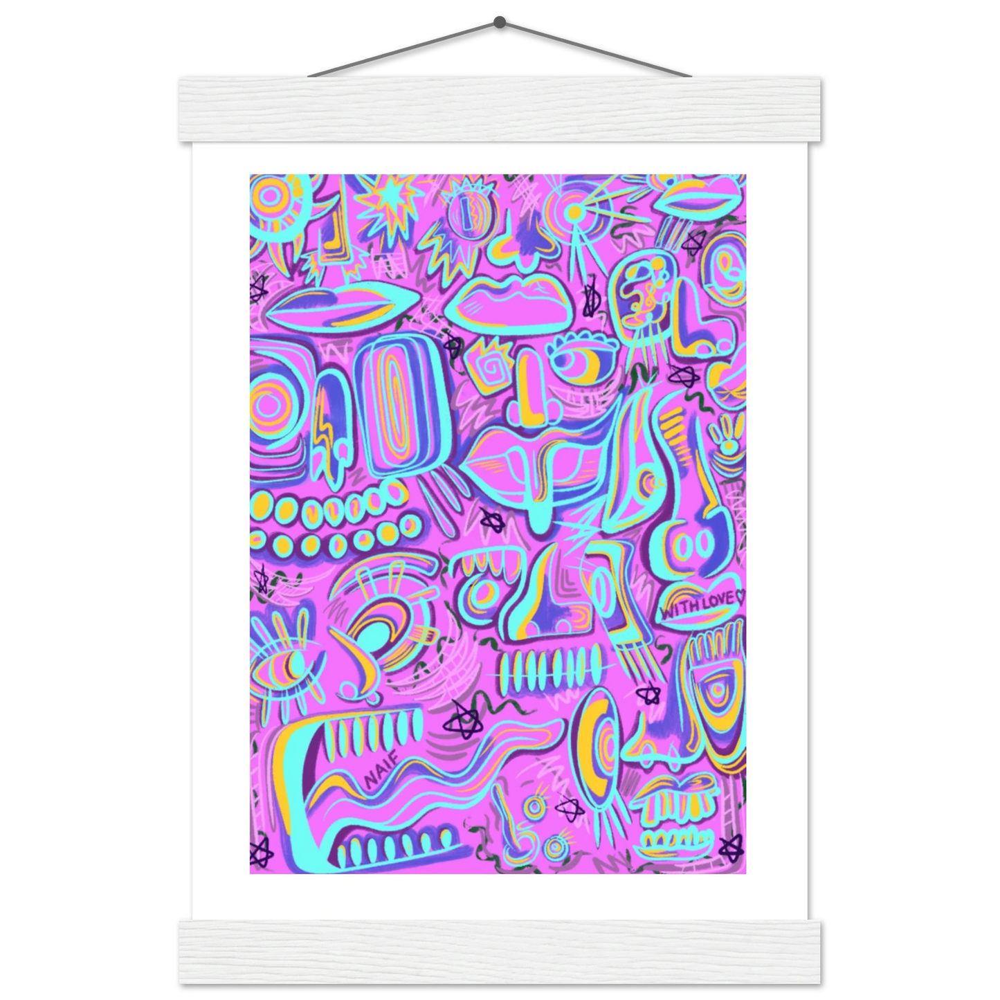 A bold statement piece that brings electric energy to any space. This vibrant abstract artwork features a striking hot pink palette with electric cyan accents, creating a dynamic composition of swirling forms and playful patterns. The piece captures a sense of movement and rhythm that draws the eye and sparks conversation.