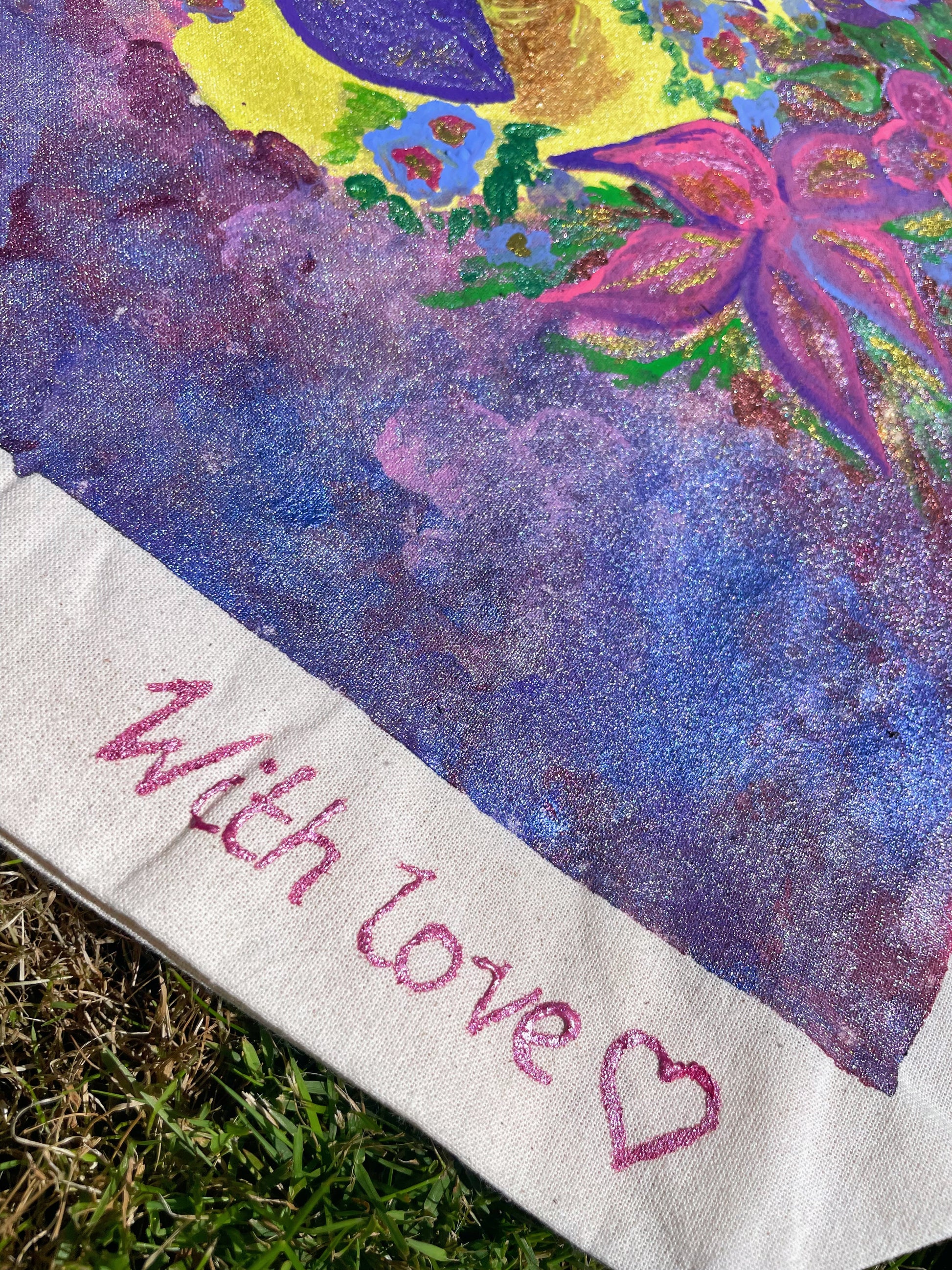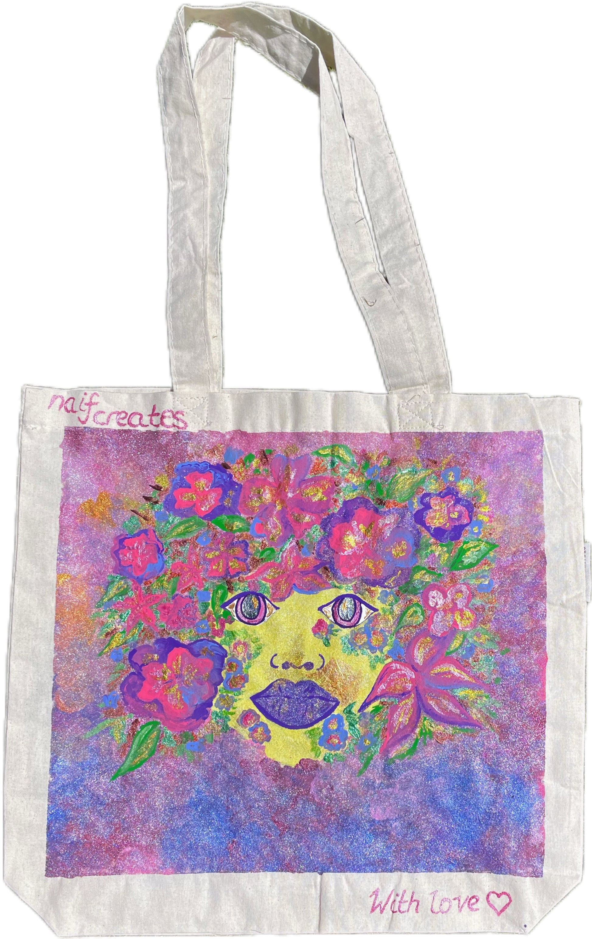 Perfect for everyday use, shopping, or adding a pop of art to your outfit, this durable canvas tote is signed and inscribed with “naifcreates” and “With love ♡,” adding a personal touch.