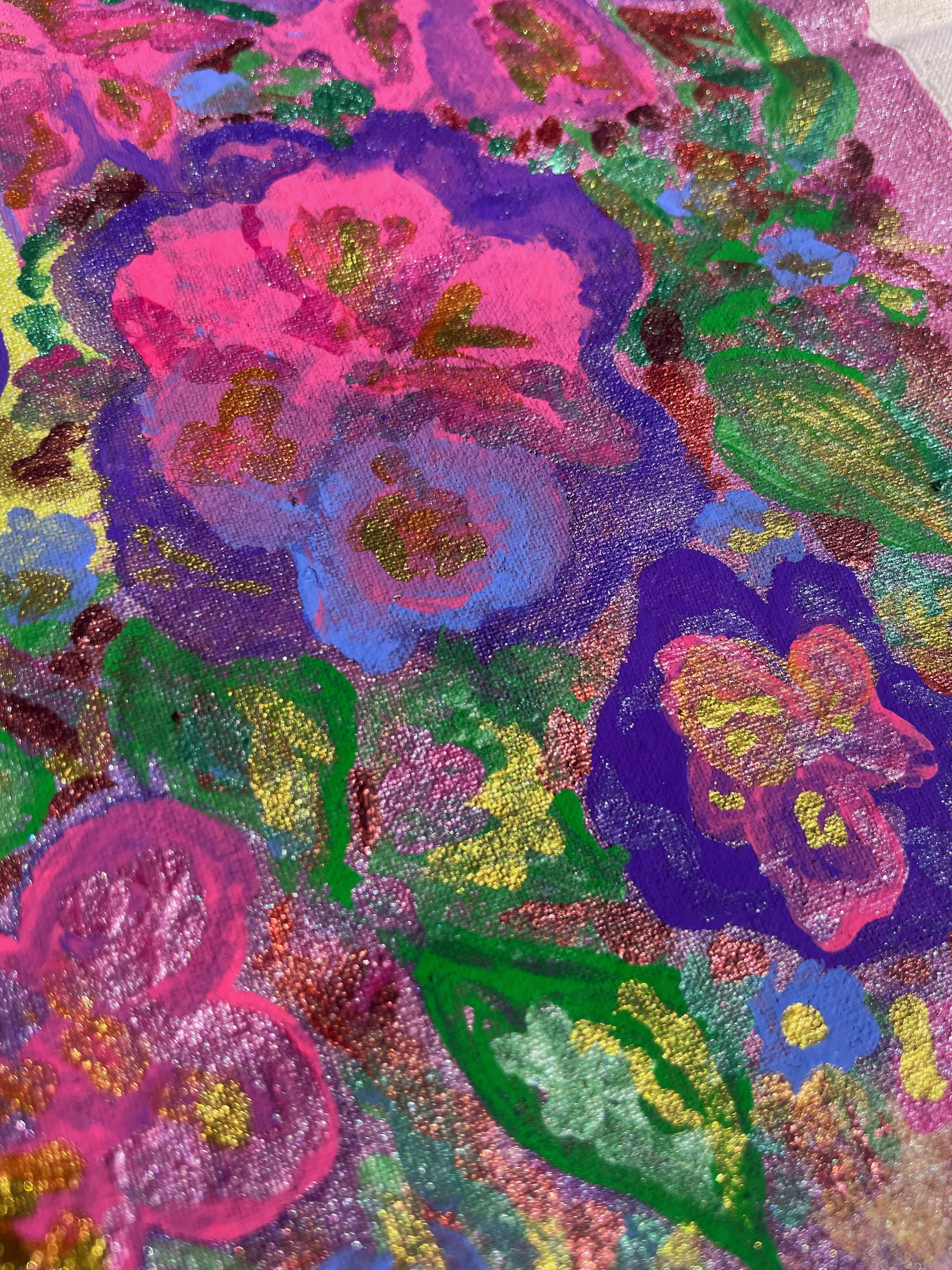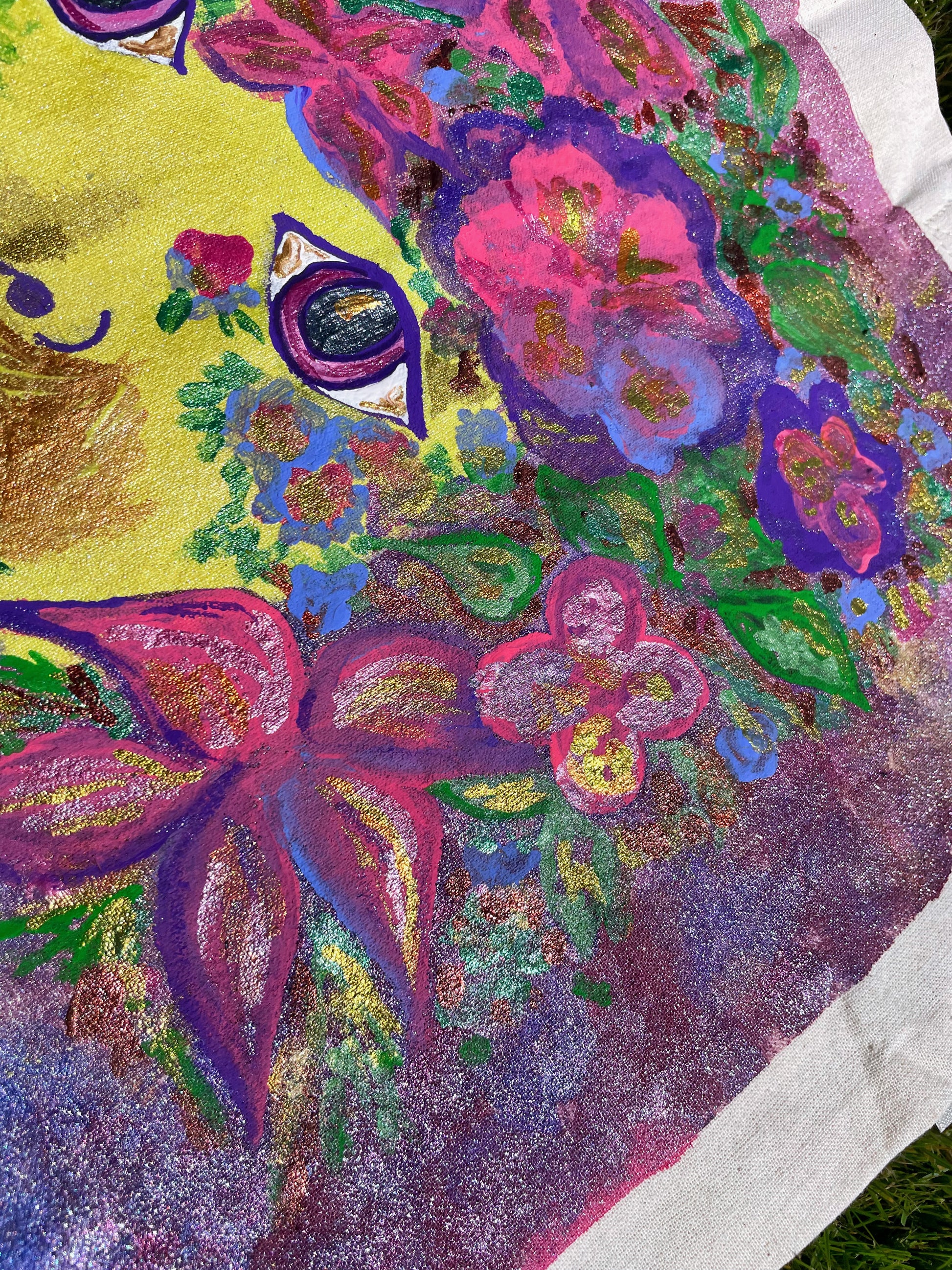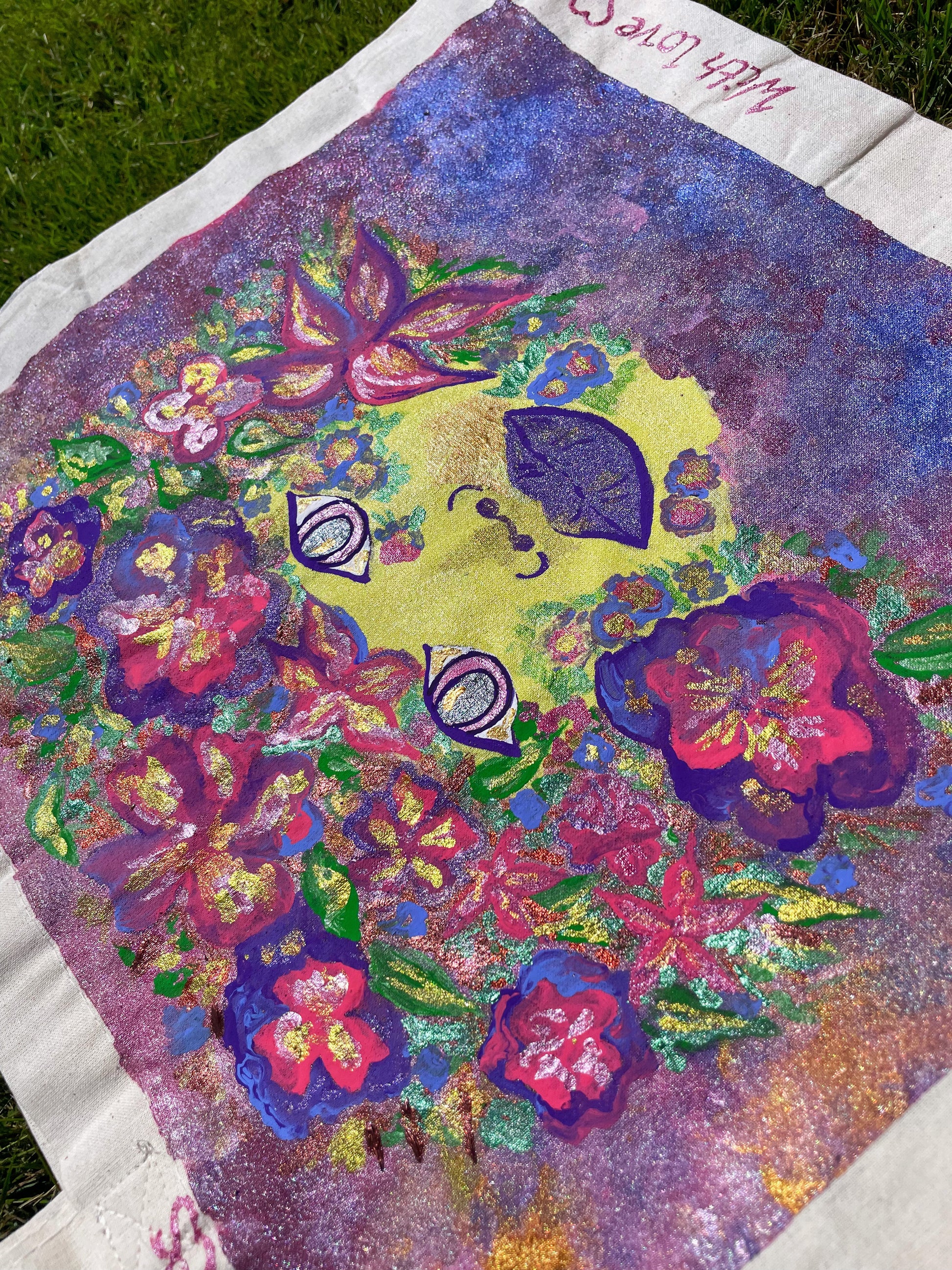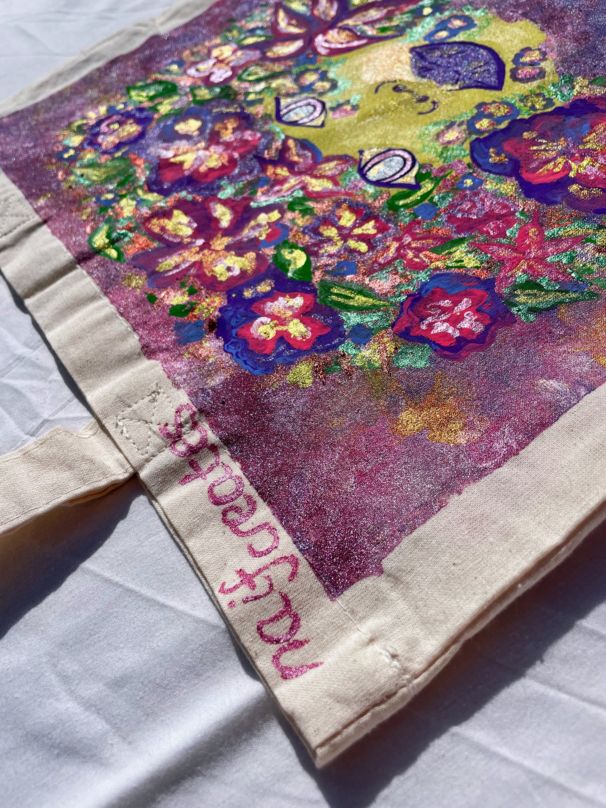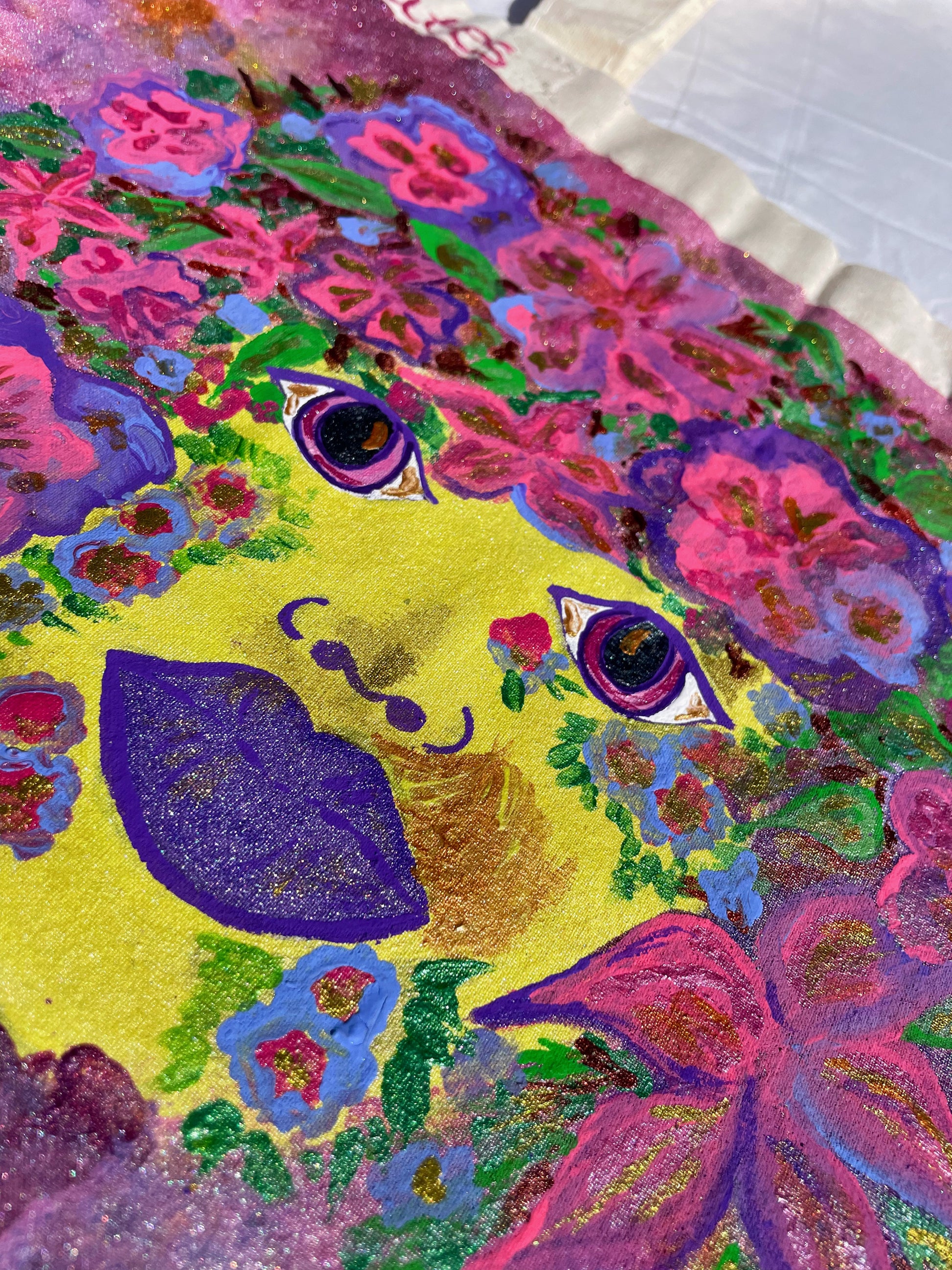 Elevate your style with this eco-conscious, hand-painted tote bag by NaifCreates. Crafted from thrifted cotton, this unique piece blends sustainability with art, featuring a whimsical face surrounded by vibrant, colorful flowers. The design bursts with energy, blending pinks, purples, greens, and golds into a captivating display.