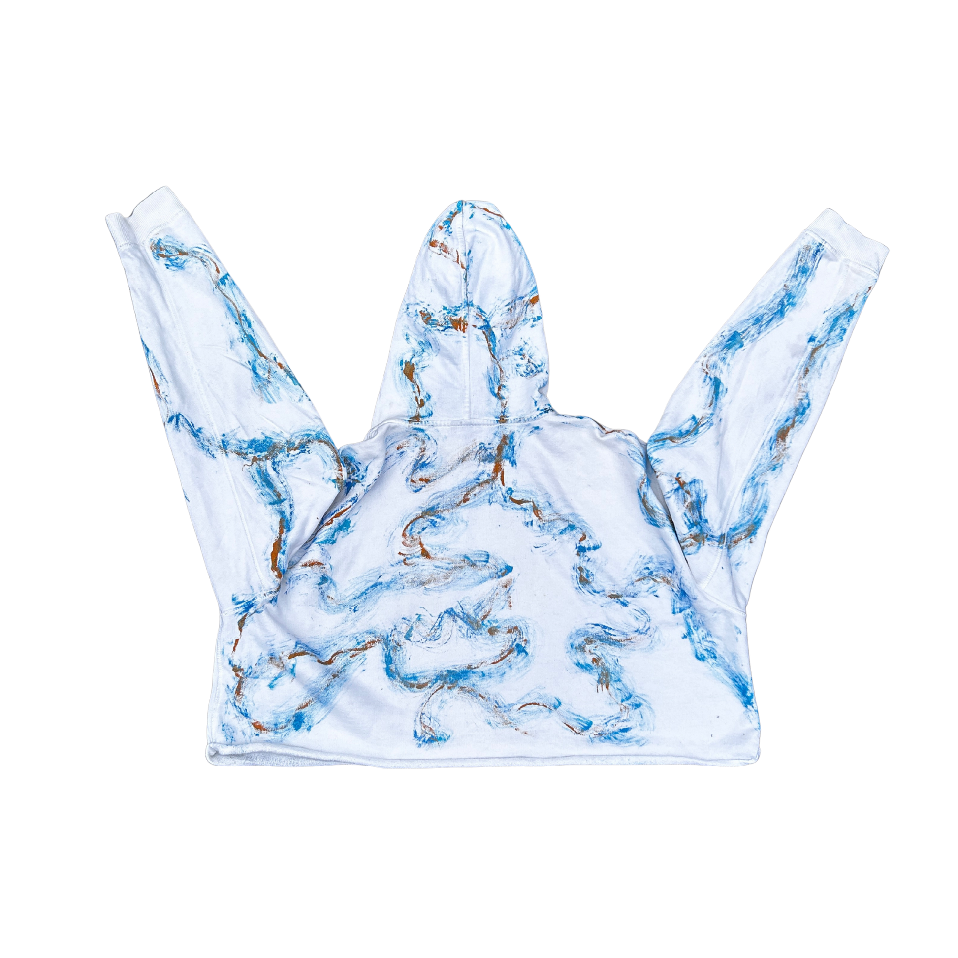 Light blue cropped hoodie with flowing water patterns painted across the entire piece. Blue and brown marbled waves cover the fabric, with "FROM THE RIVER TO THE SEA" painted in gold/yellow letters on the back. The water design wraps around the sleeves and hood.