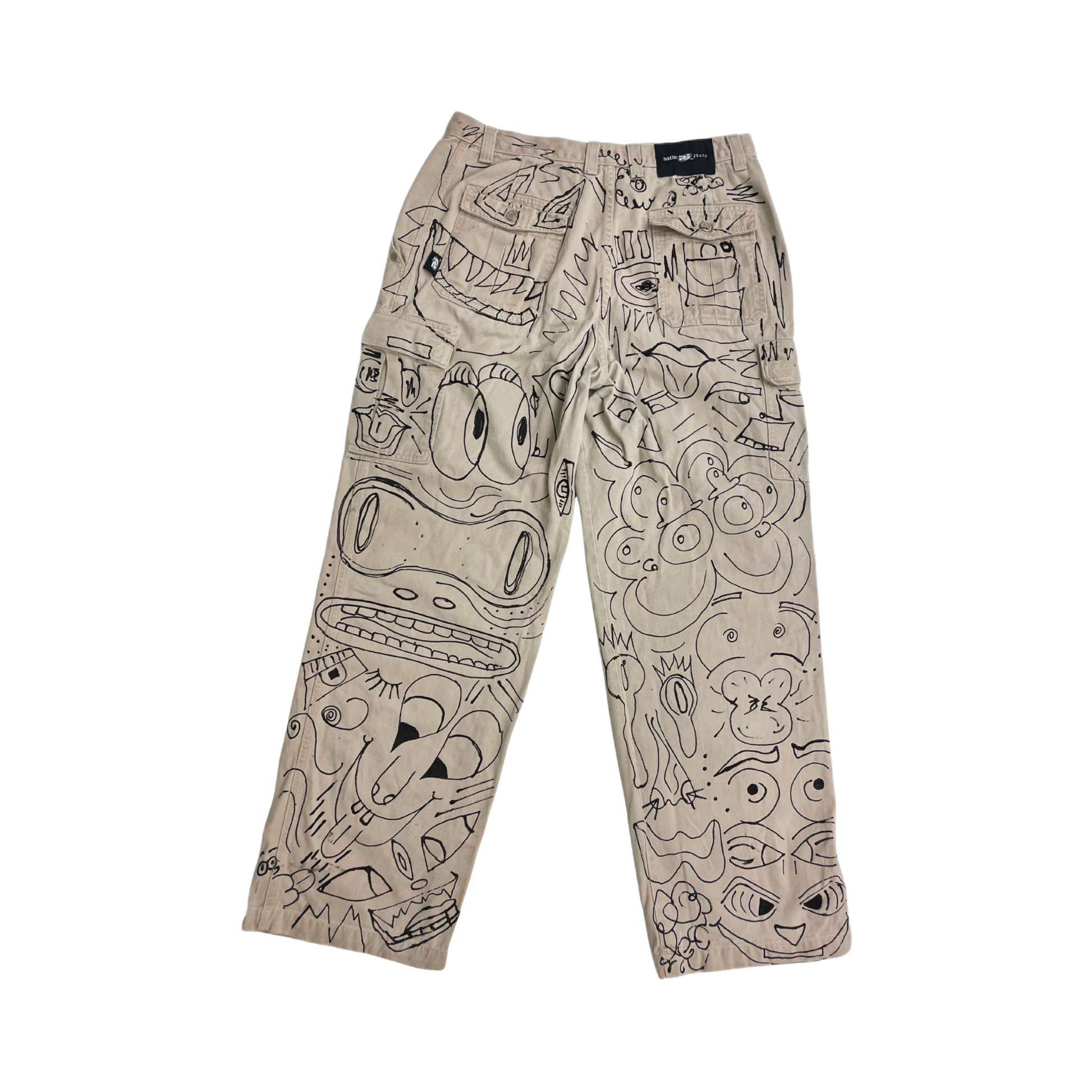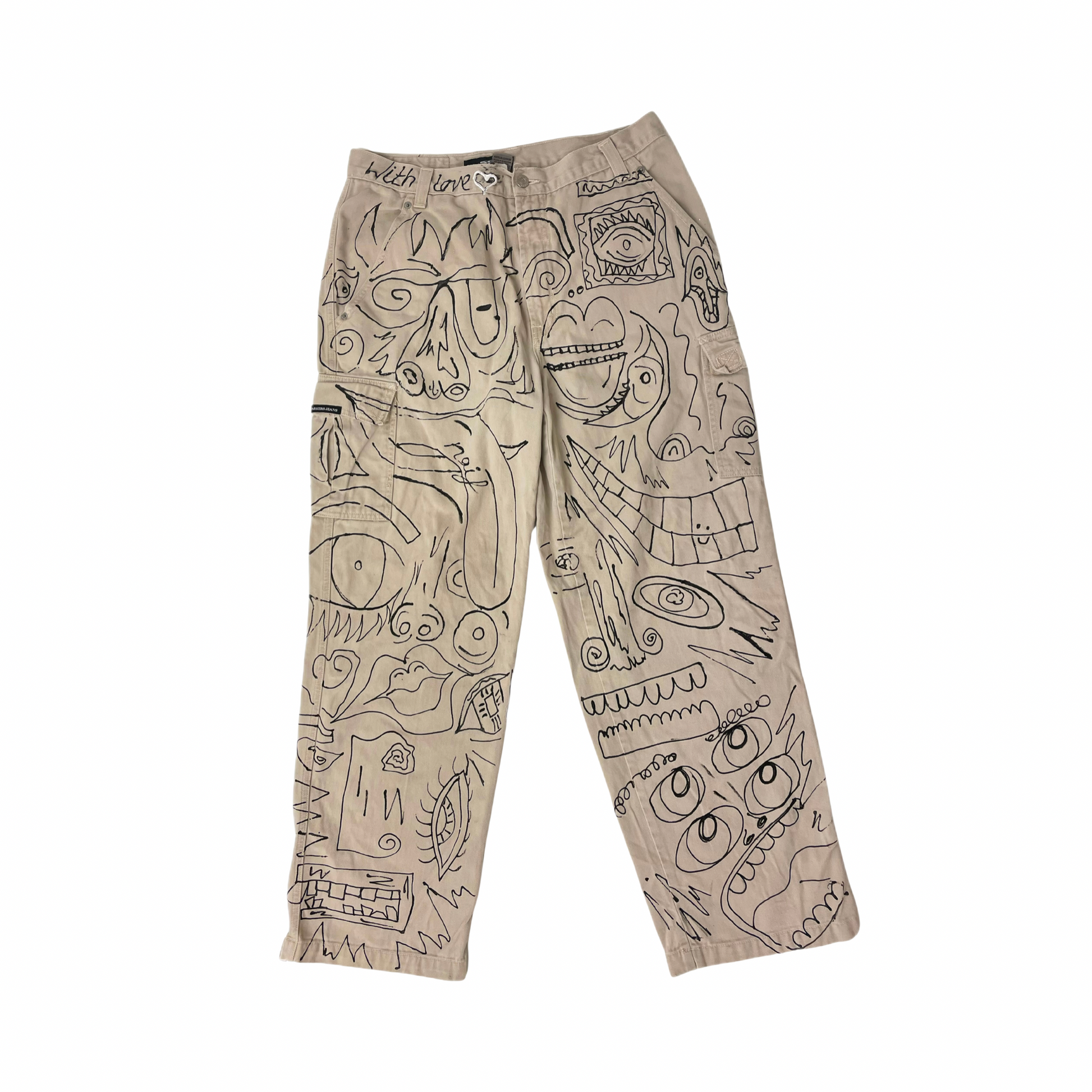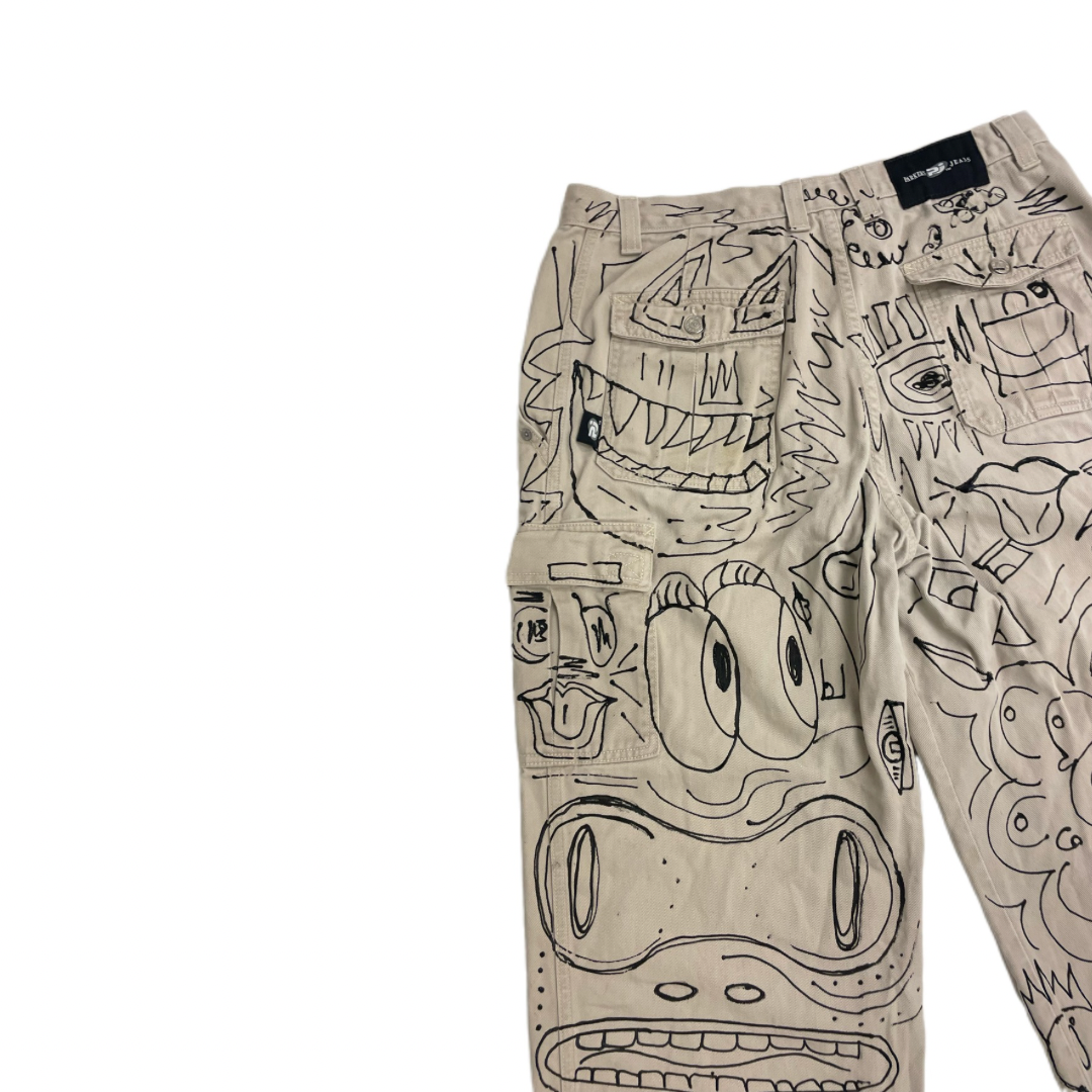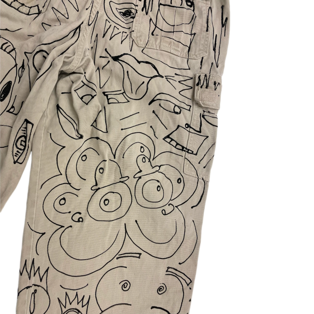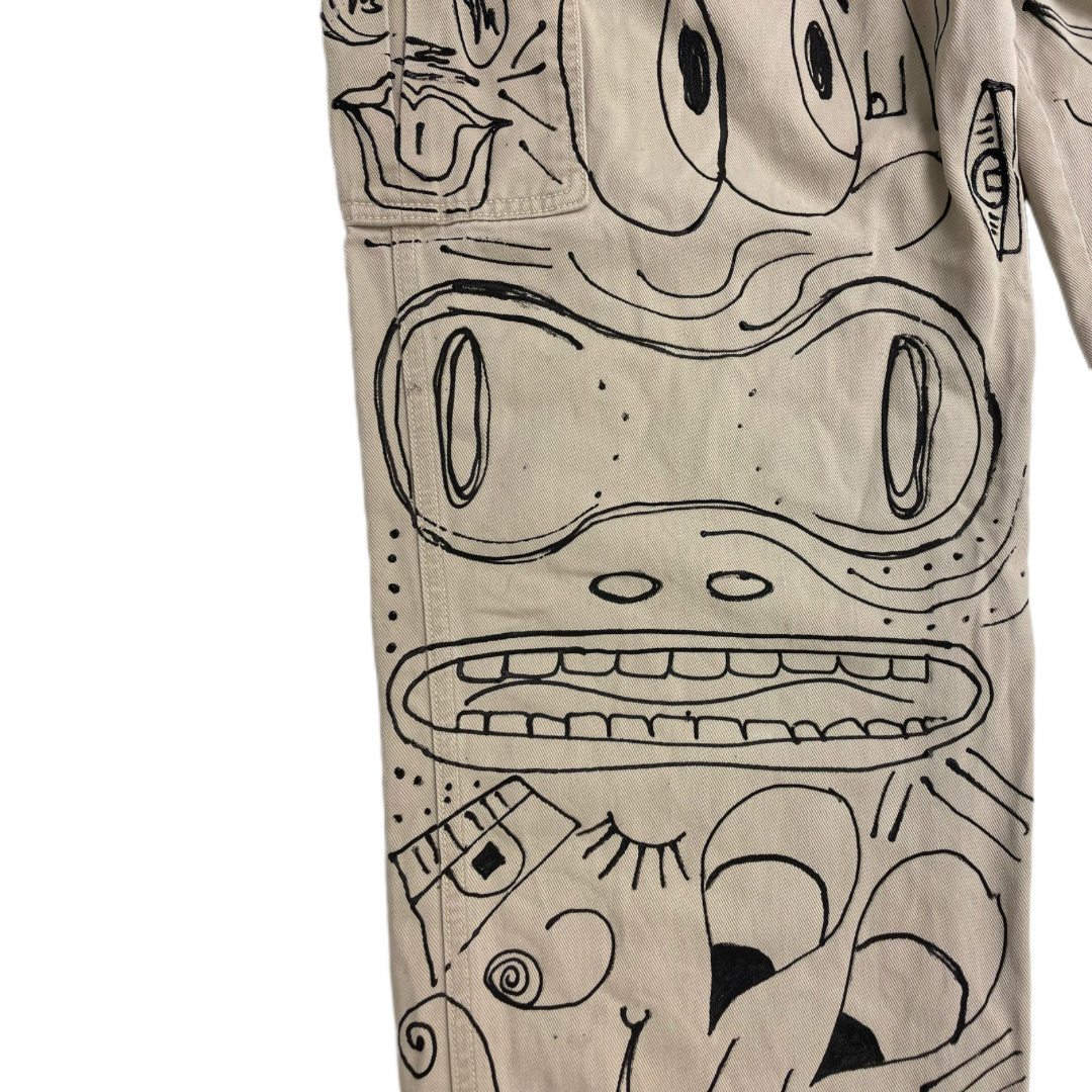 Unleash your bold side with these one-of-a-kind hand-painted cargo pants, designed for those who dare to express themselves through wearable art. Each piece is meticulously painted on thrifted, eco-conscious cotton, making it sustainable and uniquely yours.