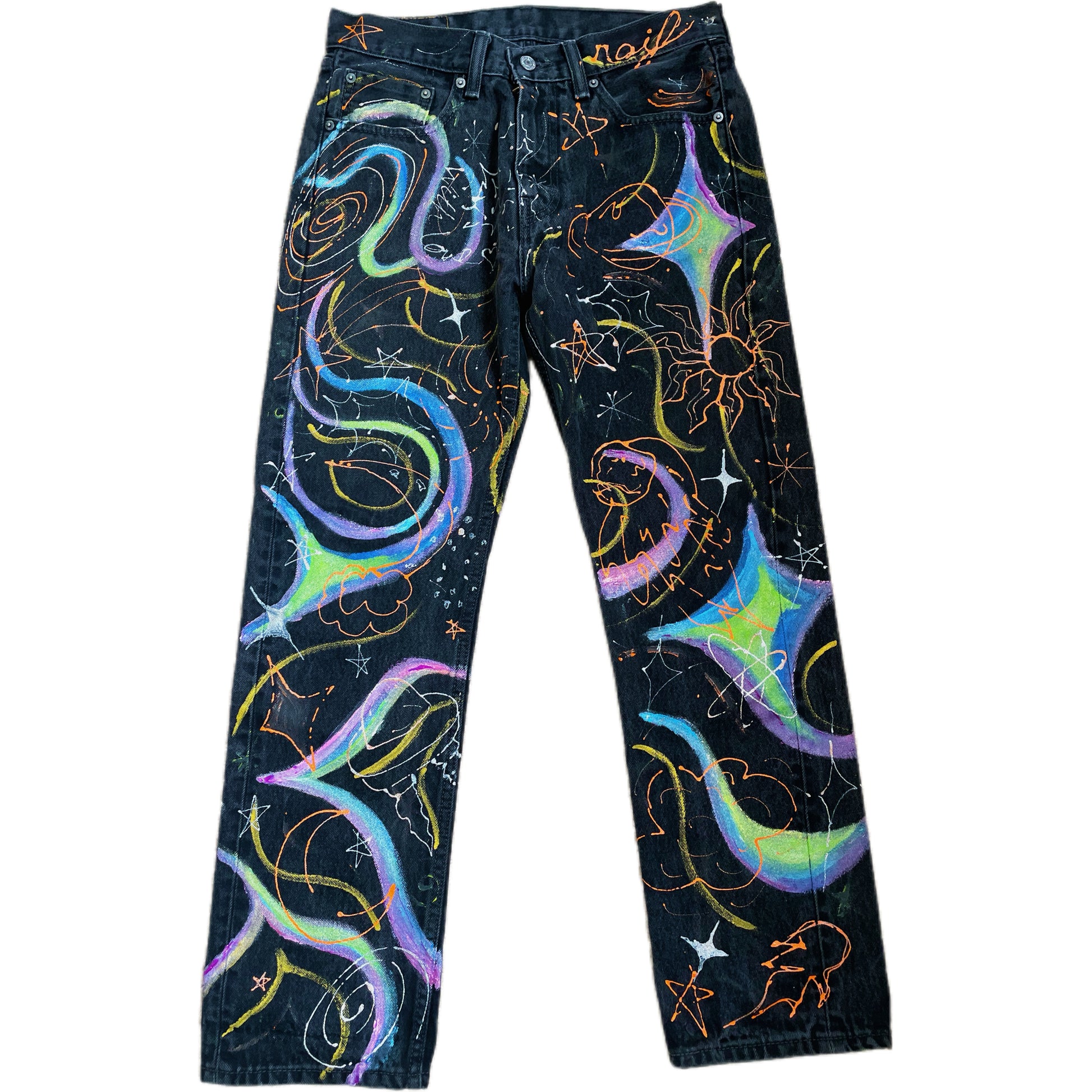 Channel the power of the cosmos with these hand-painted Levi’s denim jeans, featuring intricate, outer-space-inspired designs. These bold white-painted motifs evoke themes of energy, stars, and galactic wonder, making them a true wearable masterpiece. Crafted from thrifted Levi’s, these jeans combine the durability of iconic denim with eco-conscious, artistic flair.