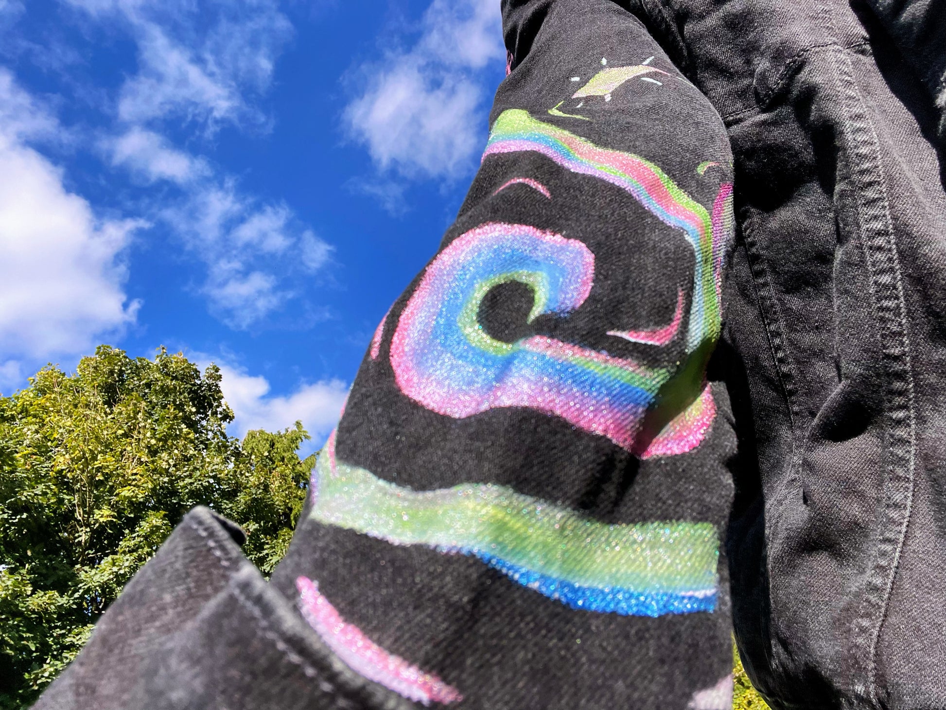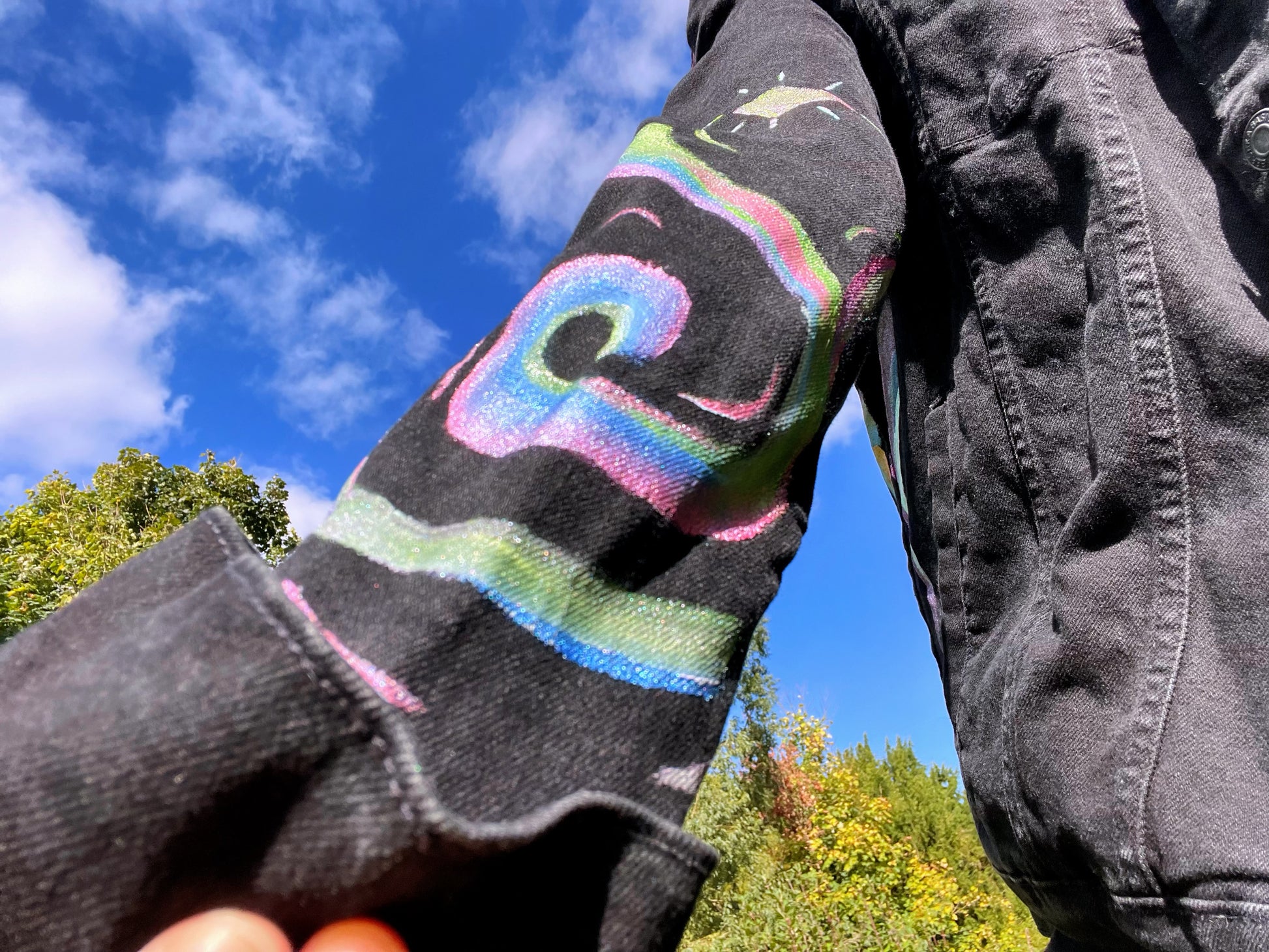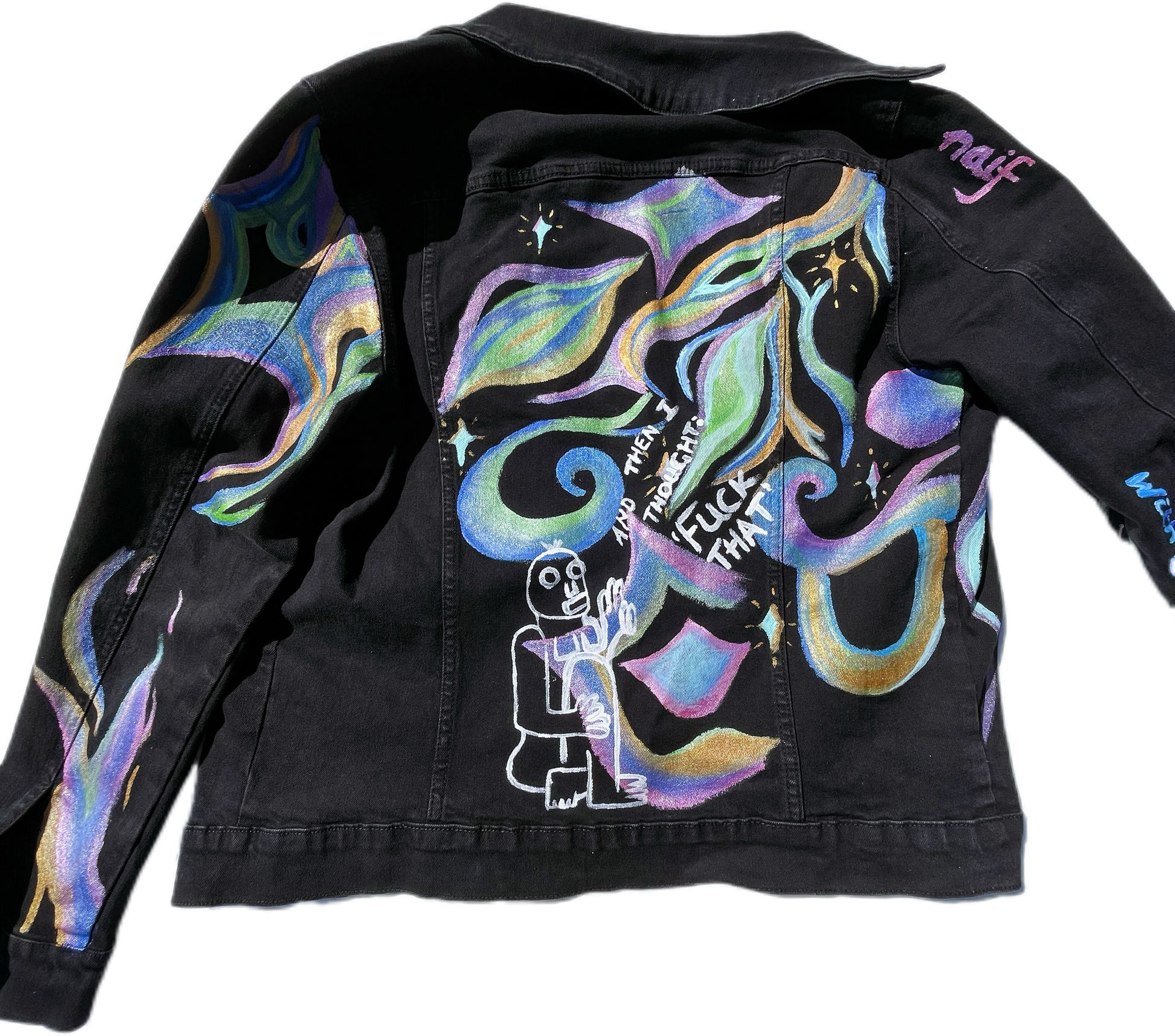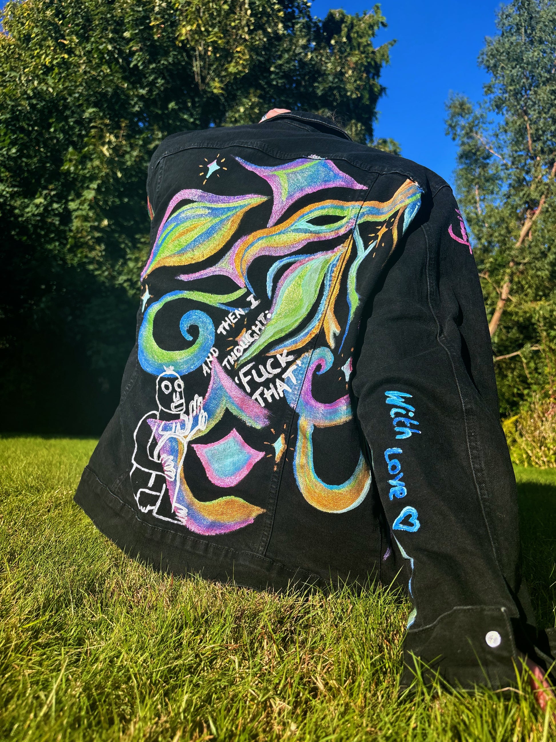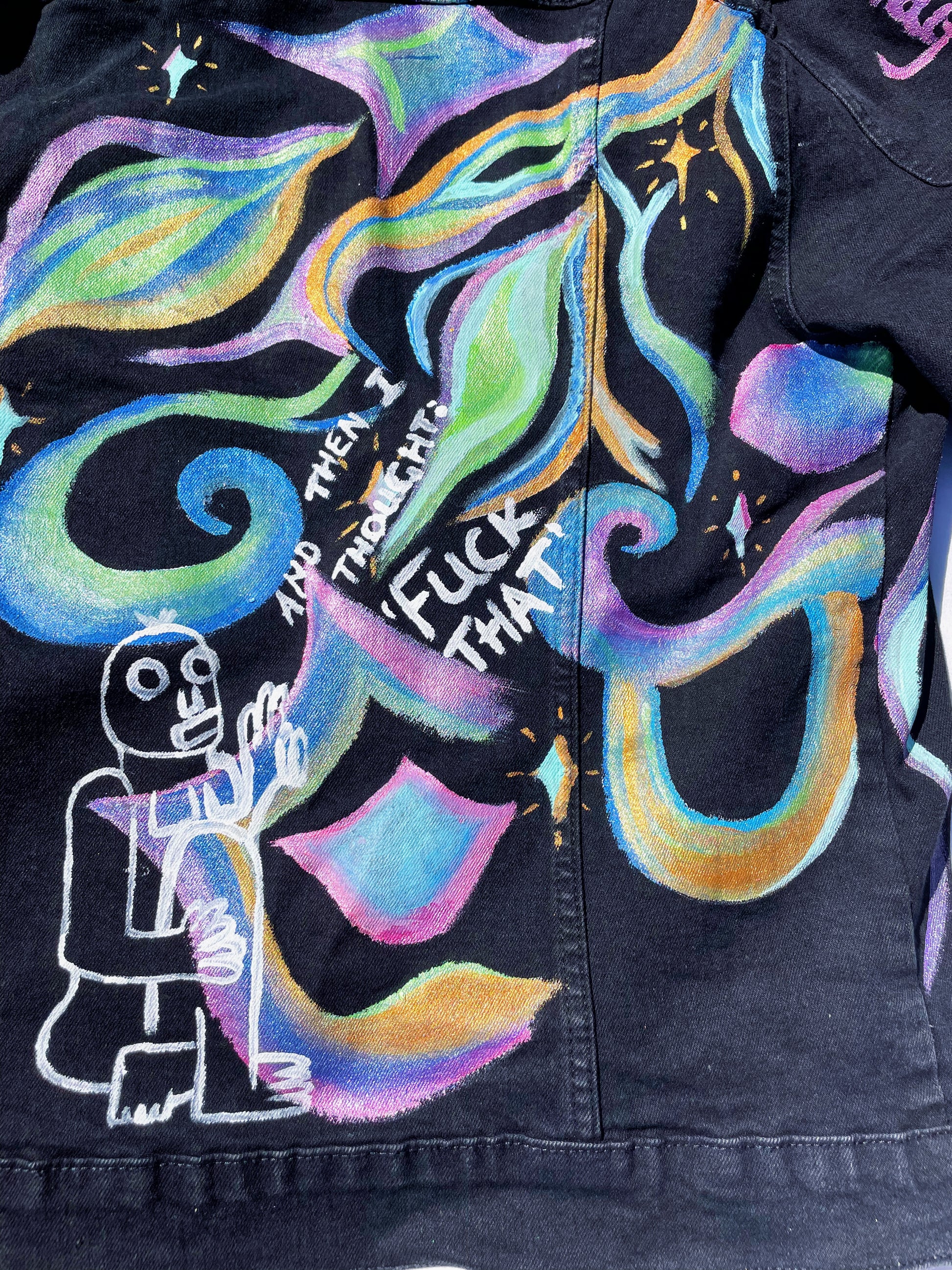 This hand-painted denim jacket bursts with vibrant color and playful energy, perfect for raves, dancing, and making a statement. Neon swirls in dynamic hues stretch across the back, evoking movement and light. At the center, a quirky hand-drawn figure interacts with the flowing designs, humorously stating, “And then I thought… Fuck that,” adding a fun, lighthearted twist.