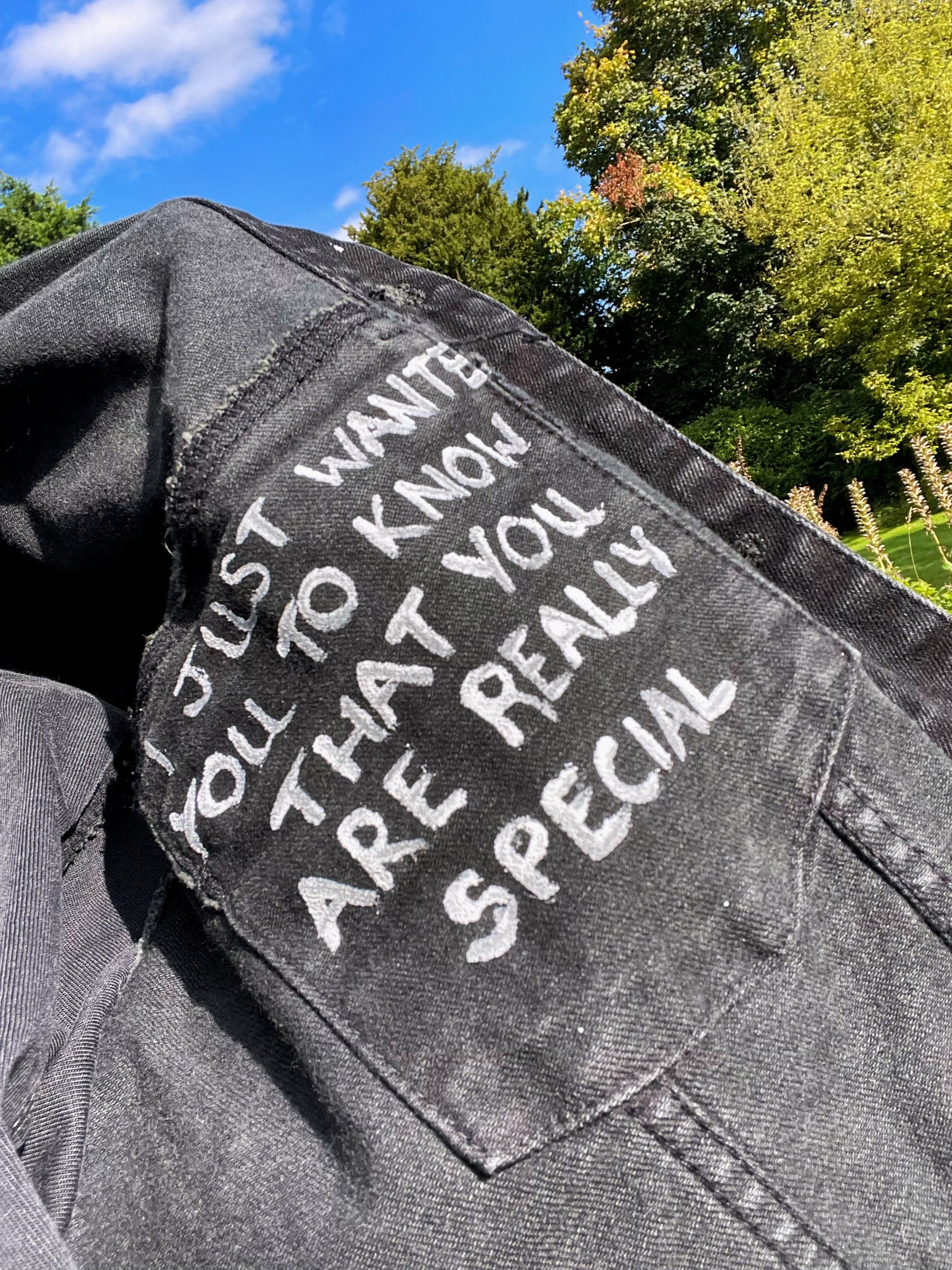 Shimmering stars and bold, colorful strokes flow along the sleeves, while the message “With Love” is subtly painted on the cuff, balancing the playful vibe with a touch of warmth.