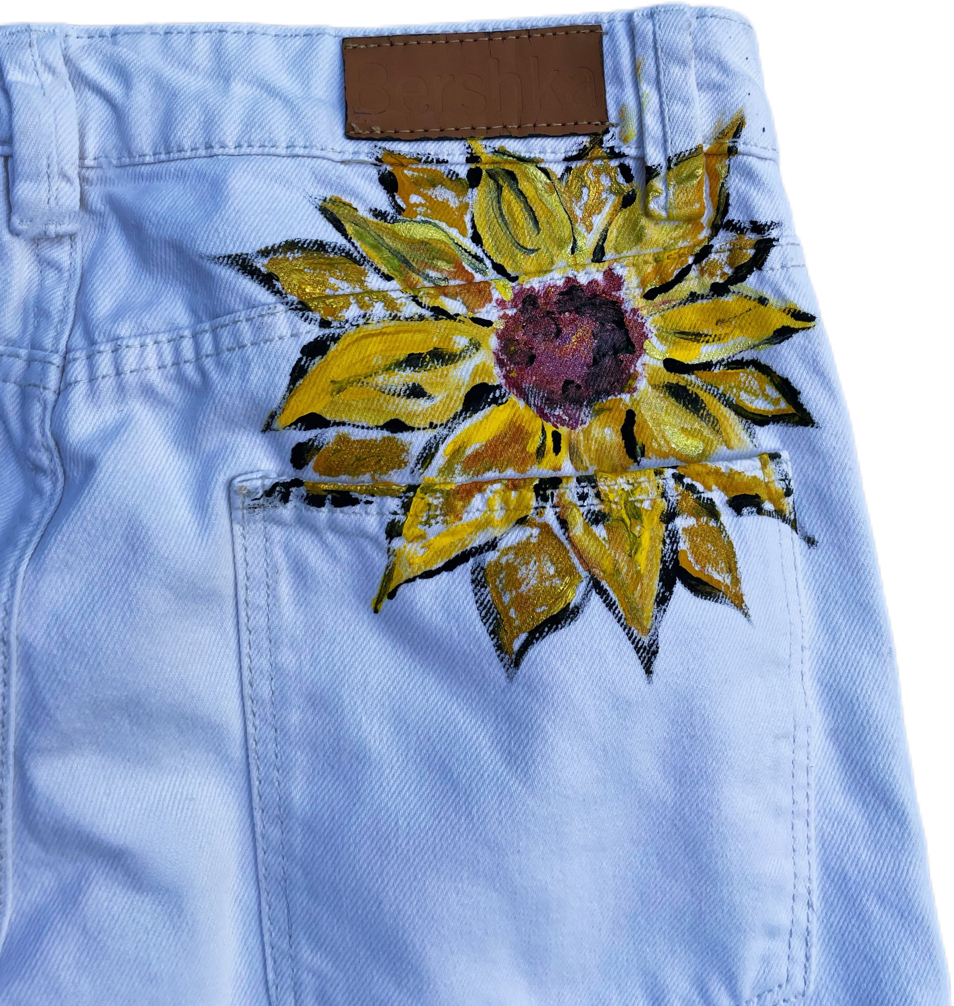 “Sunflowers in Bloom” brings life and creativity to these hand-painted, wide-leg denim trousers. With vibrant sunflowers blossoming across the front, each brushstroke evokes the warmth and energy of a sun-filled day. The natural flow of the sunflower designs creates a visual connection between nature and art, turning these trousers into a wearable expression of joy and growth. A subtle “With Love” message adds a personal touch to the design, making each pair unique.