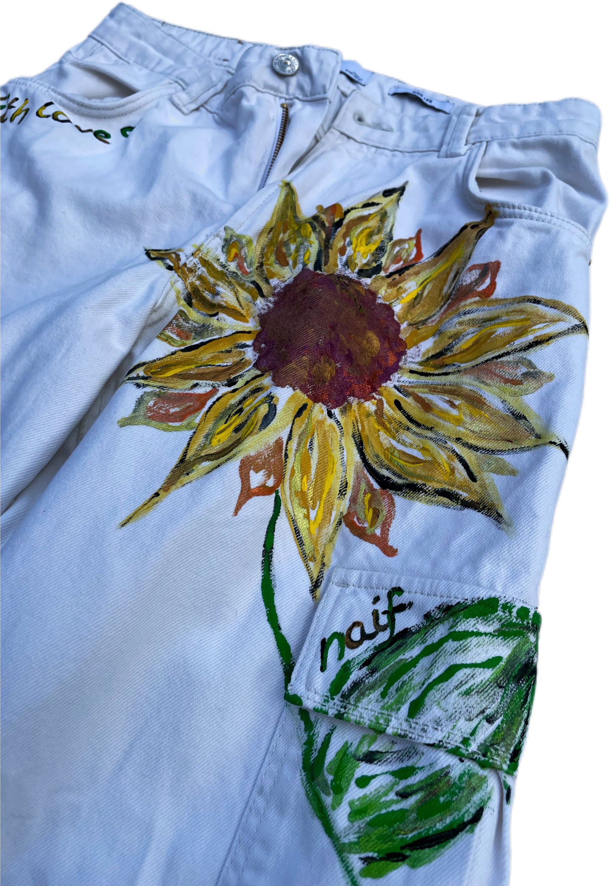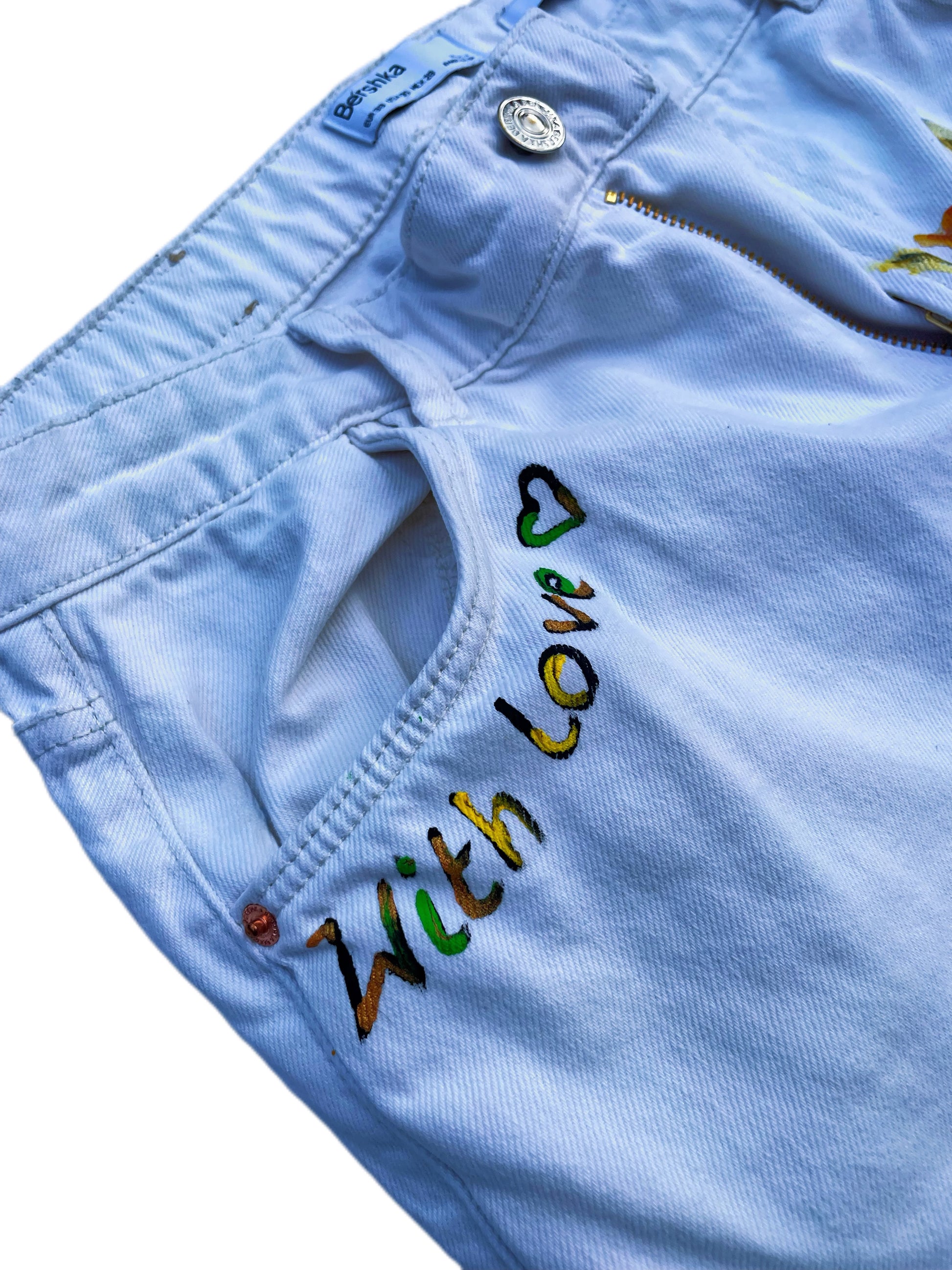 • Hand-painted on white, thrifted denim trousers (size M/10).