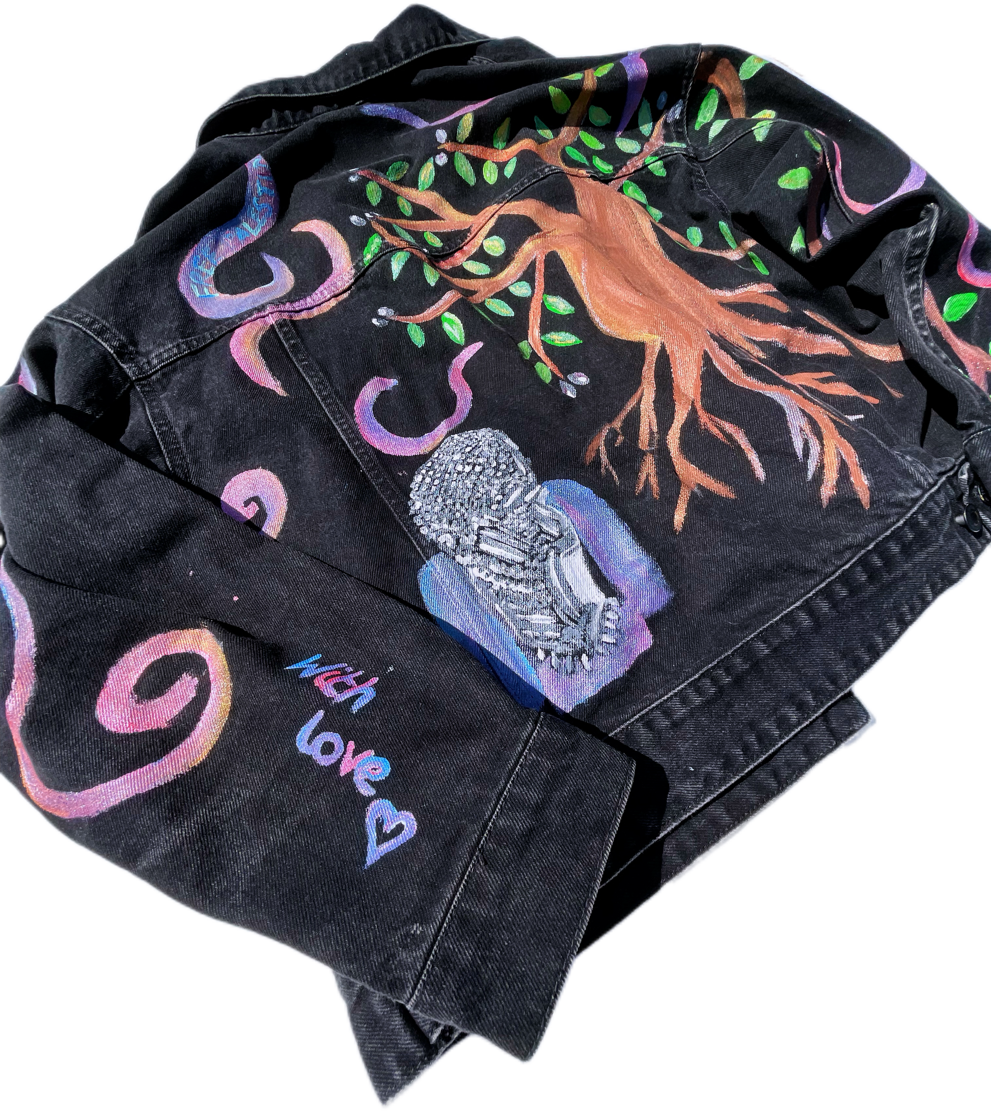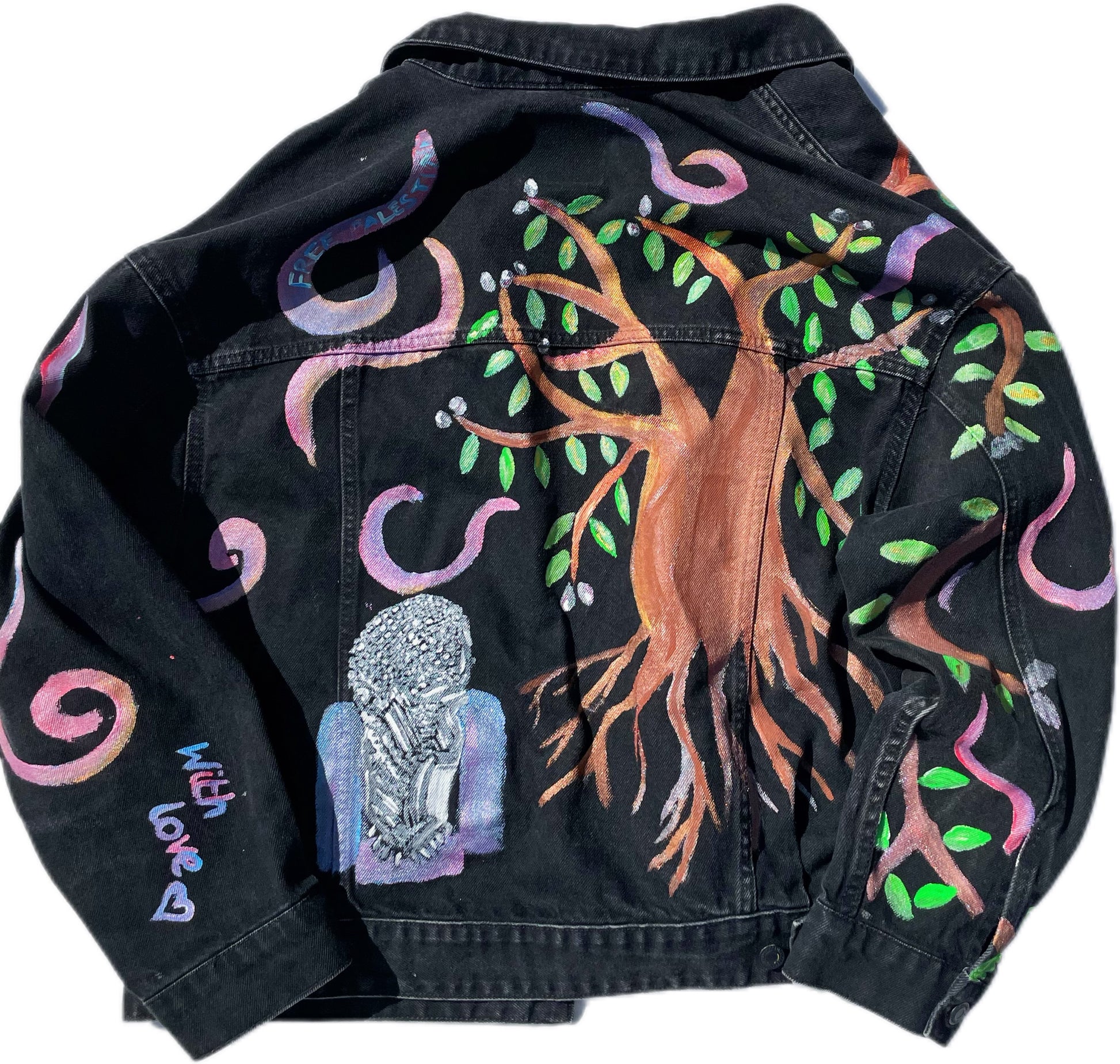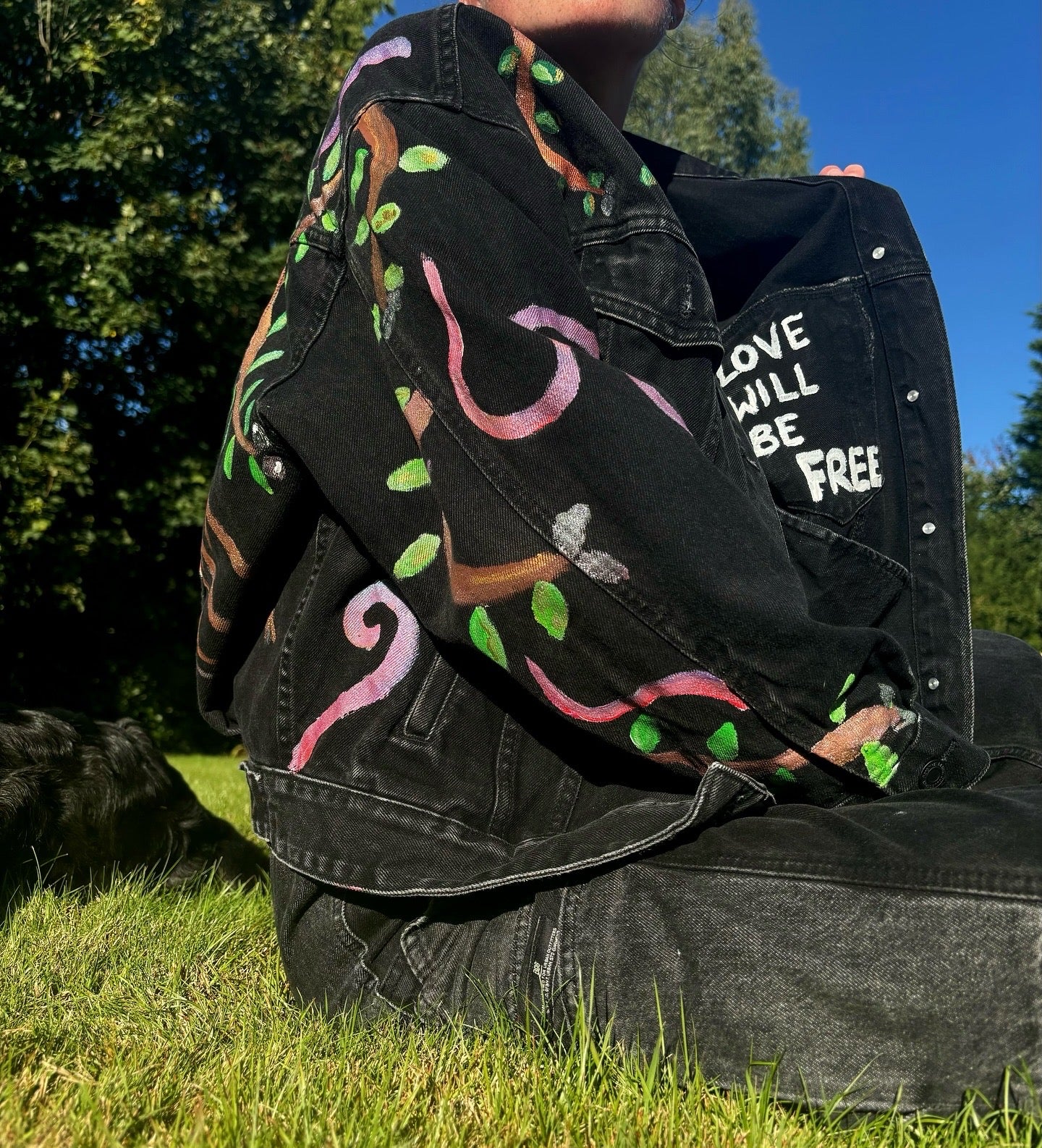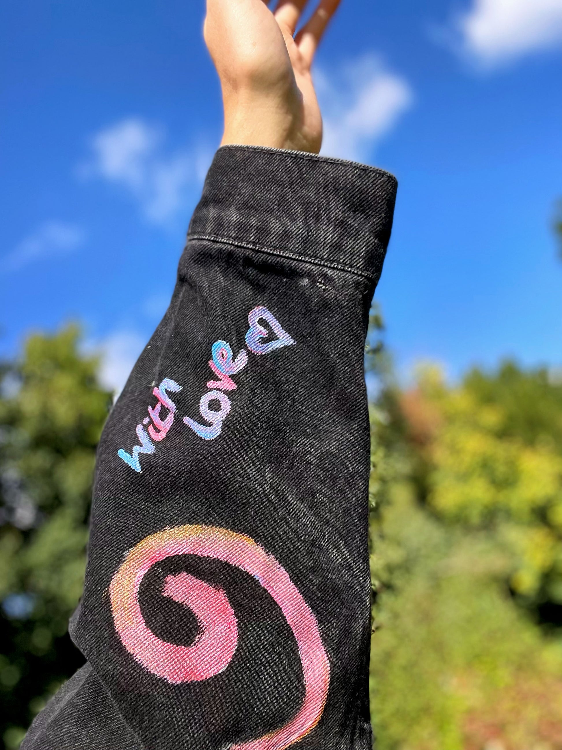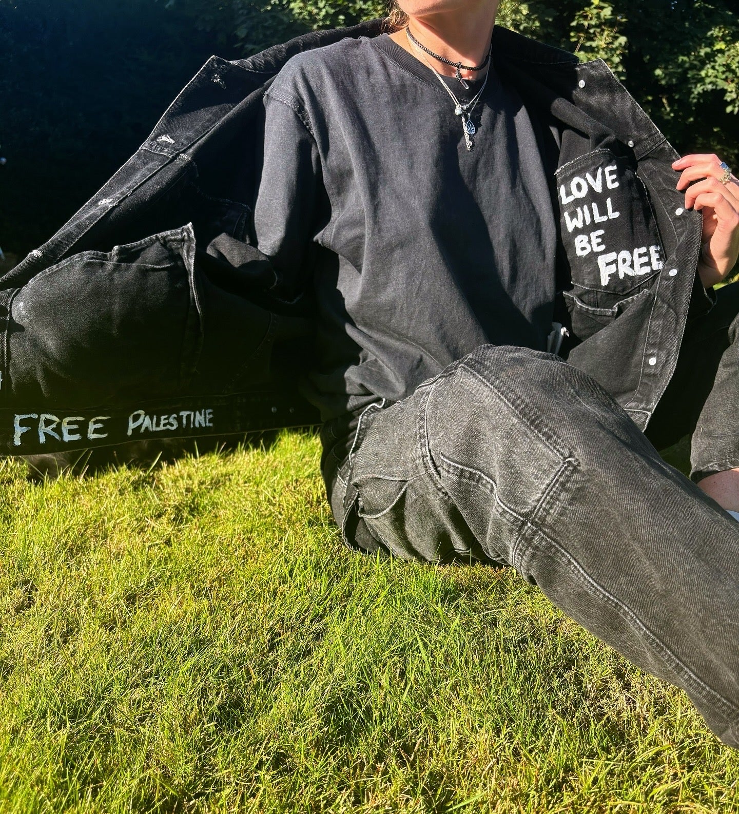 Hand-painted denim jacket featuring intricate designs that deliver the message of “Free Palestine.” A keffiyeh-adorned figure rests beneath a tree, while the phrase “Free Palestine” within a pastel swirl calls for justice. “With Love” is painted in soft, colorful hues on the opposite sleeve, adding a touch of compassion.