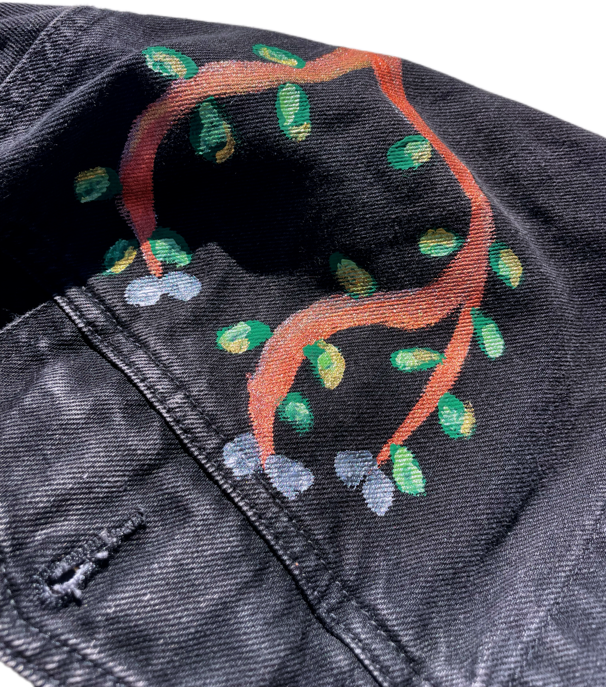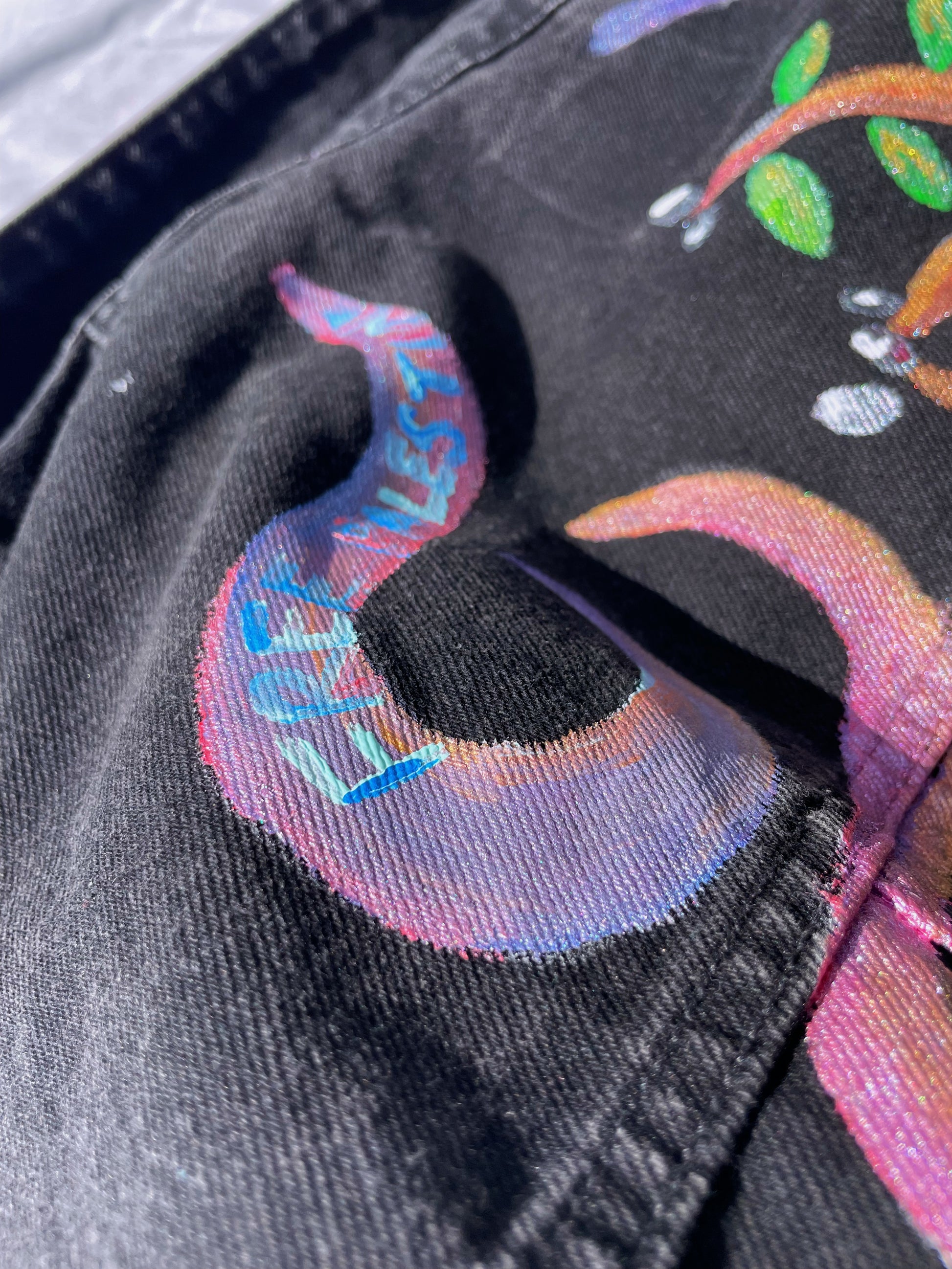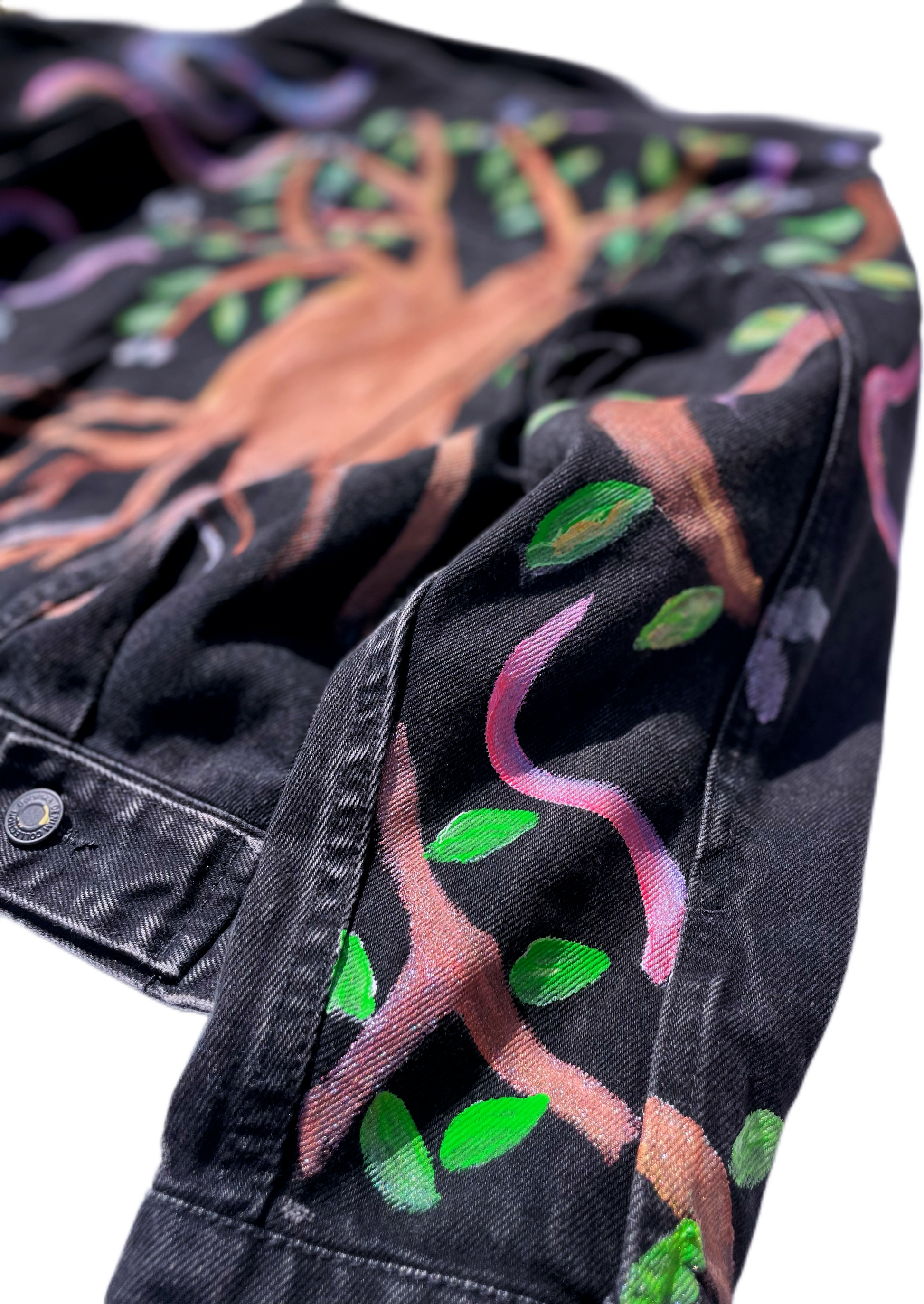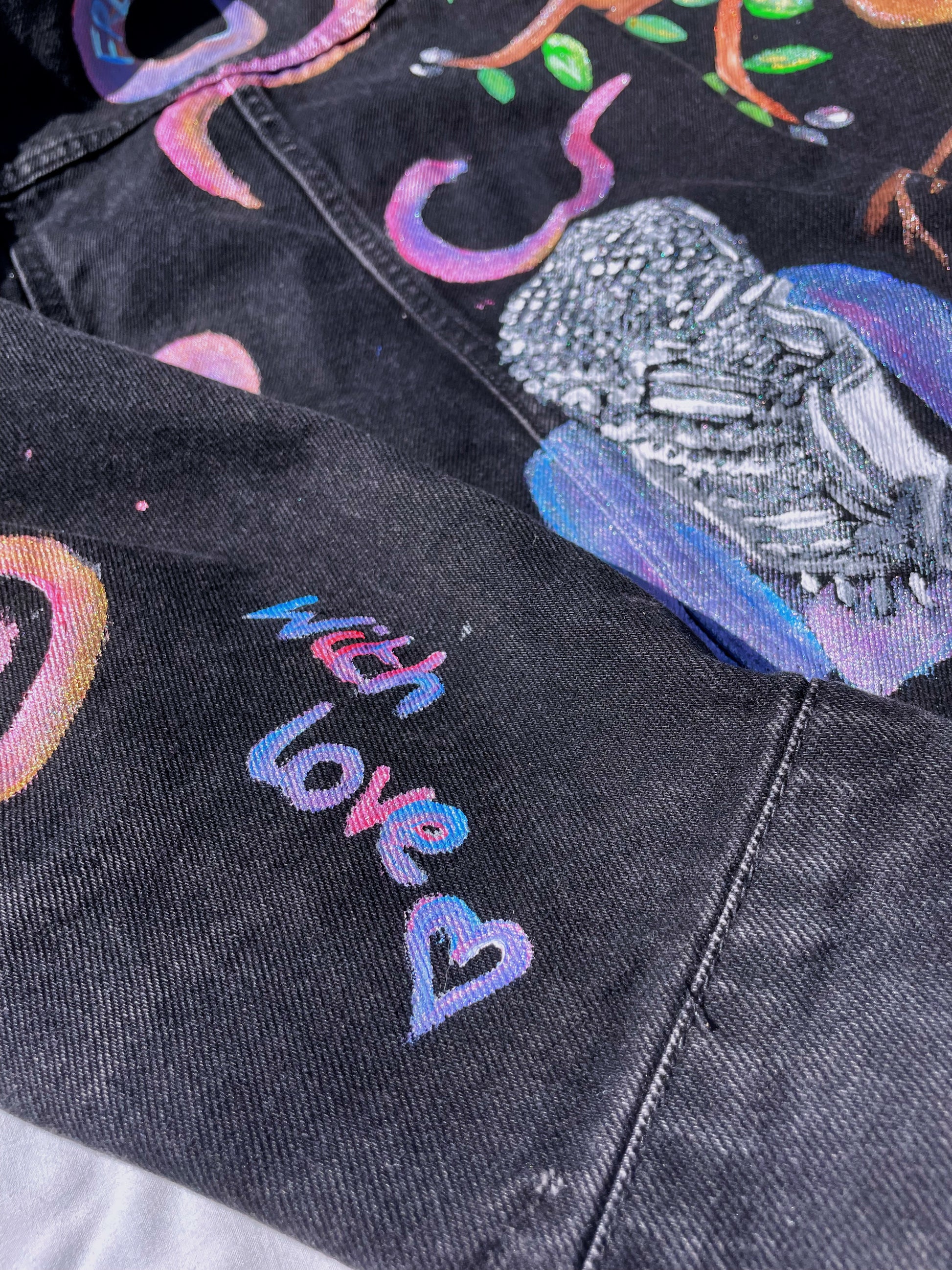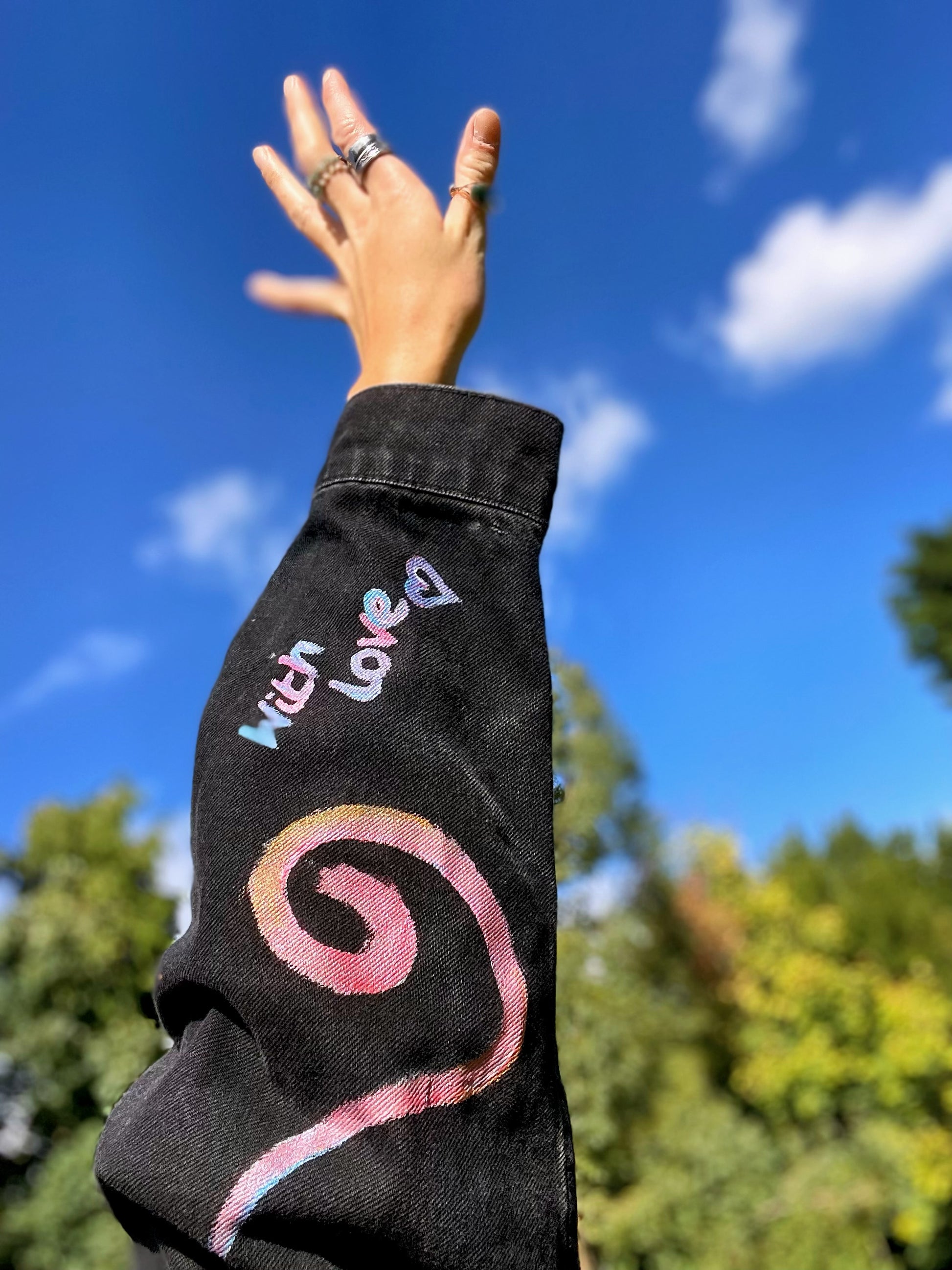 Hand-painted denim jacket featuring intricate designs that deliver the message of “Free Palestine.” A keffiyeh-adorned figure rests beneath a tree, while the phrase “Free Palestine” within a pastel swirl calls for justice. “With Love” is painted in soft, colorful hues on the opposite sleeve, adding a touch of compassion.