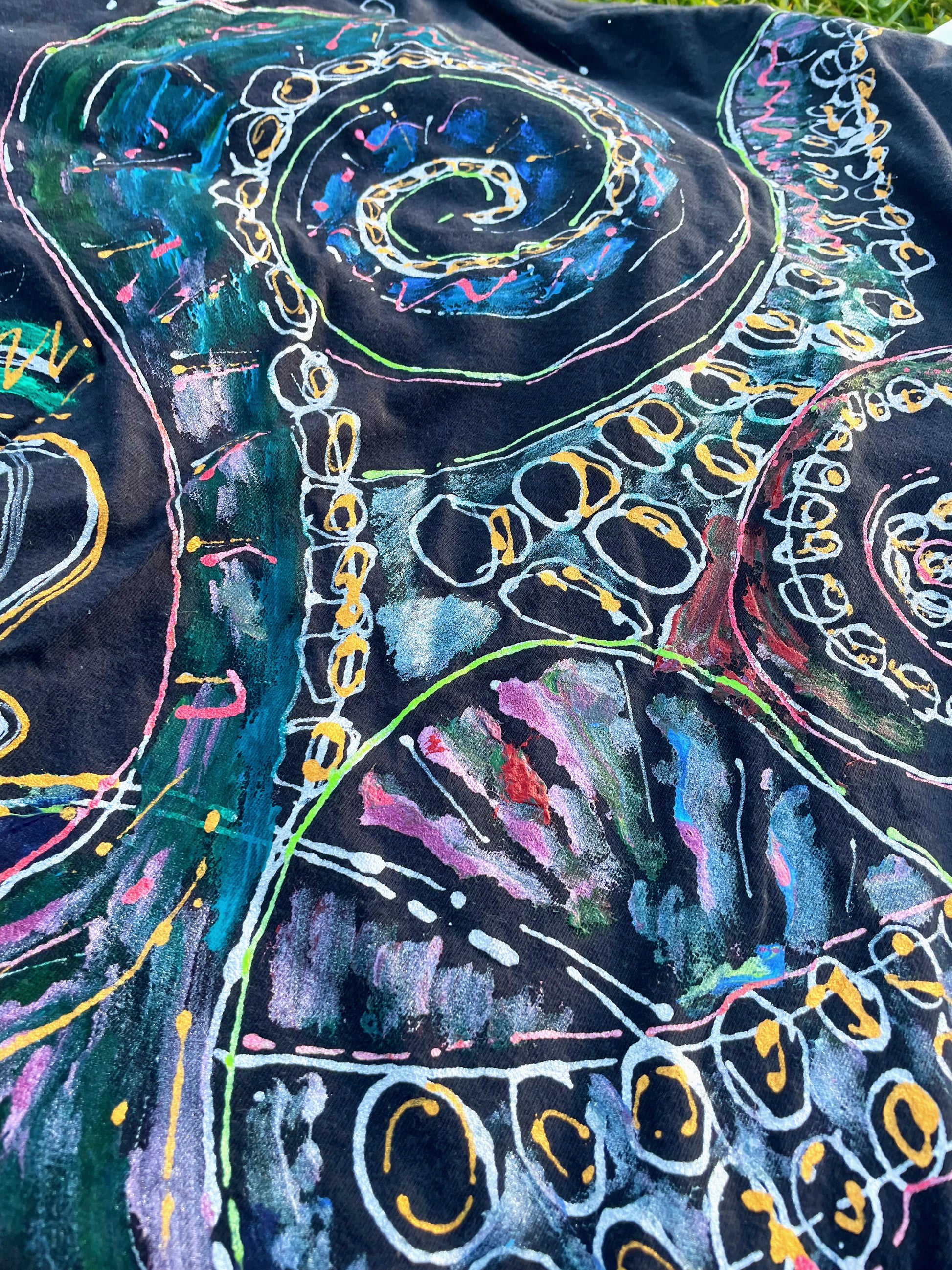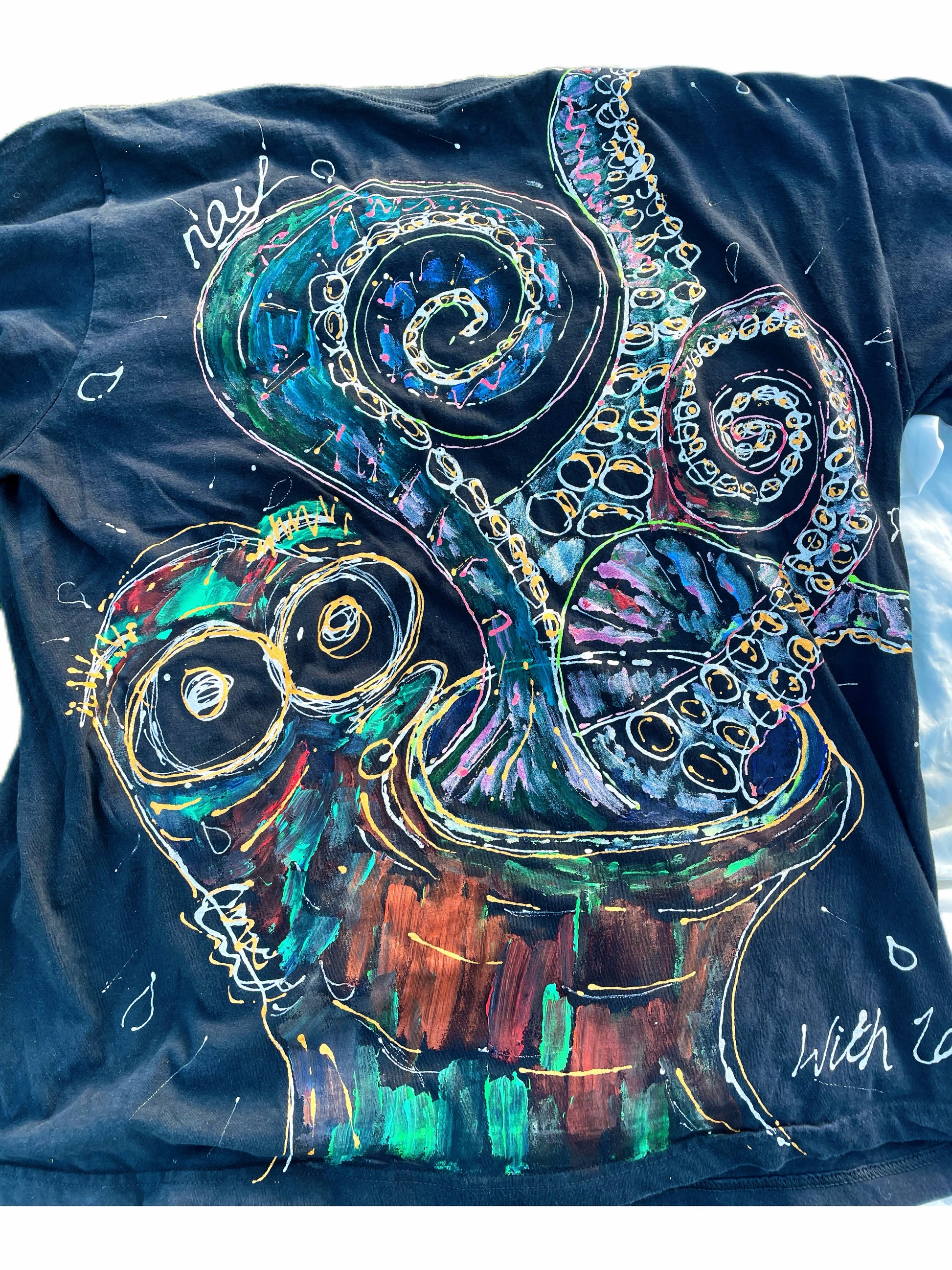 Dive into a vibrant world of creativity with this stunning hand-painted t-shirt. Featuring mesmerizing, multicolored octopus tentacles swirling in intricate spirals, this piece captures the dynamic energy of the ocean and the cosmos. It’s a bold, wearable work of art perfect for those who love unique, statement designs.