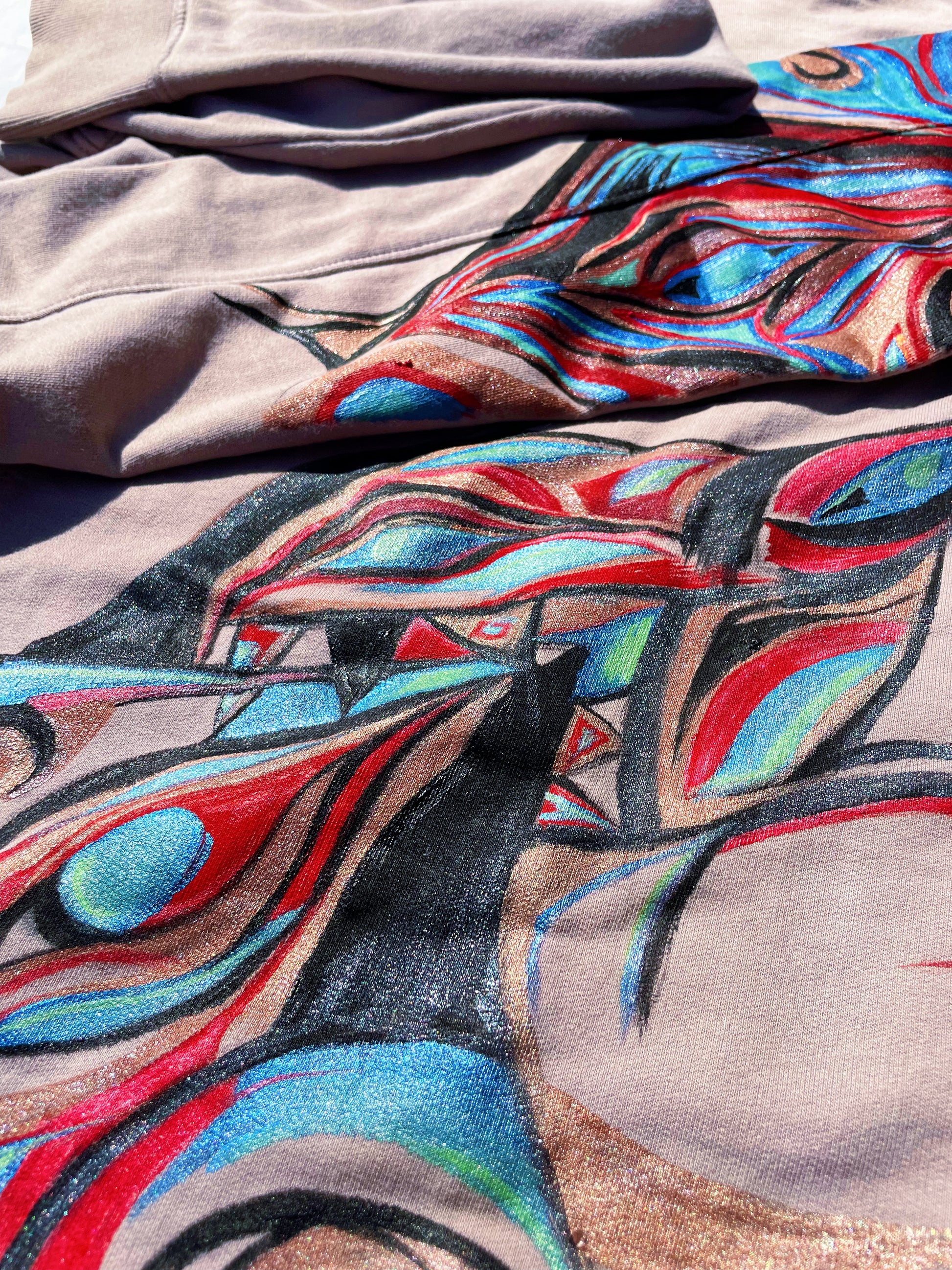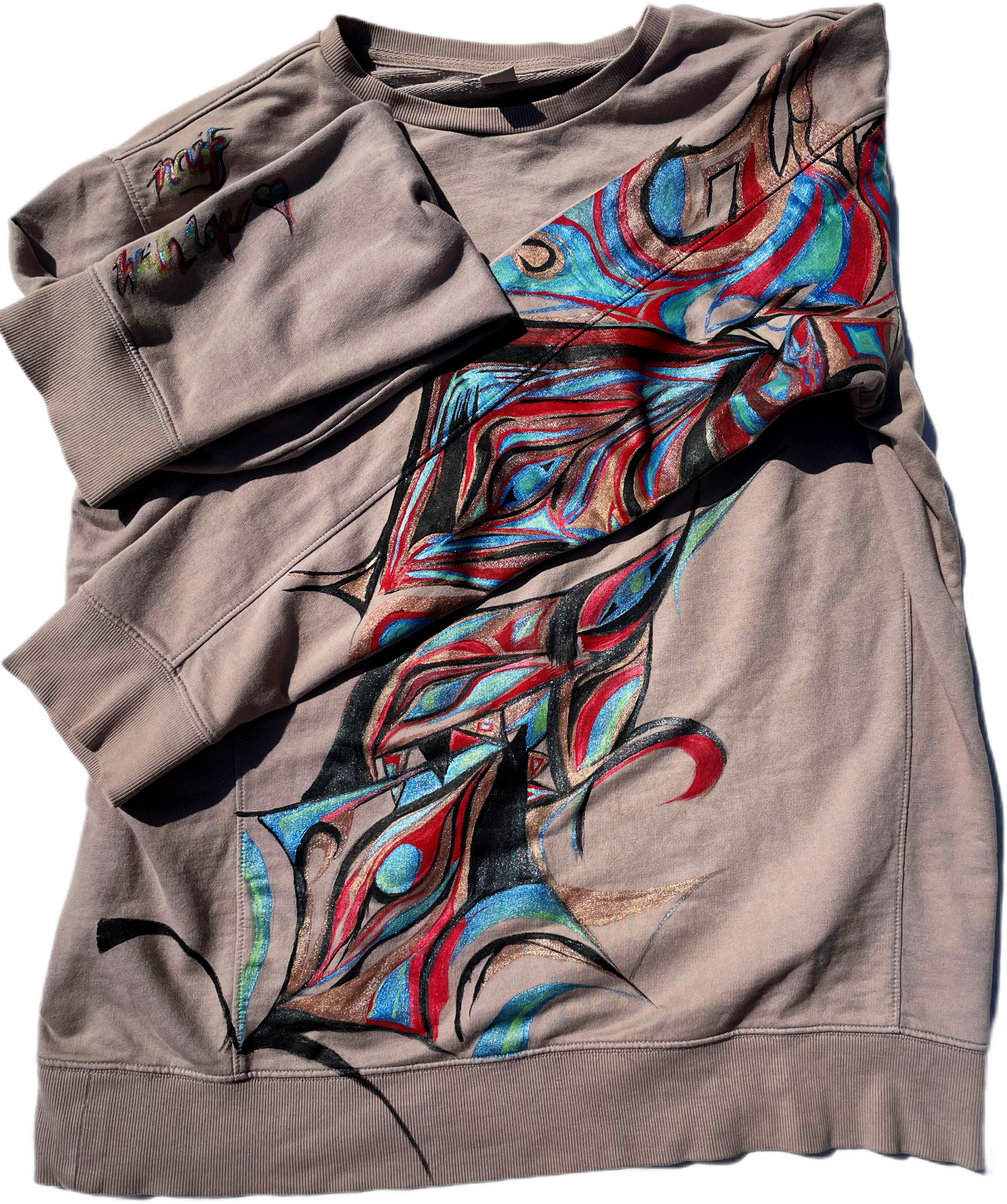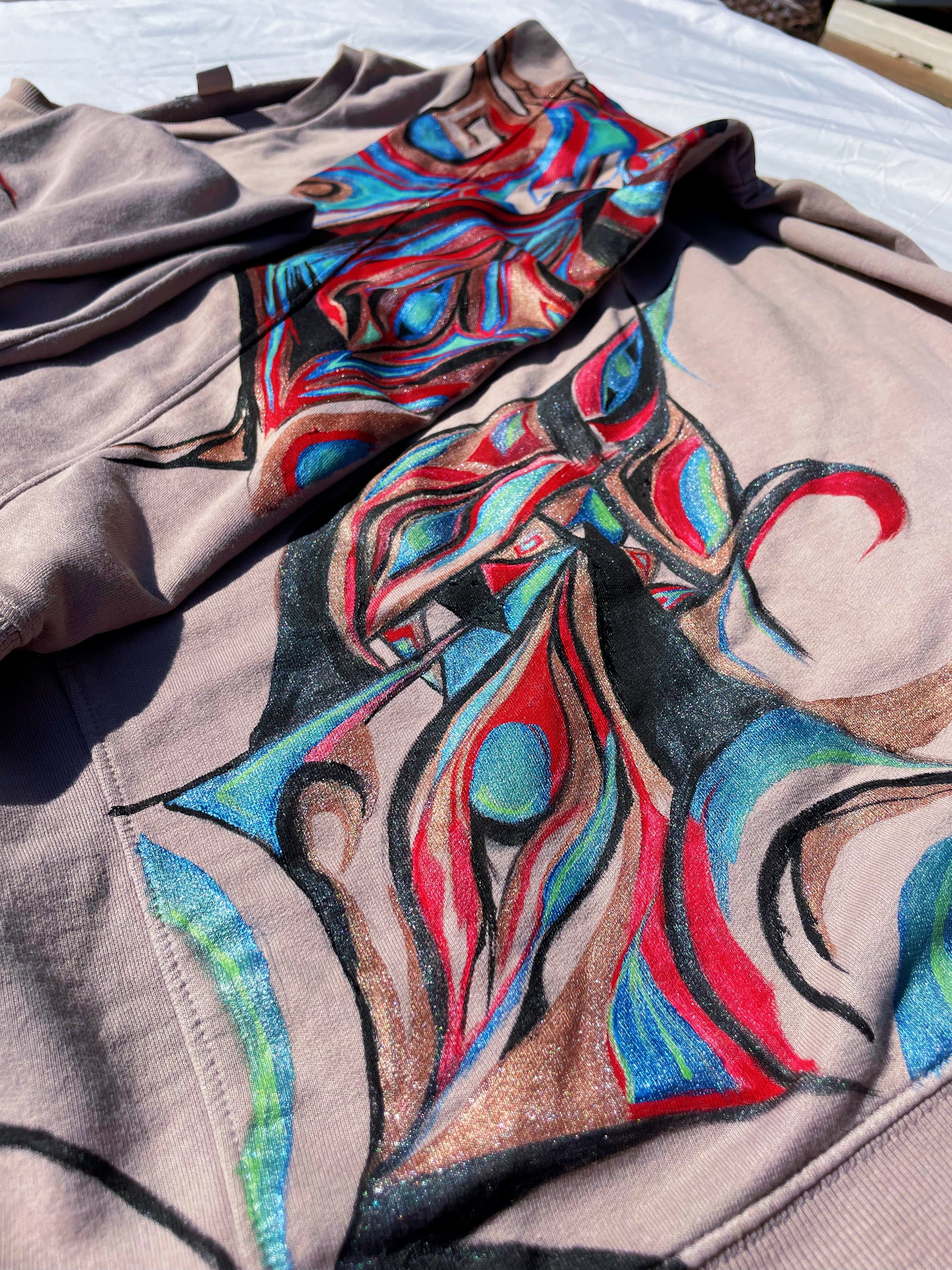 “Electric Pulse” captures the energy and rhythm of trance, techno, and rave culture. The vibrant red, blue, and metallic swirls pulse across the sweatshirt like music in motion, creating an abstract design that feels alive with movement. Inspired by the beats and flow of artists like Fred Again, this hand-painted piece stands out as both wearable art and a tribute to the electrifying world of dance music.