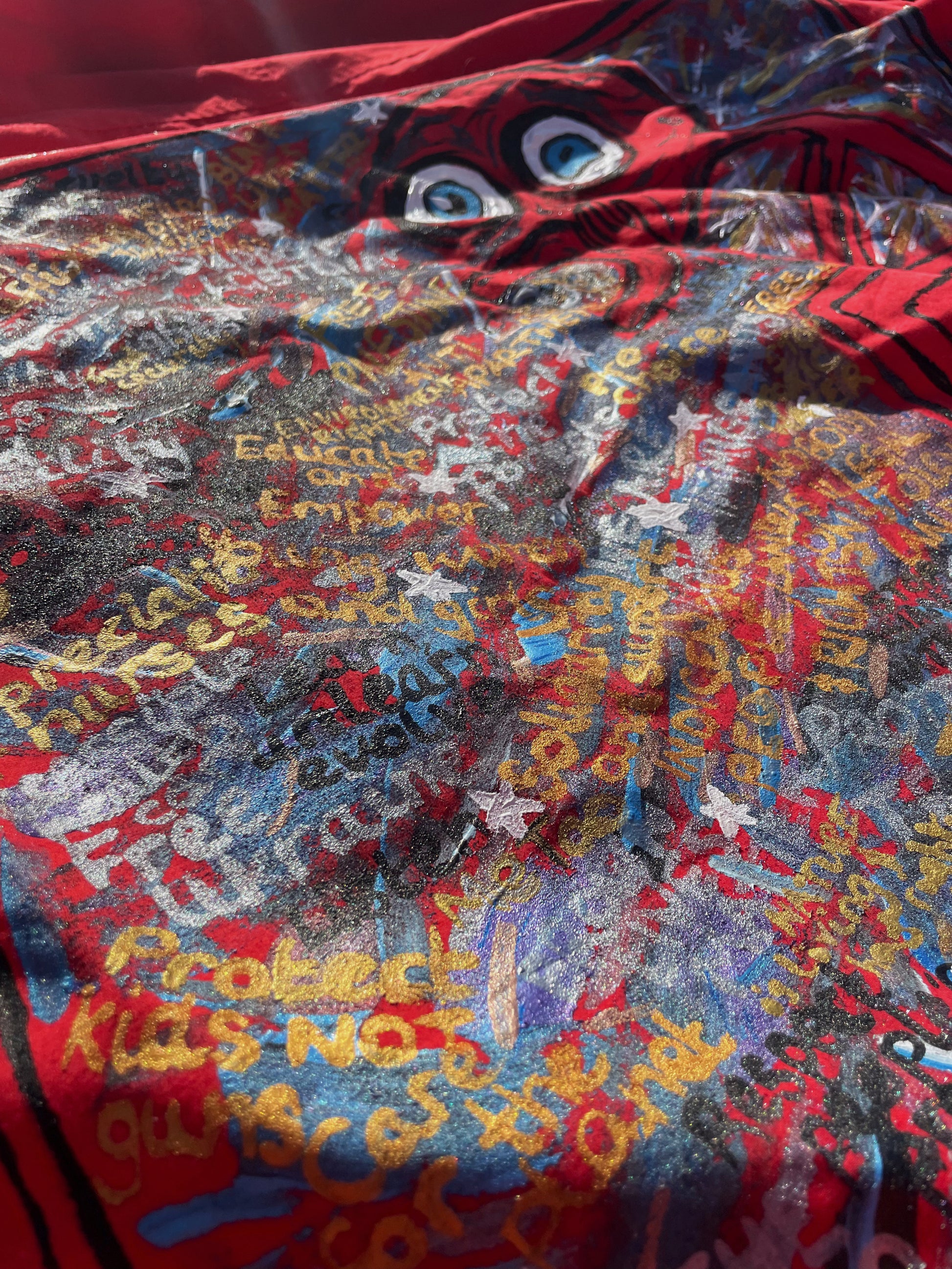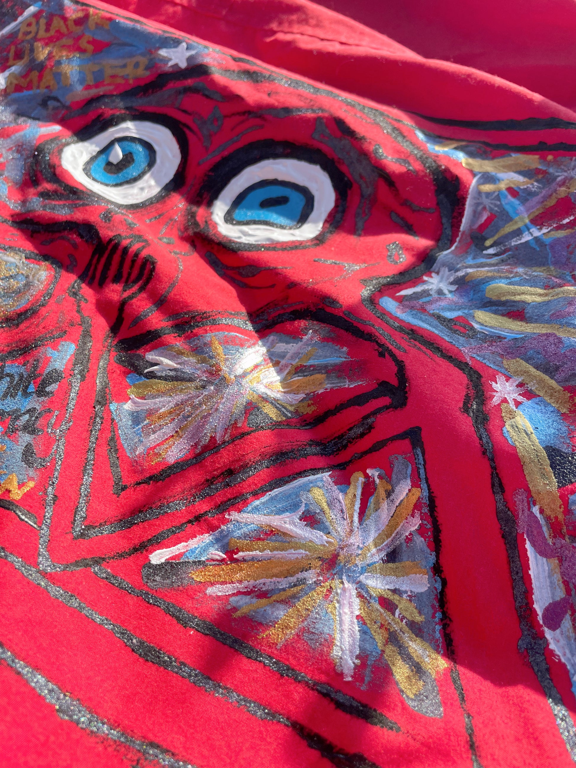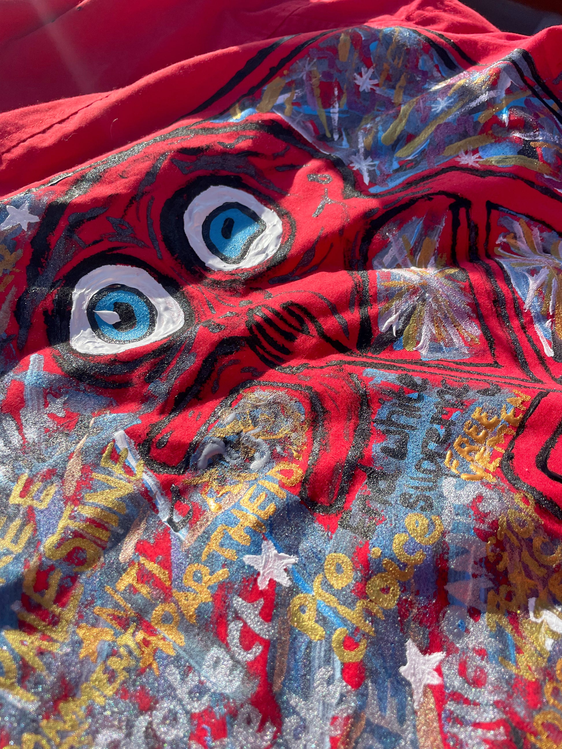 “Voices of the Movement” is a powerful, hand-painted jacket that amplifies the voices of justice, equity, and resistance. The bold red background serves as a canvas for a dynamic figure with wide, expressive eyes, surrounded by a sea of messages and words advocating for human rights, environmental justice, and liberation movements like “Free Palestine,” “Pro-Choice,” “Black Lives Matter,” and “Protect the Earth.” Every brushstroke is intentional, blending art with activism to create a visual representation of collective movements for change.