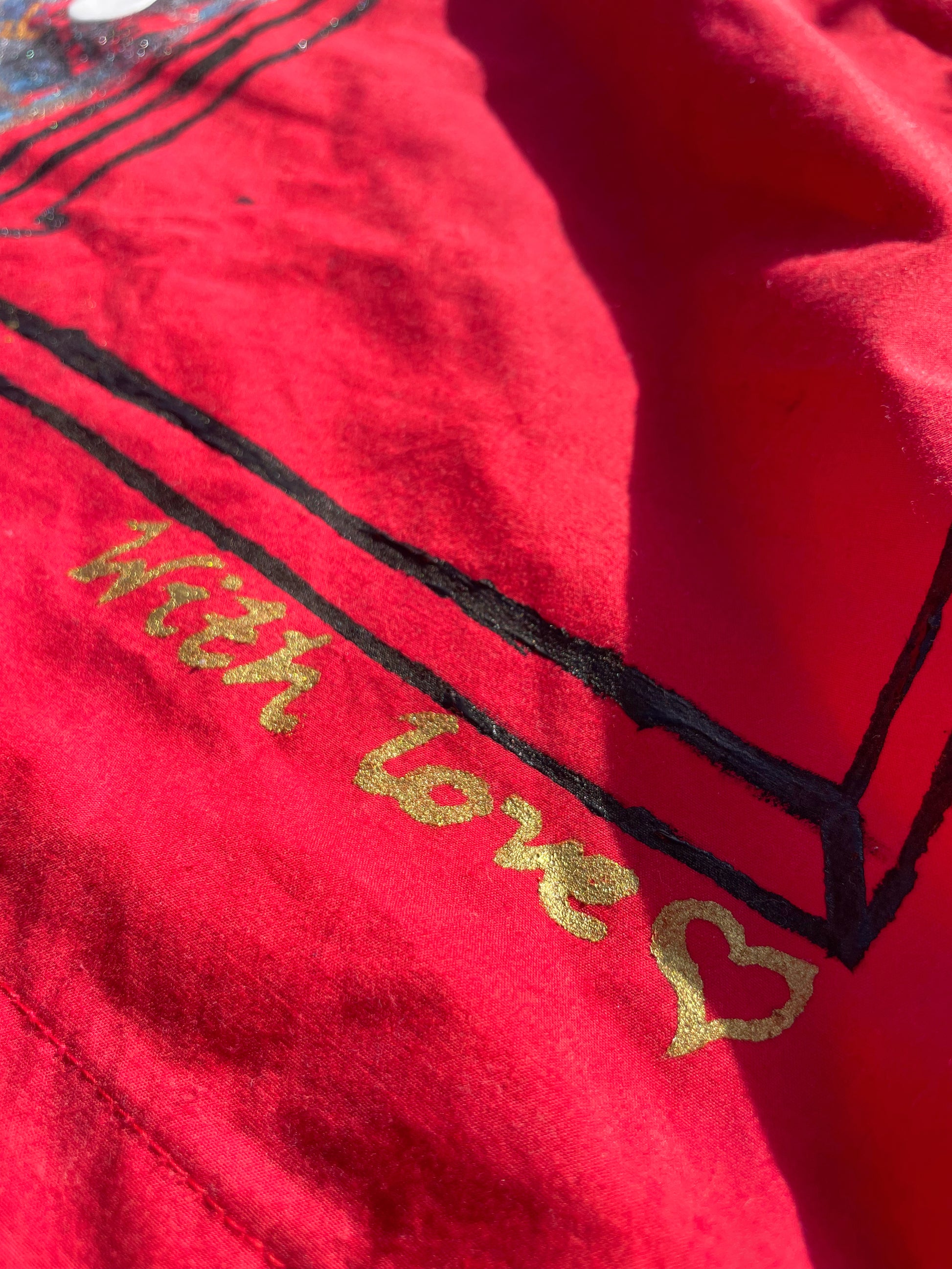This one-of-a-kind jacket features shimmering accents, white stars, and powerful phrases that stand out, reminding us of the ongoing fight for equality and justice. The Naif signature and “With Love” detail on the sleeve add a personal touch, making this jacket more than just a fashion statement—it’s a wearable manifesto for change. Made from thrifted materials, this jacket embodies both sustainability and purpose.