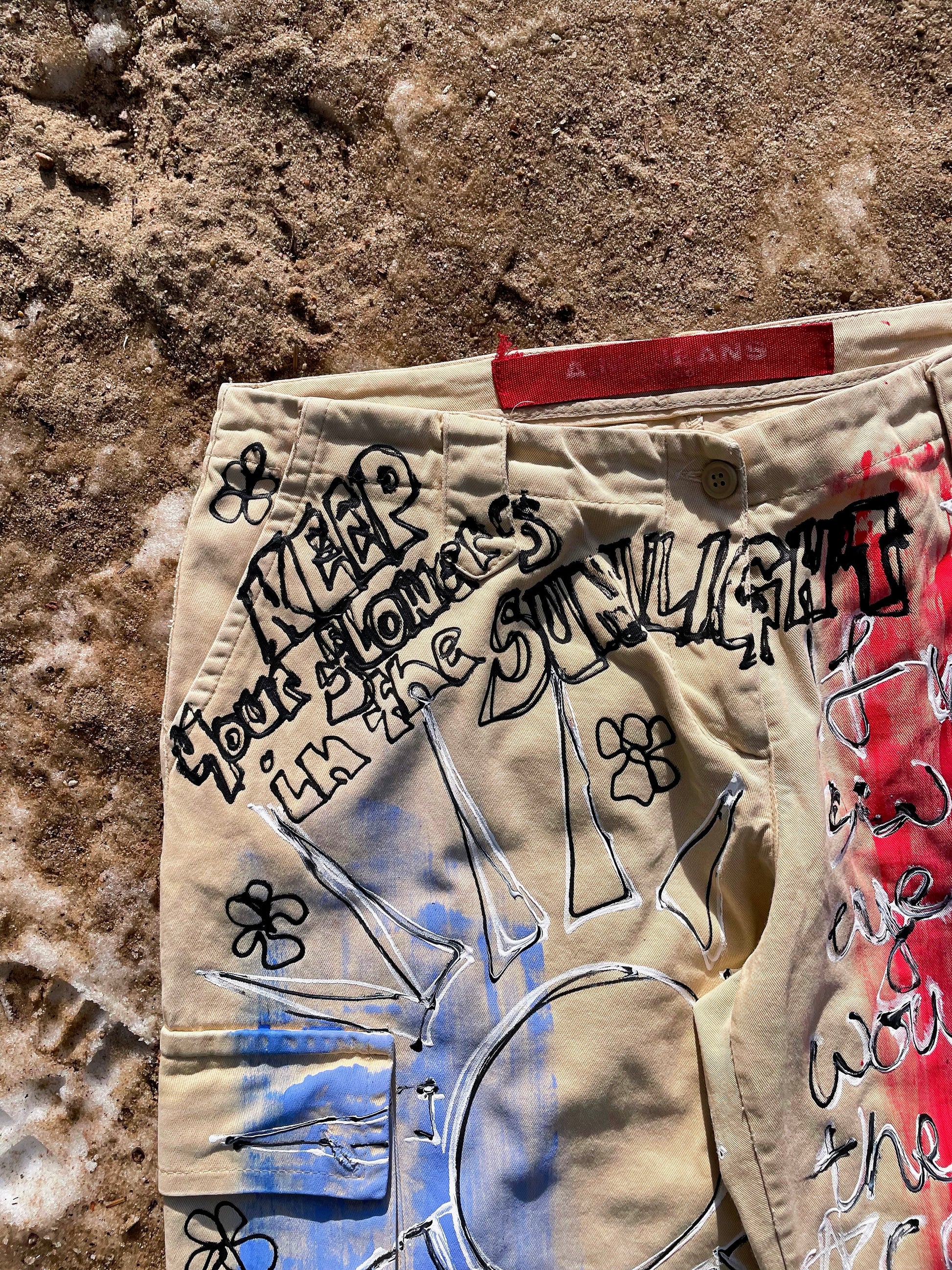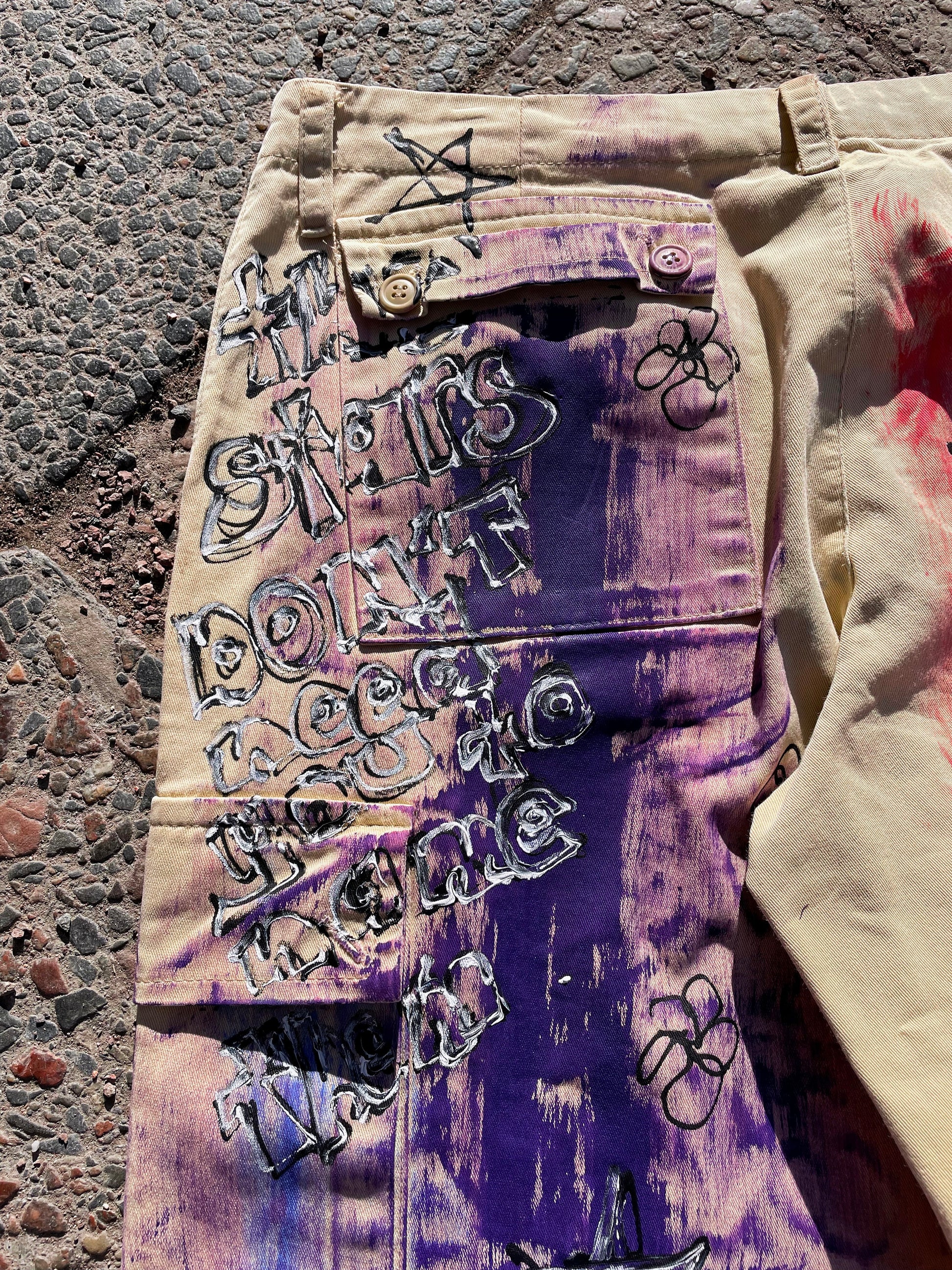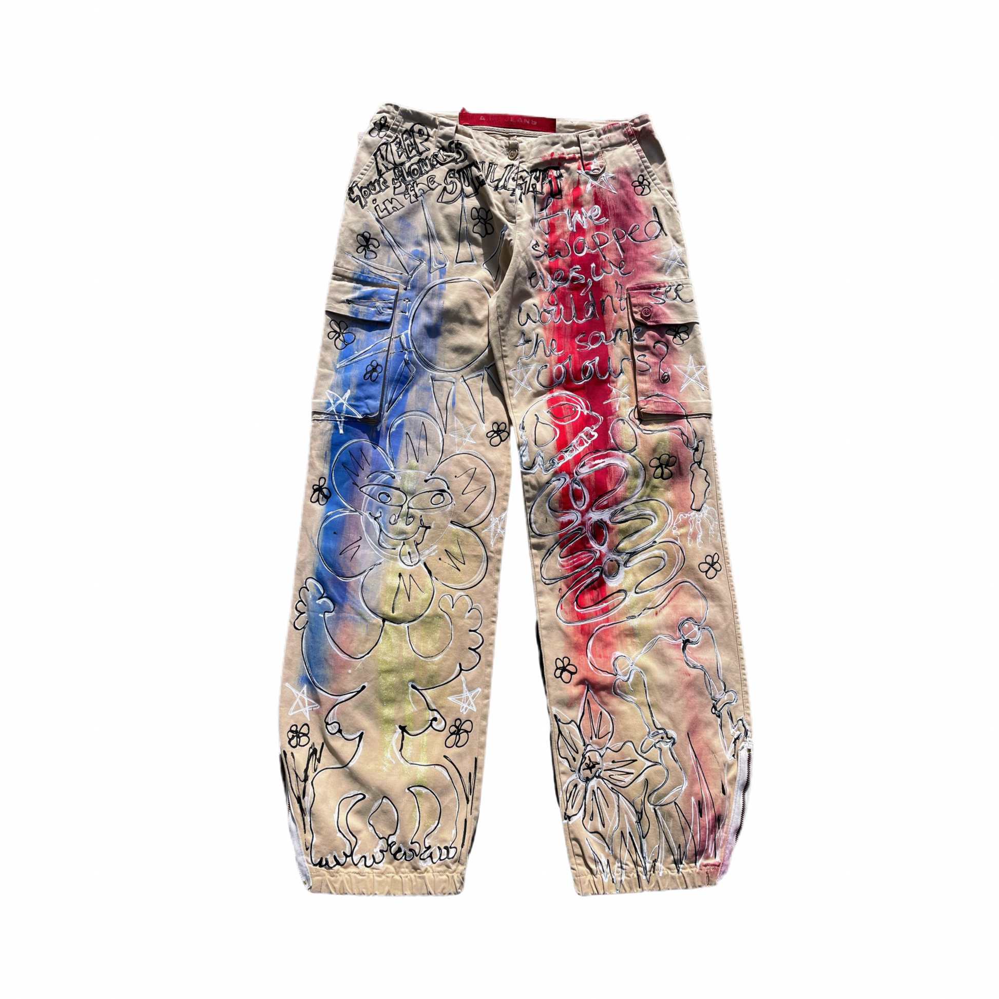 These hand-painted, one-of-a-kind canvas pants consider perception, identity, and the way we see the world. A raw interplay of color and contrast, the left leg is awash in deep purples, etched with the words “The stars don’t need you to name them”, while the right leg bleeds into vibrant reds, questioning, “If we swapped eyes, we wouldn’t see the same colors?”