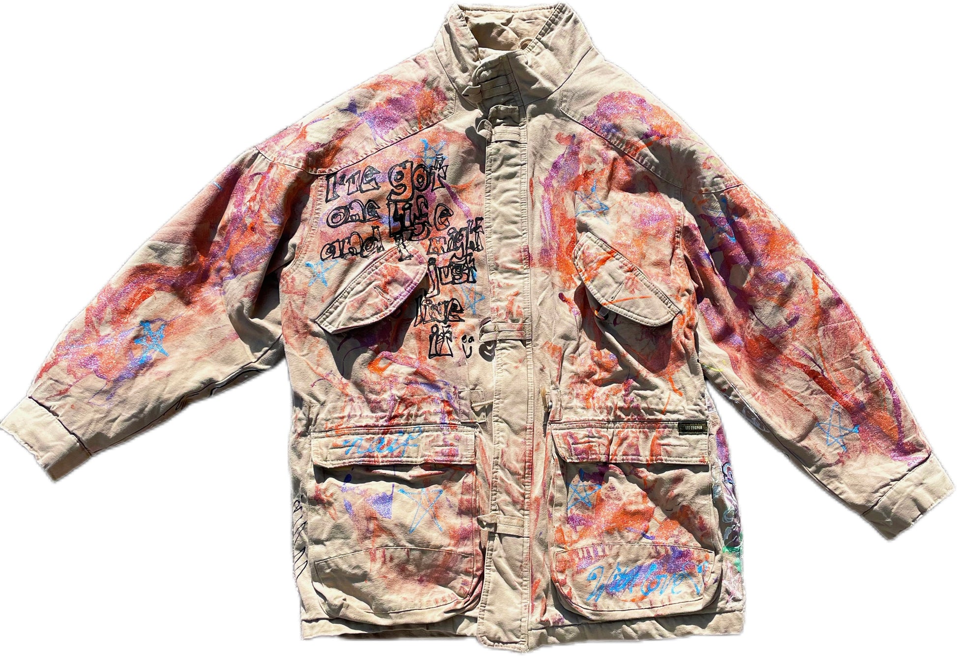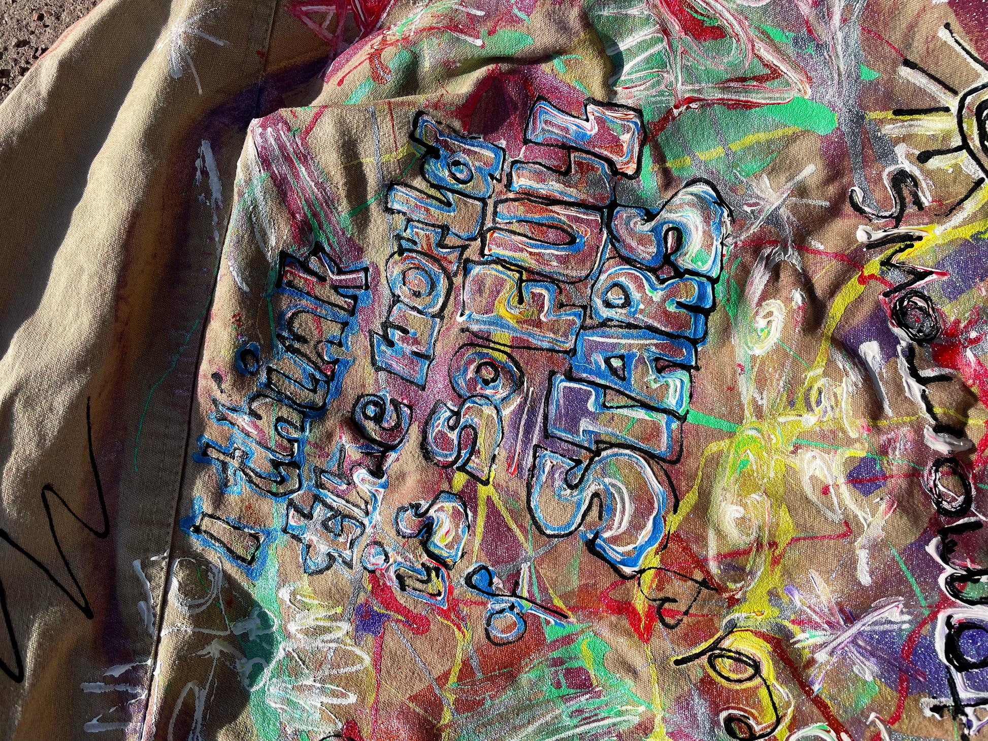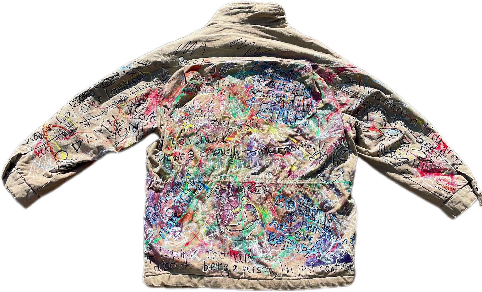 A wearable explosion of chaotic thoughts and cosmic wonder “This lil world is so Full of Stars” is more than a jacket—it’s a tapestry of fleeting moments, existential musings, and bursts of raw, unfiltered expression.