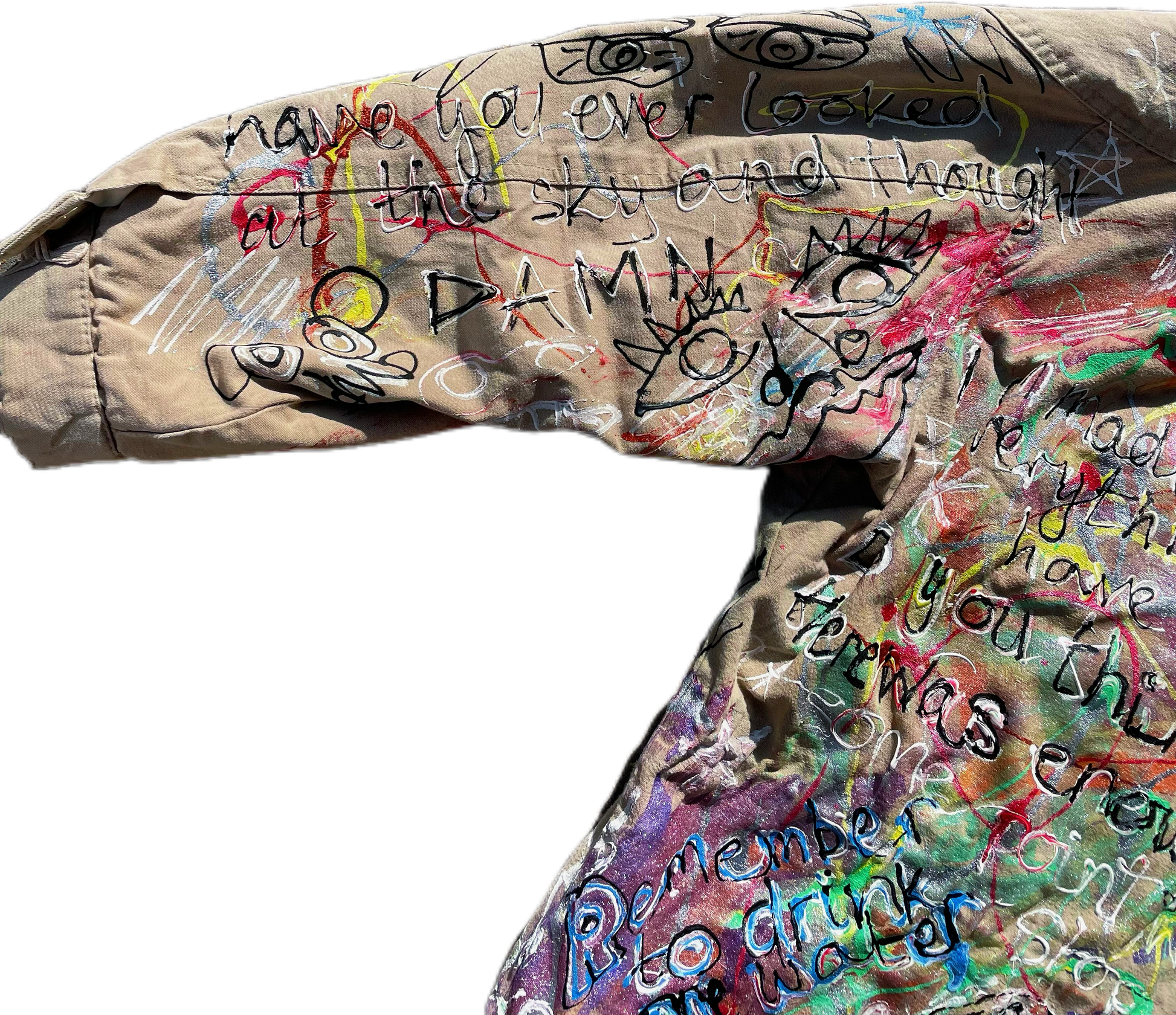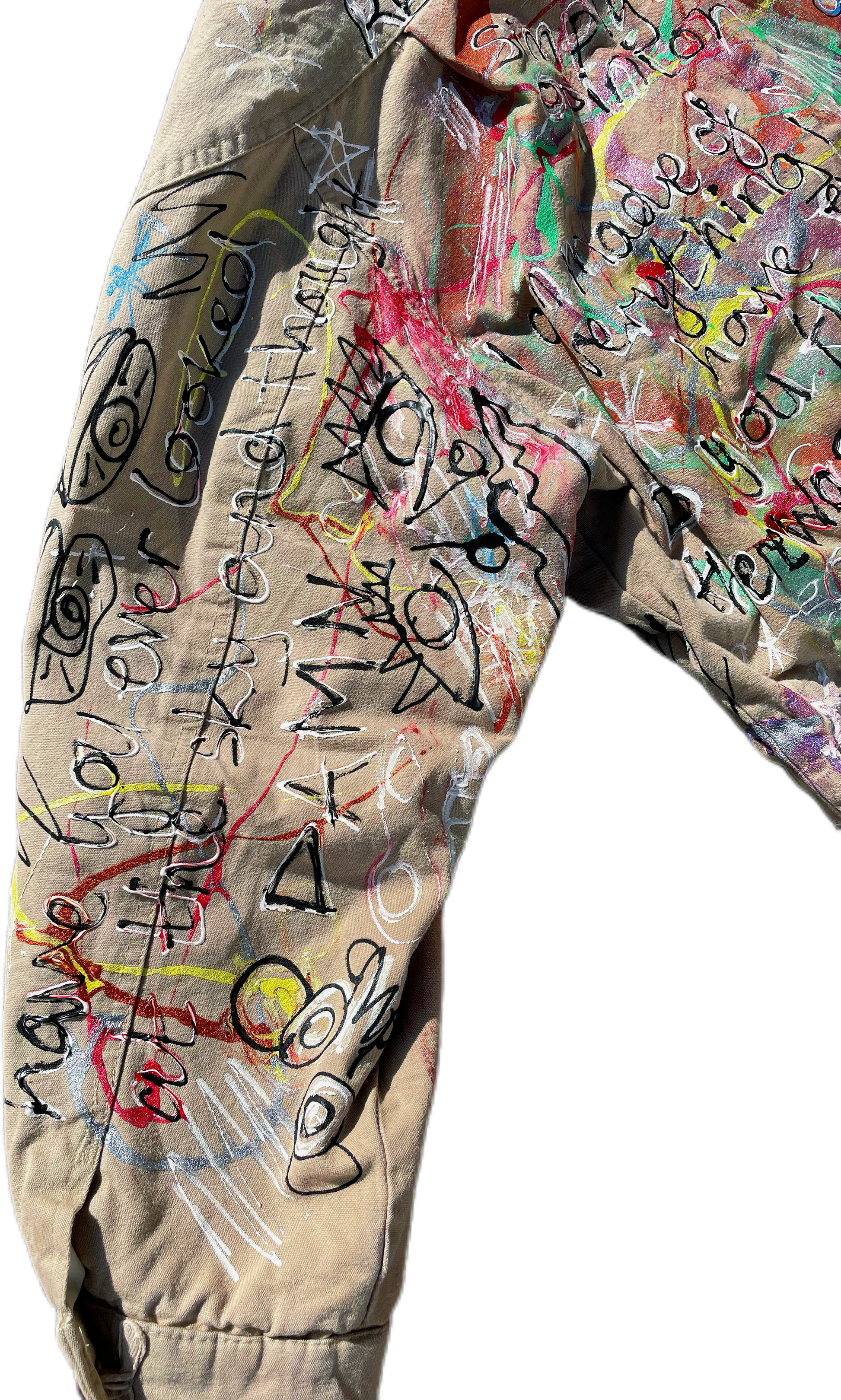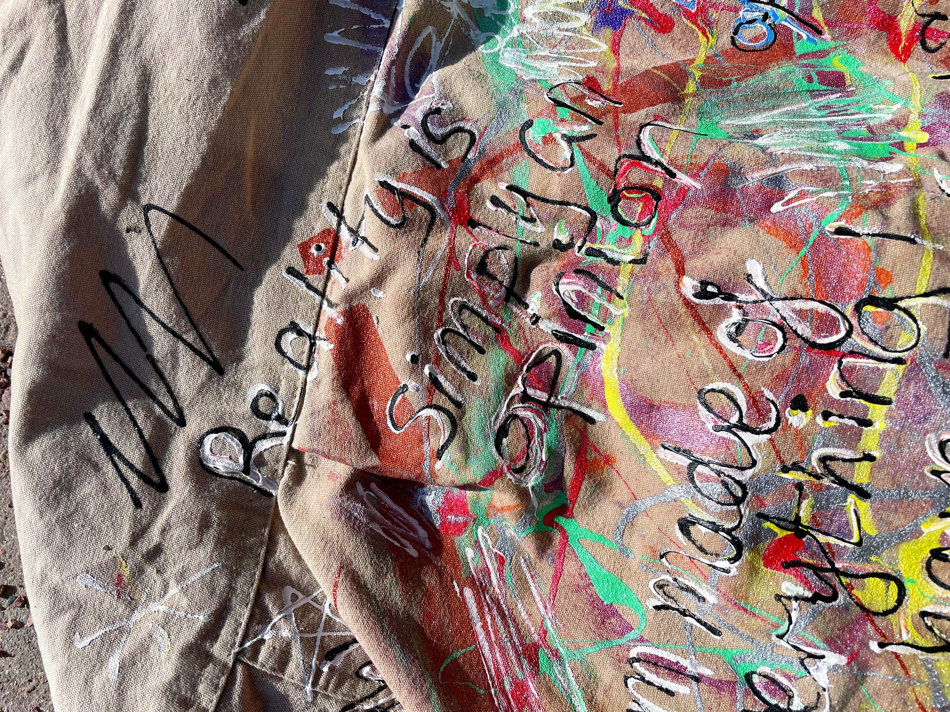 Hand-painted and embroidered over a distressed military-style canvas, this one-of-a-kind piece features layers of overlapping colors, abstract sketches, and text fragments that read like a stream of consciousness unraveling in real time. Phrases like “I think the world is so full of stars” and “Somewhere, a tiny frog is having their best day” sit alongside surreal faces, shimmering textures, and erratic brushstrokes—capturing the contradictions of a mind oscillating between cosmic awe and quiet introspection.