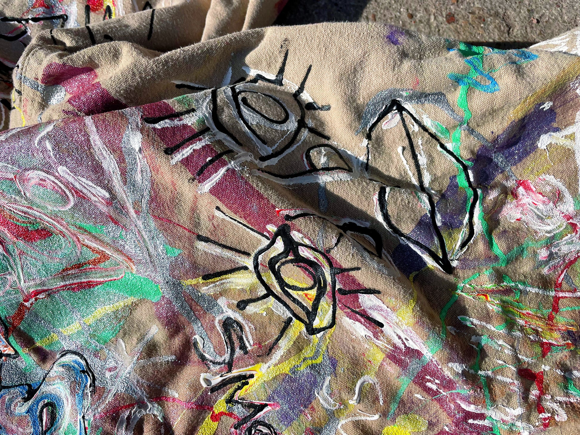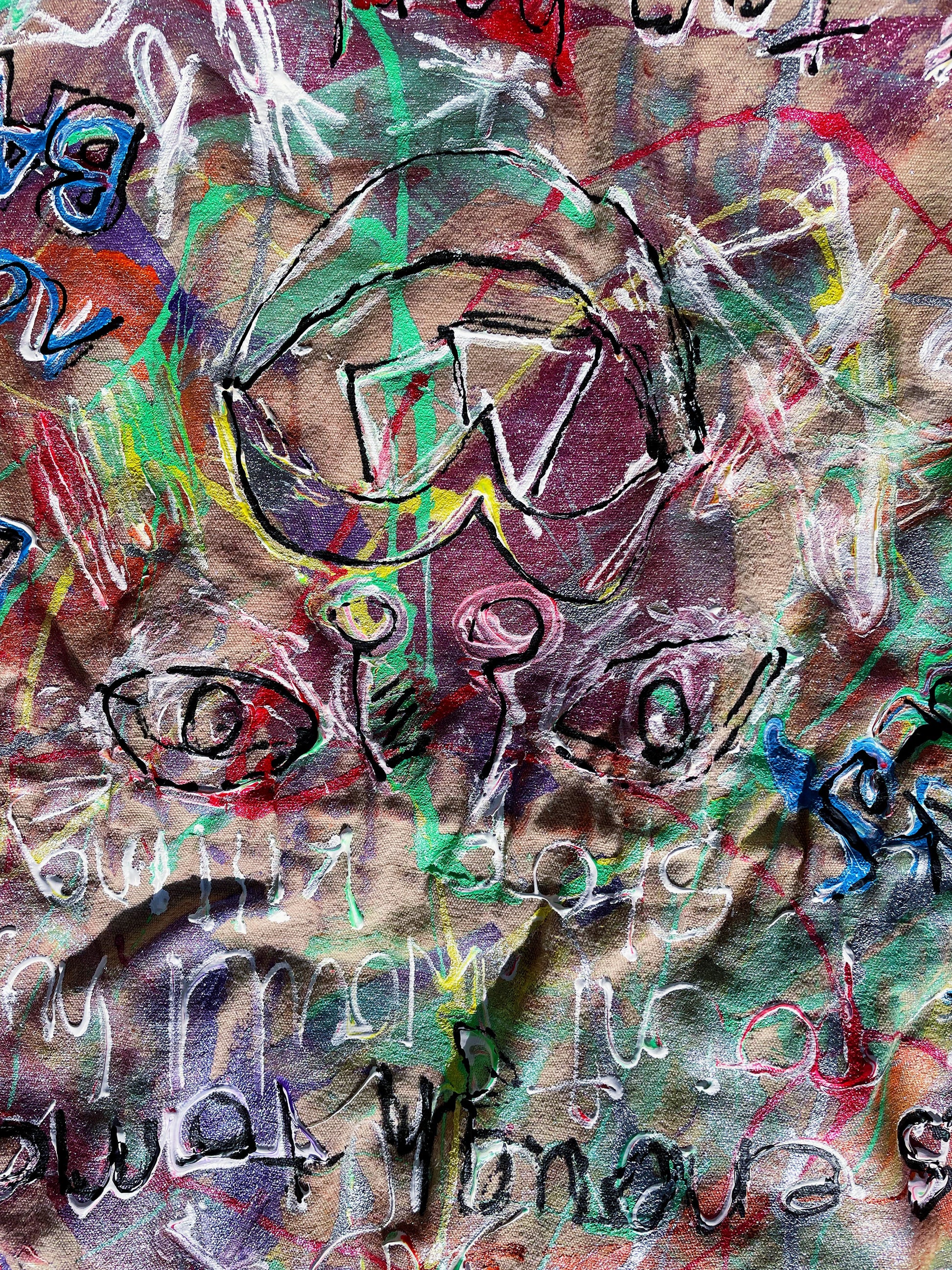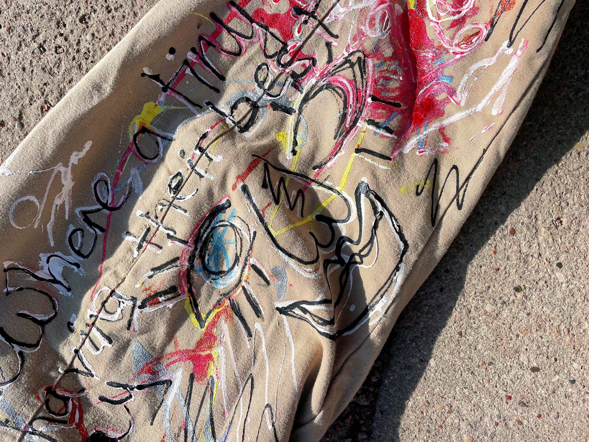 Hand-painted and embroidered over a distressed military-style canvas, this one-of-a-kind piece features layers of overlapping colors, abstract sketches, and text fragments that read like a stream of consciousness unraveling in real time. Phrases like “I think the world is so full of stars” and “Somewhere, a tiny frog is having their best day” sit alongside surreal faces, shimmering textures, and erratic brushstrokes—capturing the contradictions of a mind oscillating between cosmic awe and quiet introspection.