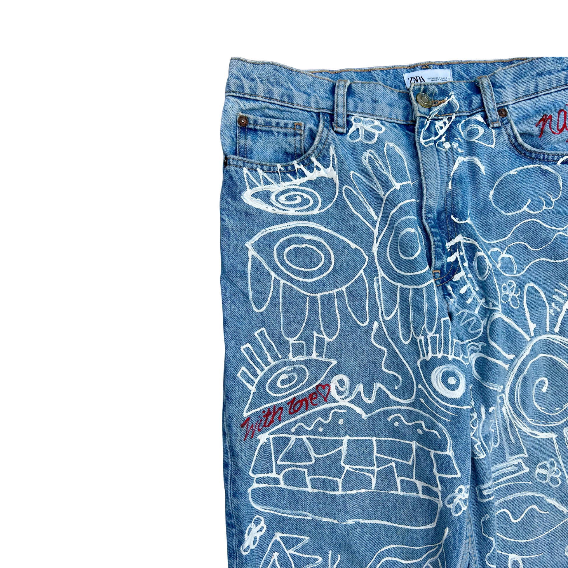 These wide-leg denim jeans are covered in an intricate web of white line drawings that flow across the fabric like a visual stream of consciousness. Abstract faces, swirling patterns, geometric shapes, and cryptic symbols create a hypnotic all-over design that demands a closer look.